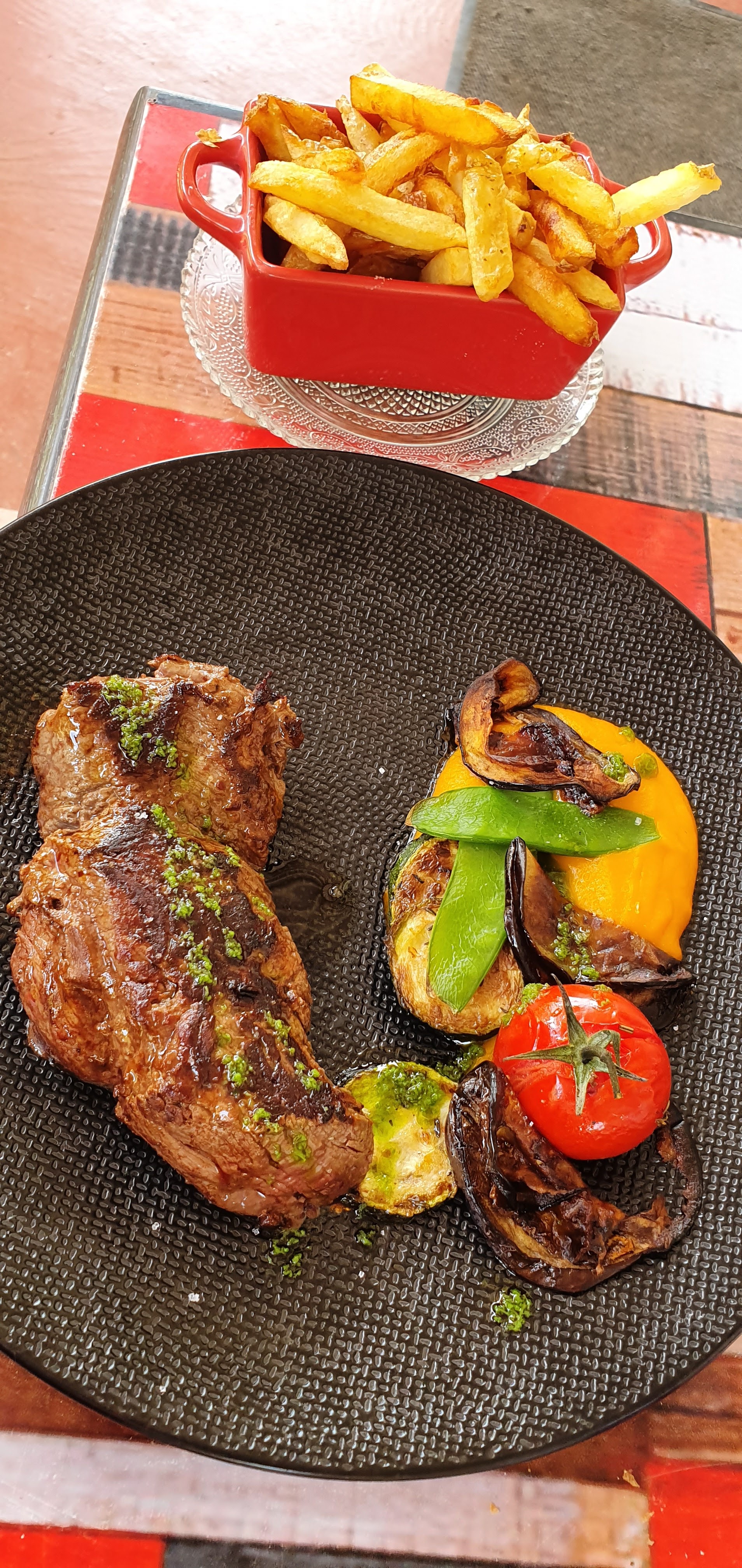 Lieu sympa. Plusieurs menus disponible de 17 à 30 euros. Les plats sont raffinés et bien présentés. J’ai trouvé les frites maison un peu « grasse » avec pas mal de résidus au fond du ramequin. Mais bon. C’était bon. La viande était savoureuse et très tendre. Un régal. La sauce du chef n’est qu’une sauce au roquefort. Je m’attendais un peu à autre chose. Un petit moment de plaisir.