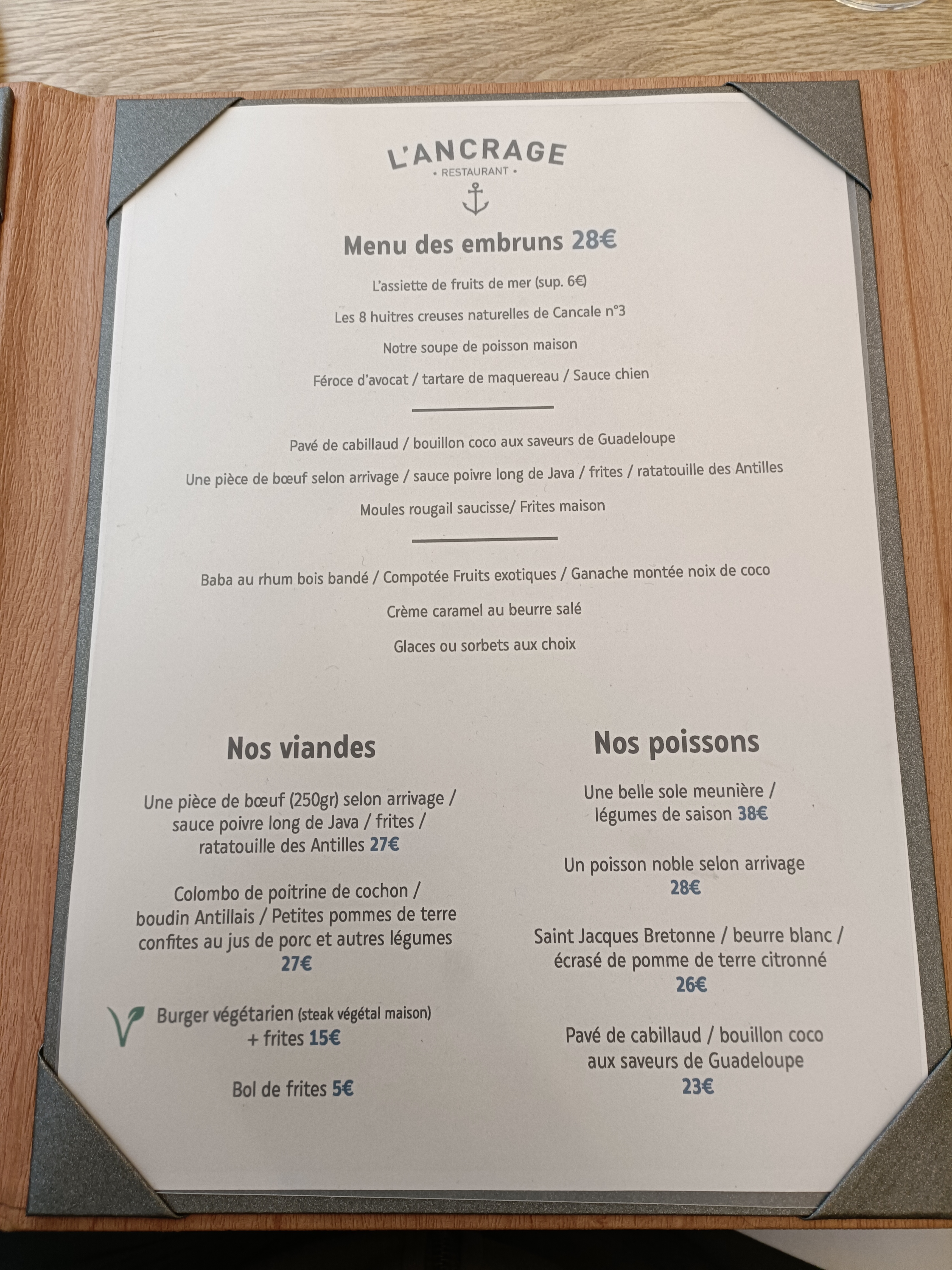 Nous avons passé un bon moment à L’ancrage. Le plateau de fruits de mer était très bon, tout comme le plat de poisson (cabillaud très bien cuit avec un très bon accompagnement et assaisonnement), et le porc très fondant. Les desserts restent assez basiques. La gérante est gentille mais un peu trop empressante. Néanmoins, nous avons apprécié notre passage dans ce petit restaurant très sympathique.