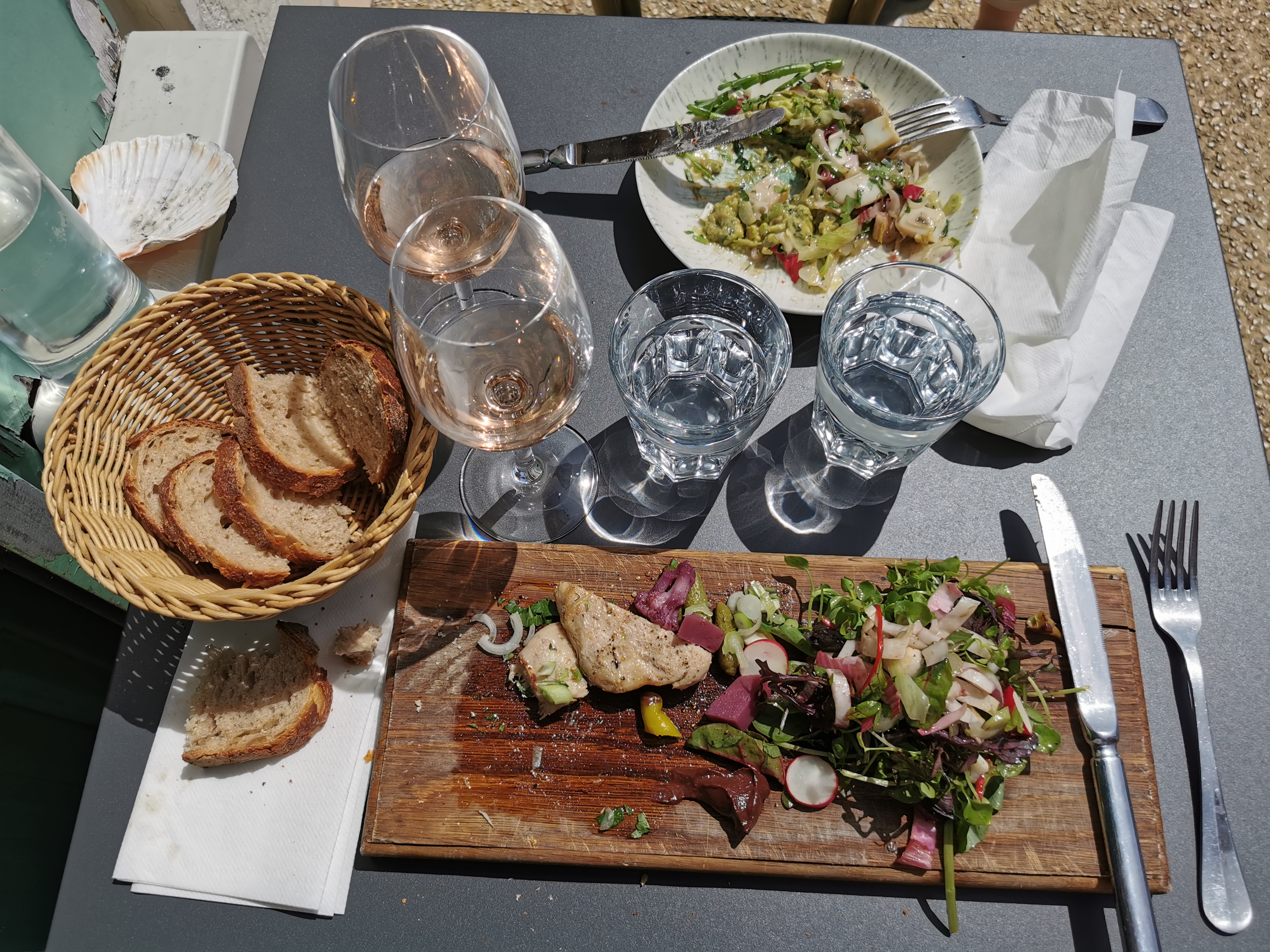 Dîner en terrasse (malheureusement un peu bruyant à cause d’enfants en patinette) mais repas excellent avec des plats originaux et goûteux
