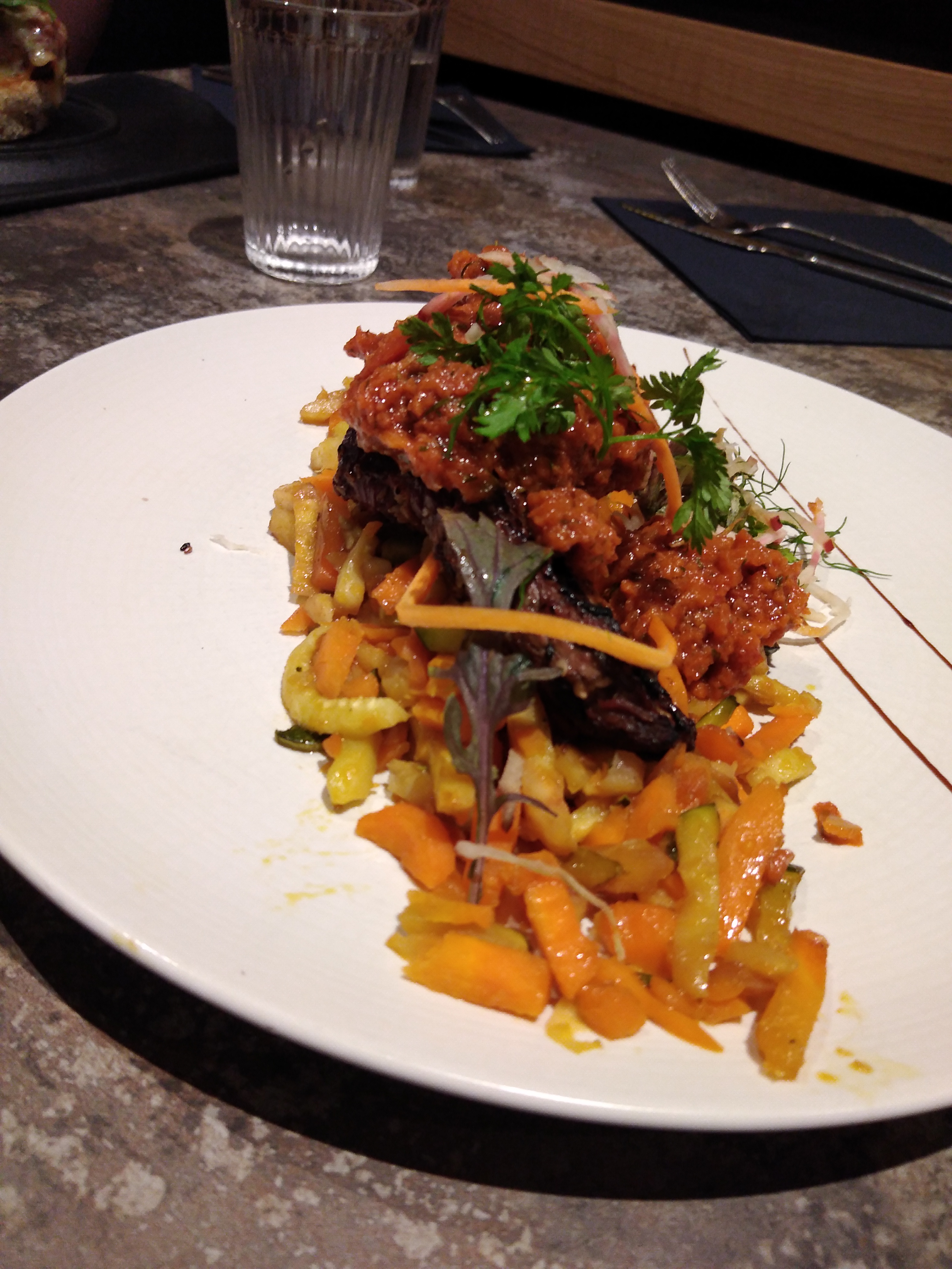 Oh la la !!!! Que de bonheur ! Je vous le recommande plus que vivement! Accueil sympathique et chaleureux, mise à table directement. Je suis donc attablée quand la serveuse vient me voir en me disant un franc 'Bonjour, et tout d'abord bienvenue! Que puis-je vous servir ?' Comme entrée, j'appelle ça du nec plus ultra ! J'ai pris un Tataki de bavette Angus..... Merci au chef ! Moi qui ne mange du steak qu'avec de la béarnaise.... J'eus tout aussitôt oublié l'existence de cette sauce ! Un voyage d'excitation des papilles ! J'ai demandé cette viande bleue saignante, car je ne suis jamais d'accord sur le bleu ou le saignant des restaurants... Et bien, je l'ai reçue bleue saignante ! À propos du saignant... Vous n'aurez pas de marre de sang dans votre assiette ! Non non! Je ne sais s'ils travaillent avec un boucher, mais leur viande est de qualité ! Et je ne vous parle même pas de la tendreté et du goût de la viande. Elle fond en bouche! Et pour les petits légumes façon wok..... Juste bien accompagnant, bon choix ! Moi qui rajoute toujours du poivre, point n'en fût ! Merci au patron, merci à la serveuse, merci au chef! Ne changez rien, bonne continuation ! Le seul bémol... Je vais être obligée de parler d'eux du d'y revenir !!!!