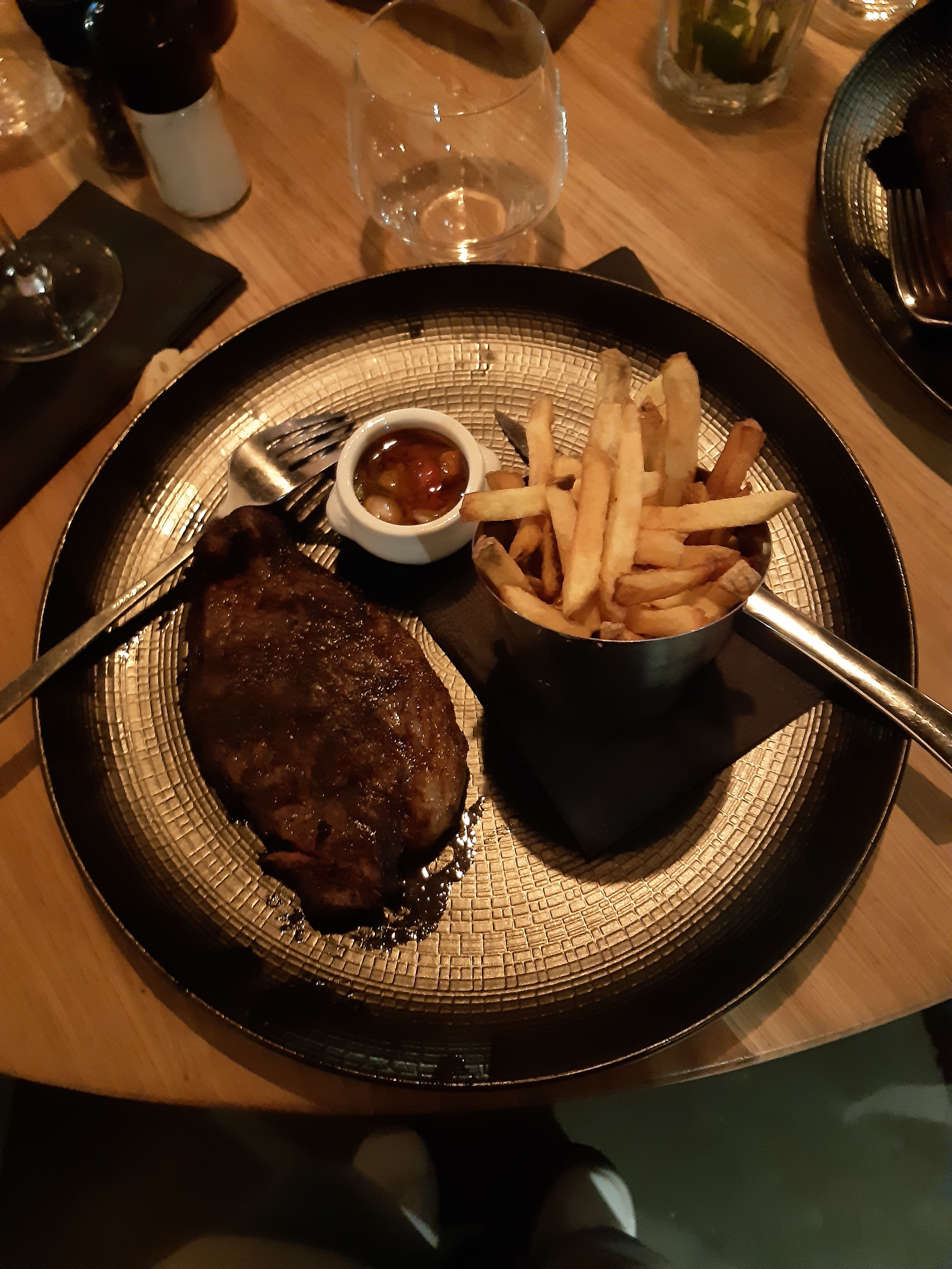 j'ai demandé une entrecôte à maturation de 21 jours, saignante, celle-ci est arrivée trop cuite avec un gout de brûlée, pas de pain, pas de conditionnement, et d'eau sur la table, il faut sans cesse réclamer. La salade verte que j'ai commandé est restée sûrement chez le maraîcher car elle n'est jamais venue. La terrasse est sans aucun éclairage, très pratique pour lire la carte et diner, beaucoup de personnels mais incompétents, pas à l'écoute du client... Je ne recommande pas du tout ce restaurant.