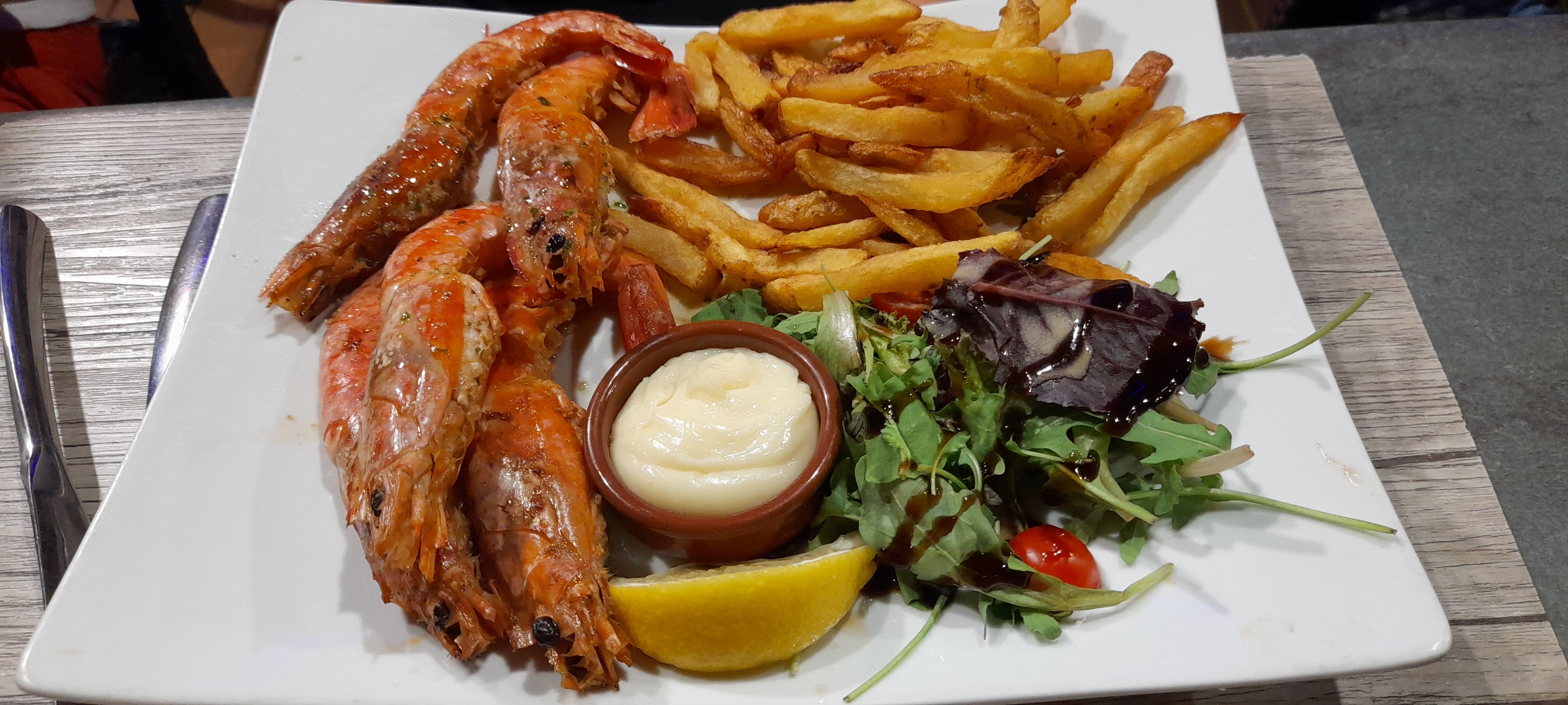 Je suis venue manger dans ce restaurant en choisissant le menu à 19€ (entrée + plat + dessert). Agréablement surprise vu le prix. Entrée : assiette de charcuterie, simple mais efficace. Plat : gambas flambées, très bonnes, fermes, cuites juste comme il faut. Les frites sont très bonnes, croustillantes. Dessert : Panna cotta maison aux fruits rouges, dessert bon. Nous avons choisi une bouteille de vin rouge pour accompagner. Niveau prix, correct. Service rapide et excellent accueil.