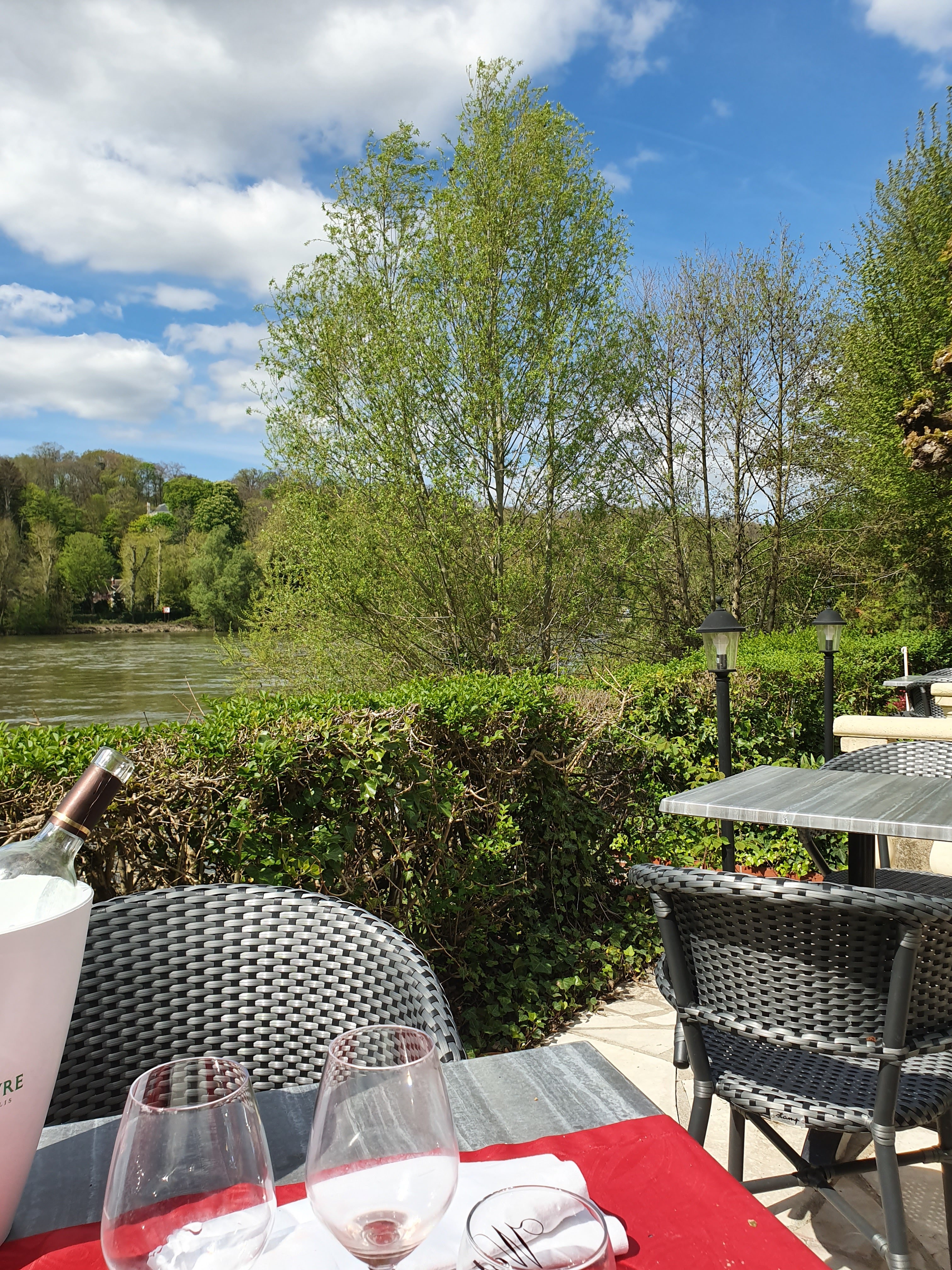 Accueil agréable, terrasse en bord de seine très agréable. Si on s'arrête là, on met 5 étoiles, mais il faut évoquer le repas. Déjeuner avec la formule dégustation à 44€. Globalement satisfaisant mais rapport qualité prix assez décevant. Commençons par le positif. Tomate farcie à la chaire de crabe. Rien à dire. C'est bon. Belle quantité de crabe et c'est agréable gustativement. Camembert chaud accompagné d'une compotée poires/oignons compensant le gras du fromage. Vinaigrette de la salade excellente, mais est ce une entrée pour un menu dégustation? Suis dubitatif. Les plats, ris de veau/morilles et filet de sandre/st jacques. Quantité et qualité au rdv. Un peu léger au niveau morille en quantité et au niveau gustatif (peu de goût). Mais la déception vient des accompagnements. Flan de légumes bcp trop salé.... Et j'en suis loin d'être un amateur.... Je préfère 3 ou 4 légumes frais dans mon assiette. Un gratin de pdt correct, sans plus. Et un morceau de courgette avec une quenelle de purée pdt/courgettes il me semble, là aussi correct. Fromages agréables. Desserts traditionnels mais bons, ici, fruits sur un lit de mascarpone, et crème brûlée à la badiane. Nous avons passé un agréable moment mais je suis toujours un peu déçu quand le menu est inférieur à la qualité du cadre. Globalement bon mais j'y trouve un manque de créativité et de plat signature, surtout dans le menu dégustation. Impression de manque de risque, dommage. En conclusion, un bon moment mais avec qqs déceptions.