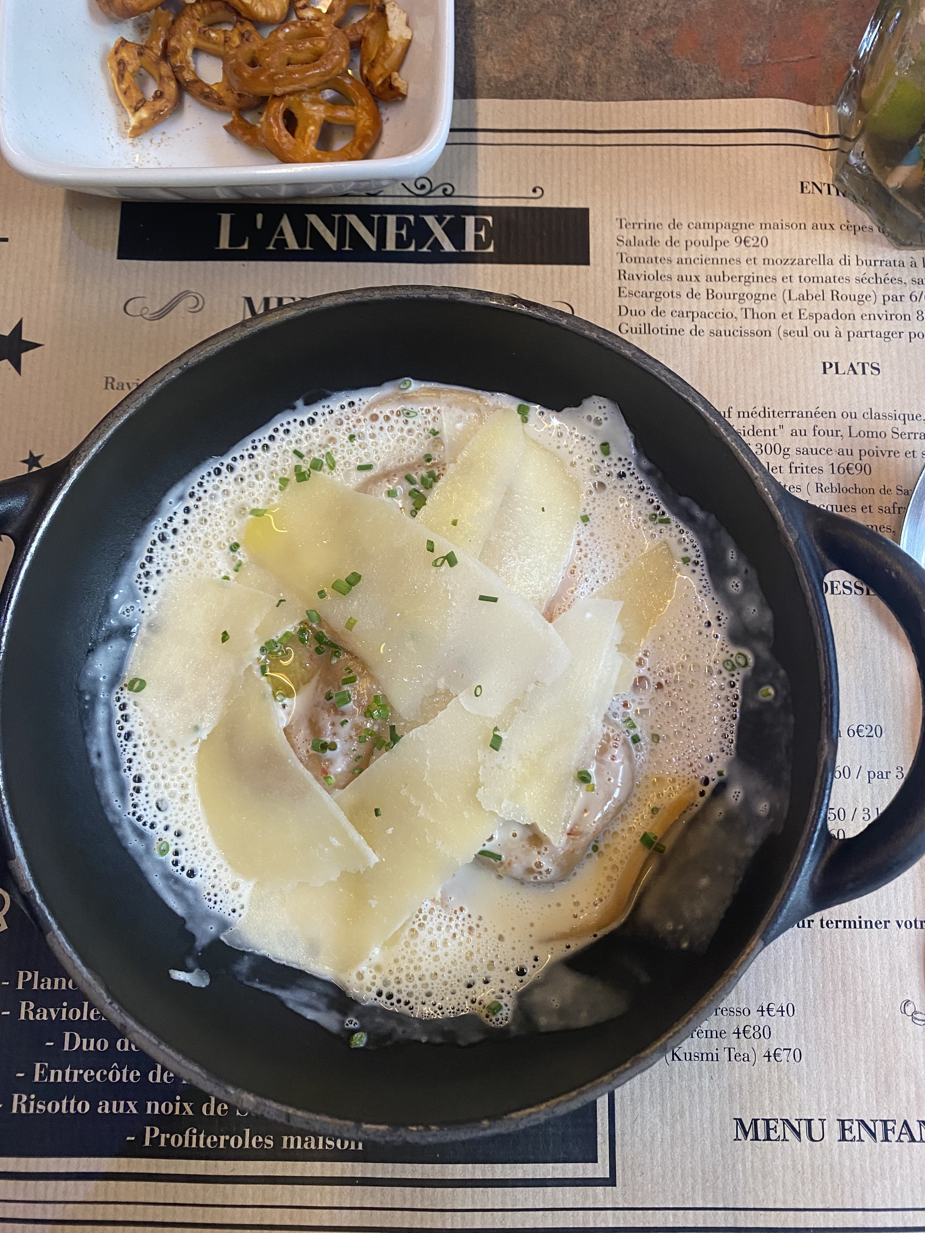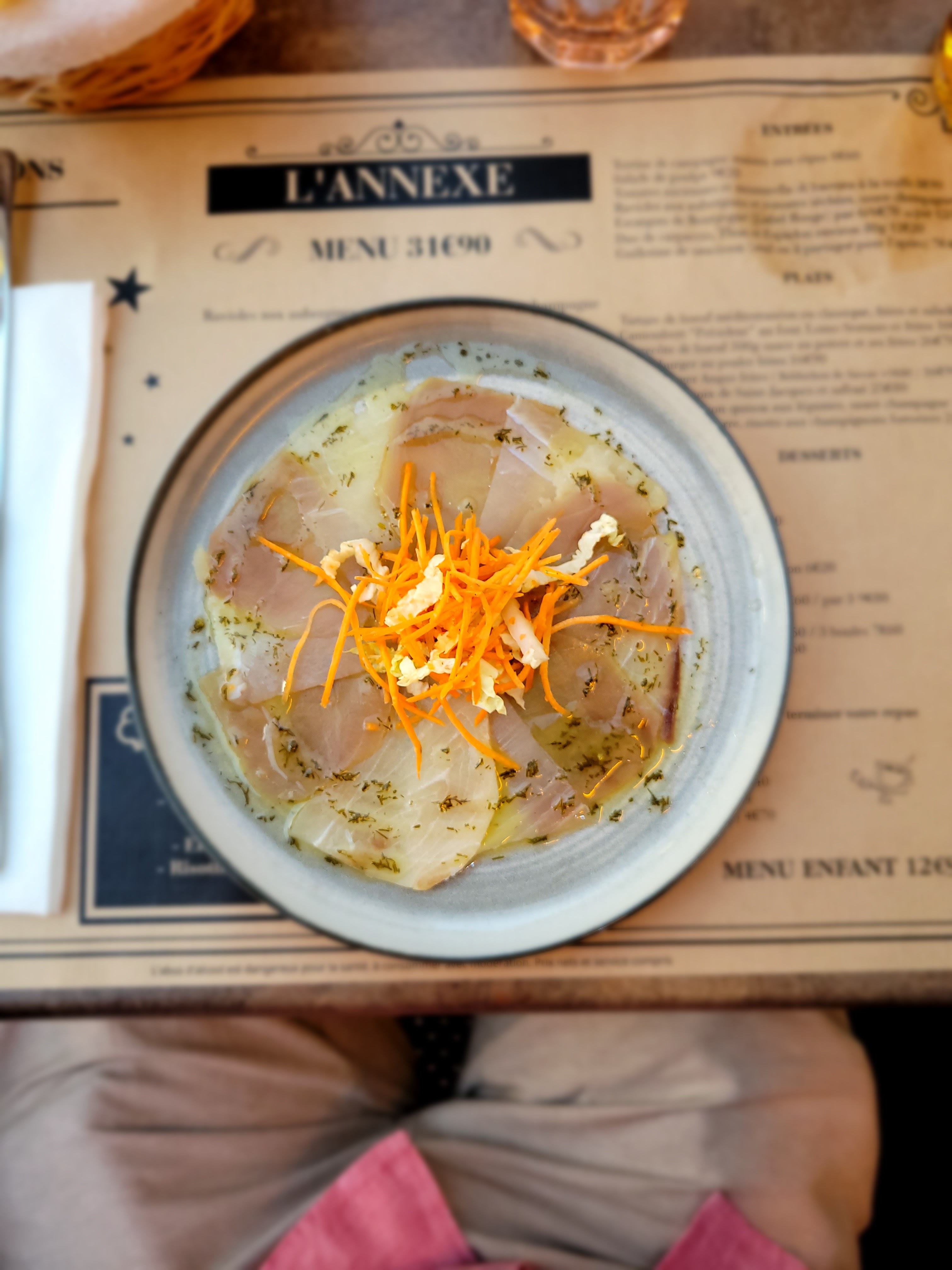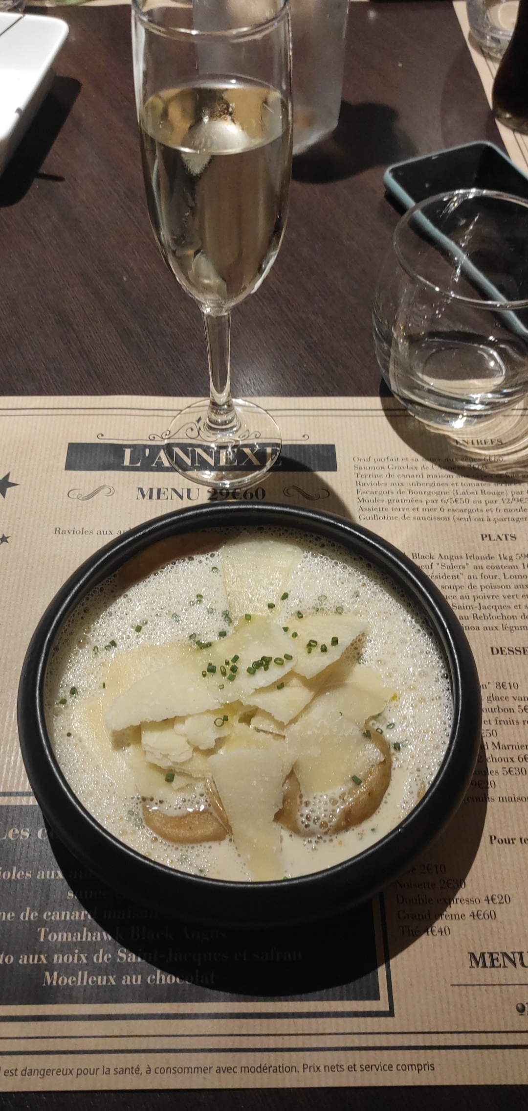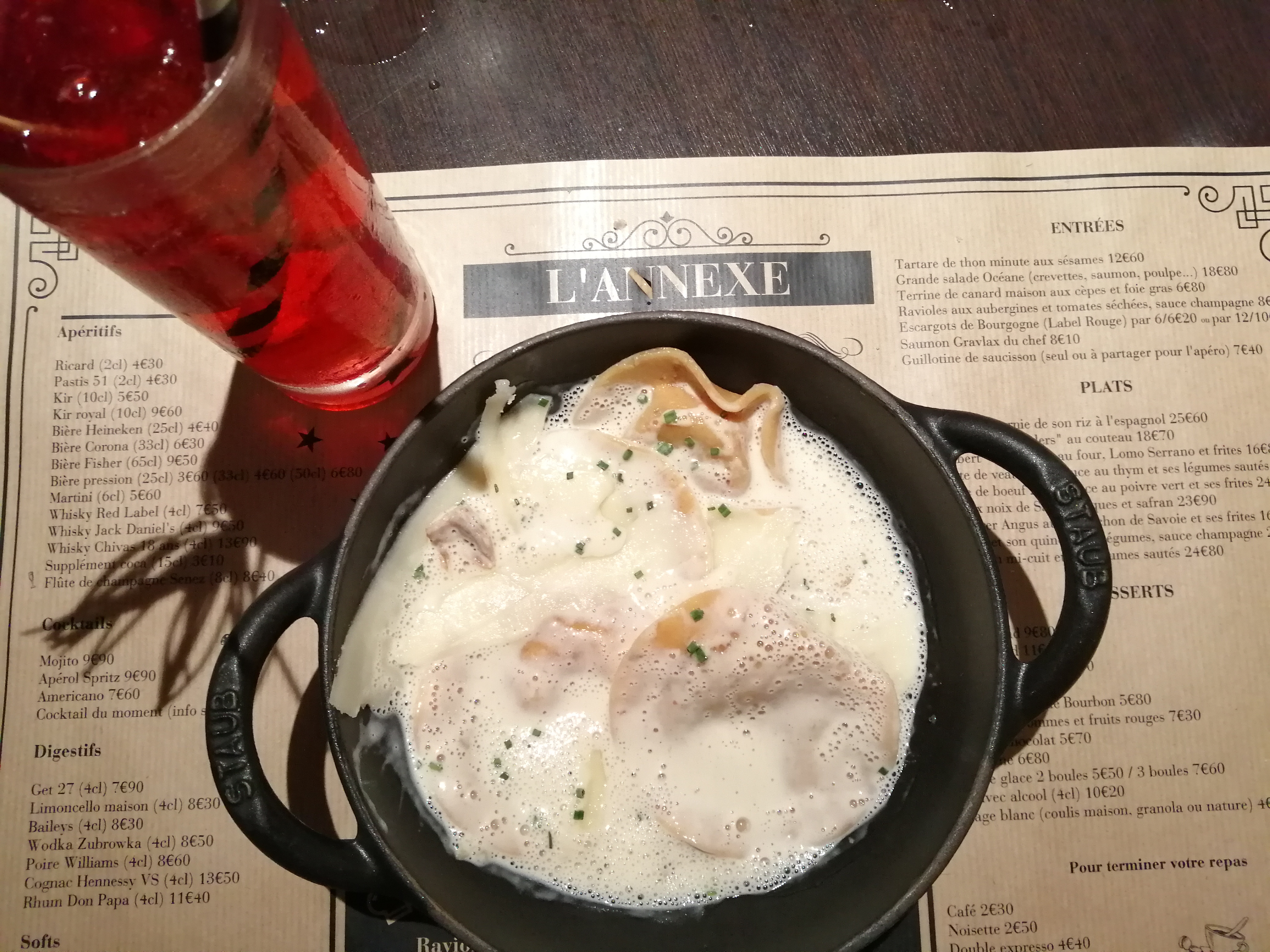 Nous avons dîné à L'Annexe pour la deuxième fois et toujours en faisant un voyage vers l'Espagne (la première c'était l'année passée) et nous étions avec 2 amies, qui se sont régalés avec les plats suivants (prévus dans le menu dégustation de 28€): - Ravioles aux aubergines et tomates séchées, sauce champagne - Terrine de canard maison aux cèpes et fois gras - Saumon 《label rouge》Gravlax - Tartare de boeuf au couteaux, frites et salade - Filet de bar, risotto aux champignons forestiers - Onglet de veau, sauce romarin, purée maison et légumes sauté - Secret citron - Soufflé glacé mandarine impériale. Tous ça accompagné par un pichet de demi litre de vin rosé et une carafe d'eau. Prix tout à fait raisonnables, qualité des matières employées excellente, ambiance très agréable et sympathie/cordialité du staff au TOP! ! ! Quand j'ai salué le chef de salle pour présenter nos compliments, il m'a totalement surpris en disant qu'il se souvené de moi, parce que la première fois j'avais fait beaucoup de photos :D En Italie nous disons 《il n'y a pas le 2 sans le 3》. Ça veut dire que nous devrons revenir encore une fois de plus à L'Annexe! ! !