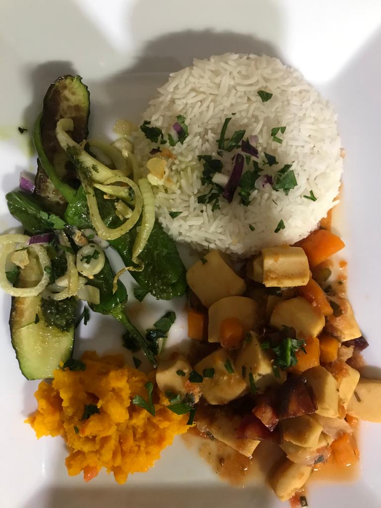 Chaleureux accueil, service pro et plat à emporter absolument délicieux ! Poulet à la citronnelle servi avec du riz blanc et une goûteuse ratatouille.