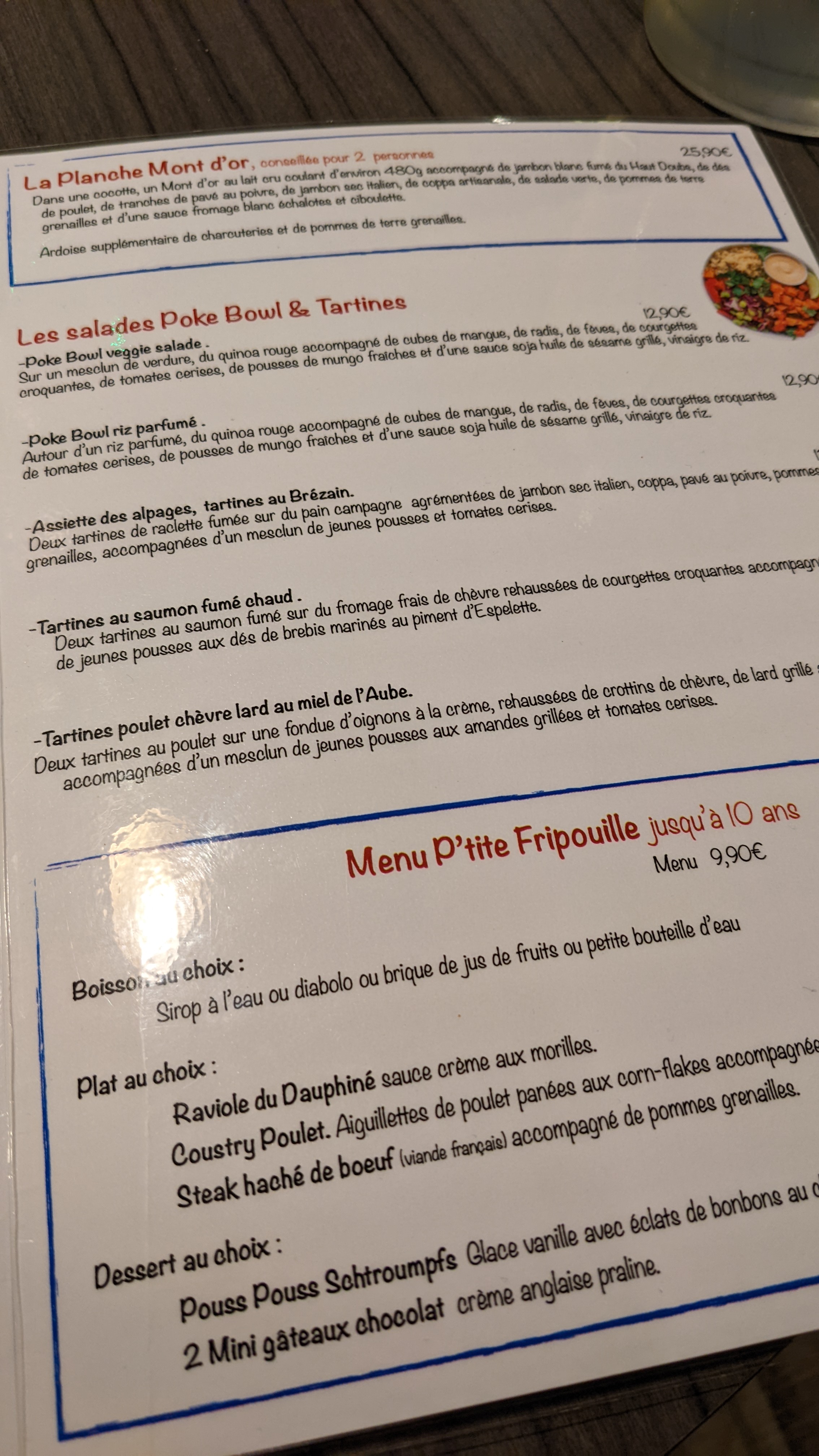 Une tres bonne soirée passé en famille . Les entrées et plats sont copieux , pour les personnes qui aime repartir sans avoir encore faim, je vous conseille l'assiette de mont d'or A partager. ( nous étions 4 à la partager ) Manquerait peut être une carte de glace pour alléger la fin de repas . Équipe très souriante ( derrière les masque 😷) vous vous contenterez du très beau regard de la serveuse 😉.