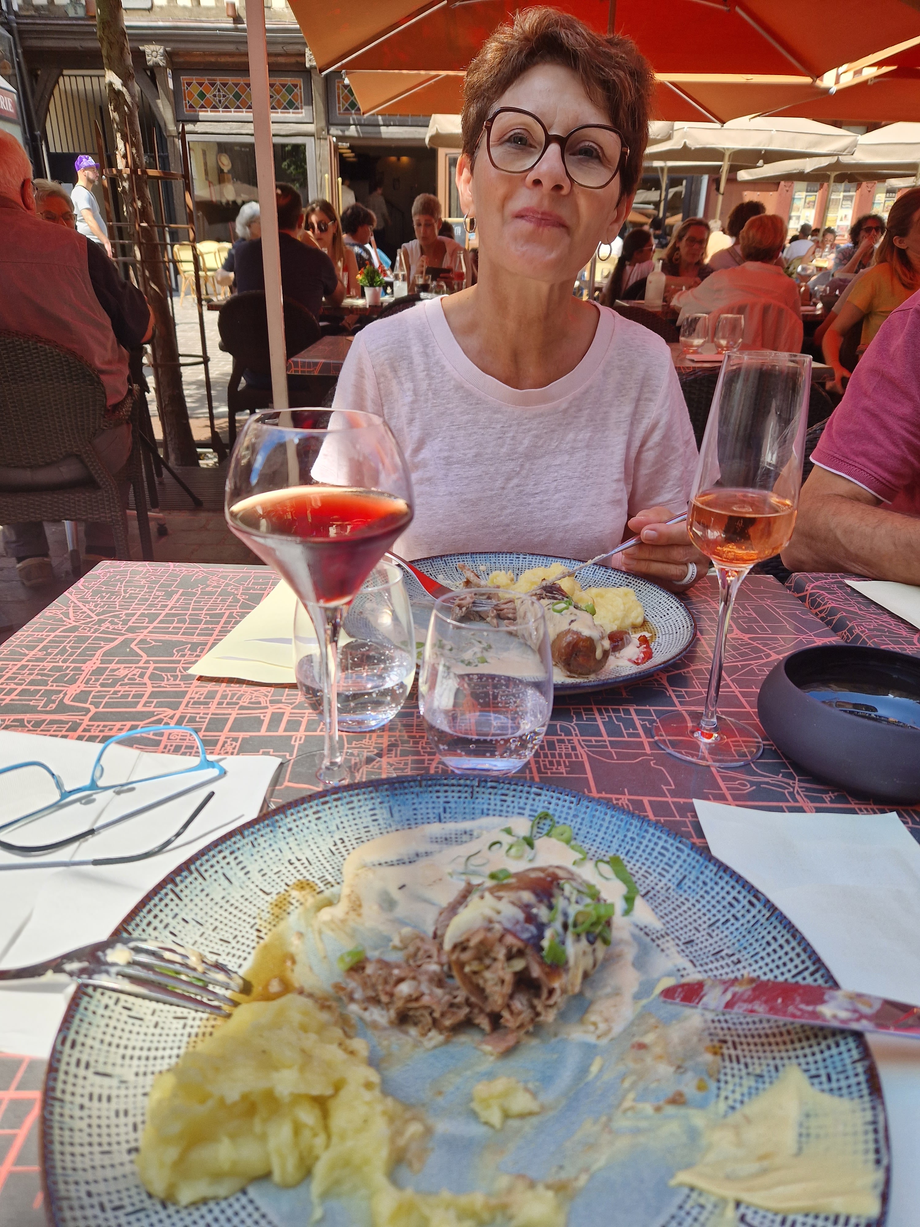 Nous avons déjeuné au Tout Simplement un midi en terrasse. Le cadre - avec la vue sur les maisons à colombages de Troyes - est très sympa ! Des plats régionaux sont proposés (comme l'andouillette à la sauce au Chaource). Je mettrais juste un bémol sur les accompagnements des plats, un peu simples à mon goût : frites et salade verte.