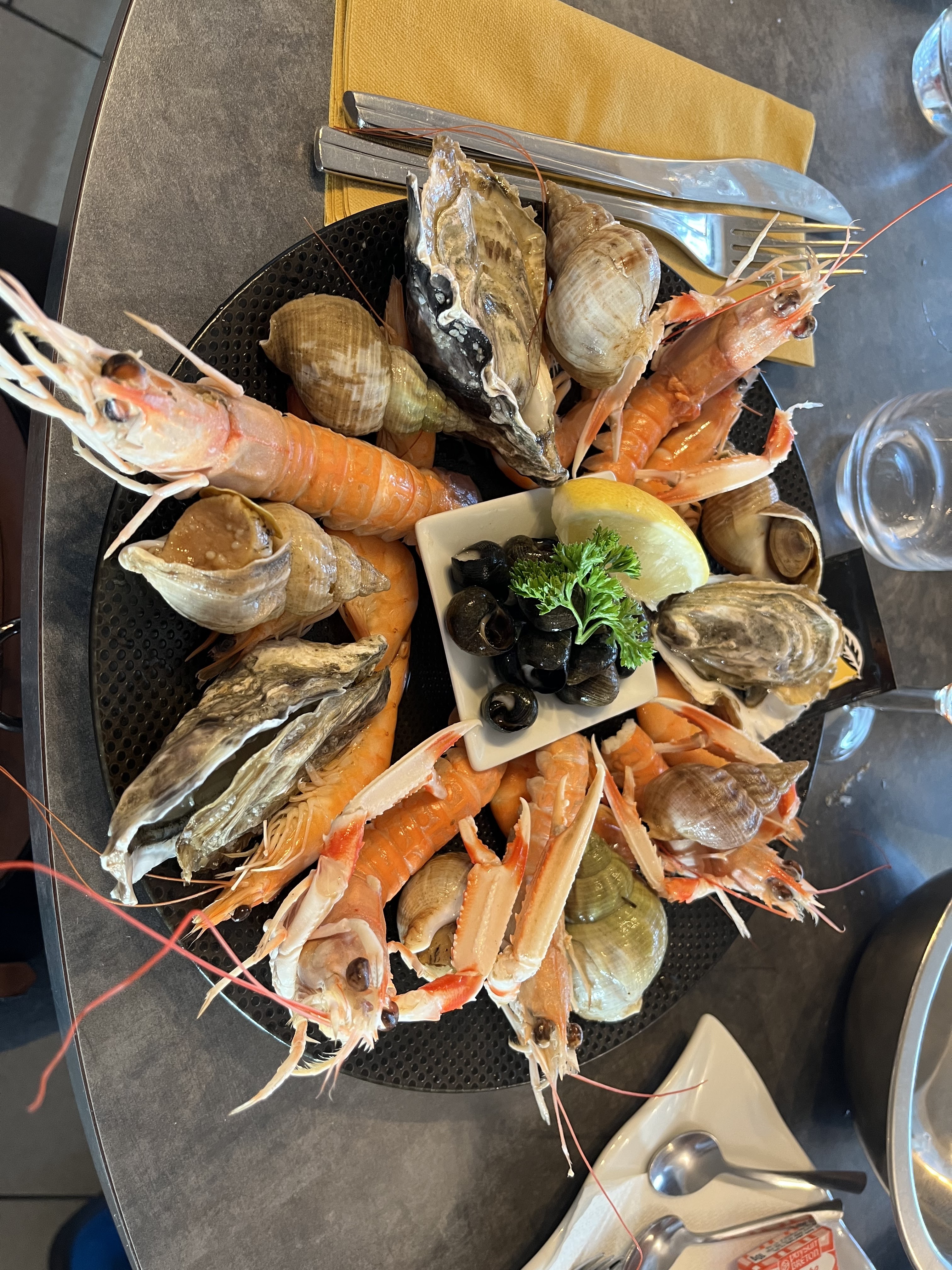 Personnel très agréable, nous avons été reçu après 13h Sans difficulté alors que le restaurant ferme à 14h. Fruits de mer très bons mais de petit calibre.Mayonnaise maison, terrine de raie un délice, bémol sur le poisson du jour cuit à l’eau ou vapeur sans saveur particulière rattrapée par sauce à la crème un peu trop rallongée à mon goût. Idem pour la sauce de la viande. Financier à la pistache très goutteux. Restaurant avec vue sur mer, bon mais sans surprise , nous avions pris le premier menu à 20,50 euros.