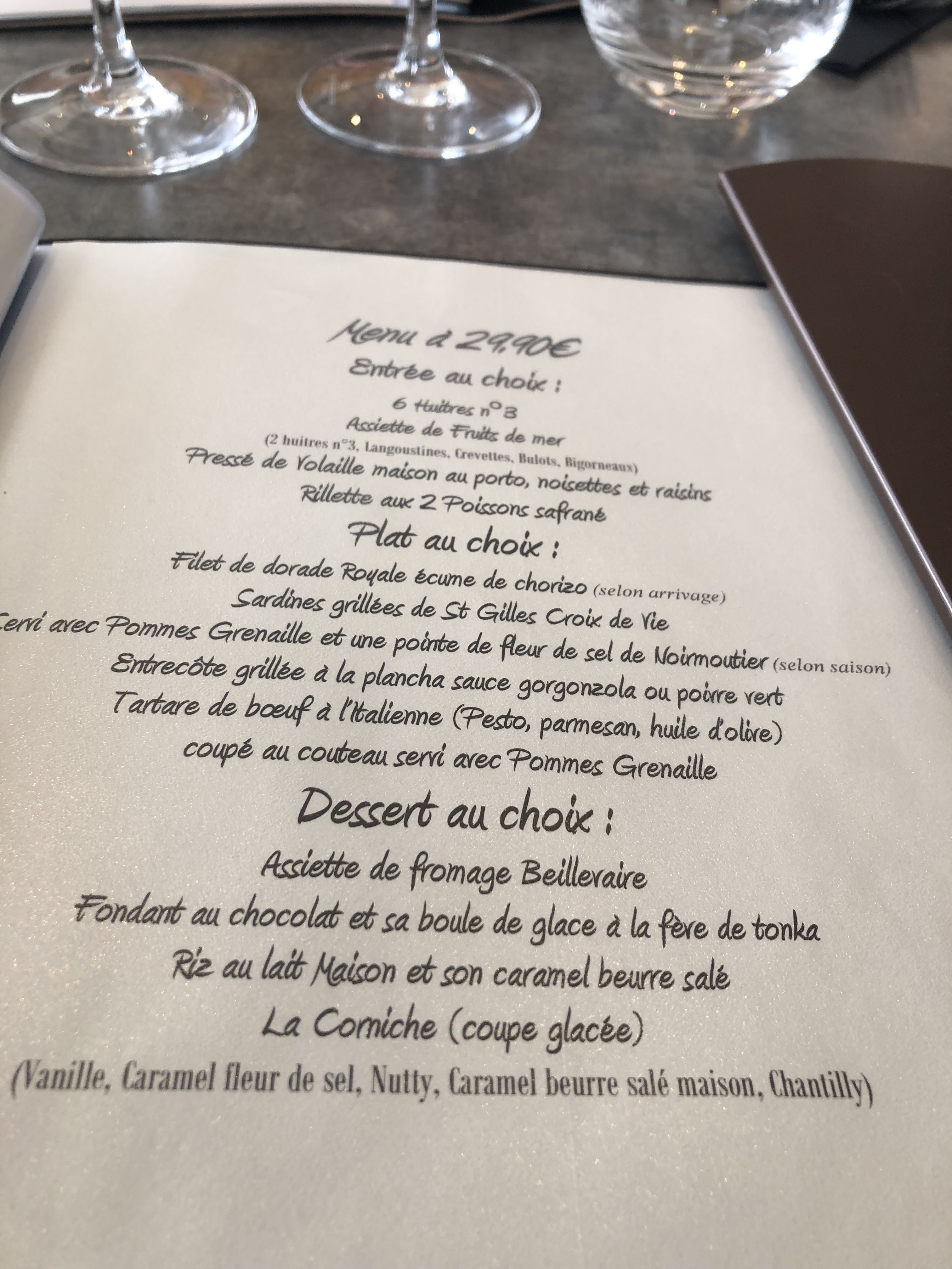 Très bon restaurant rien à redire sur la cuisine. En revanche, il est fort dommage, pour certains d'entre nous, d'avoir du terminer assiette ou boisson, en express, puique que le serveur s'est afferé à desservir (assiettes et verres avant que nous ayons tous terminés ! Nous avons vraiment eu le ressenti qu'il nous fallait quitter la table sans attendre...Nous avons été vraiment déçus de cela envers nos amis à qui nous faisions découvrir le restaurant et la Corniche de Bretignolles !!!