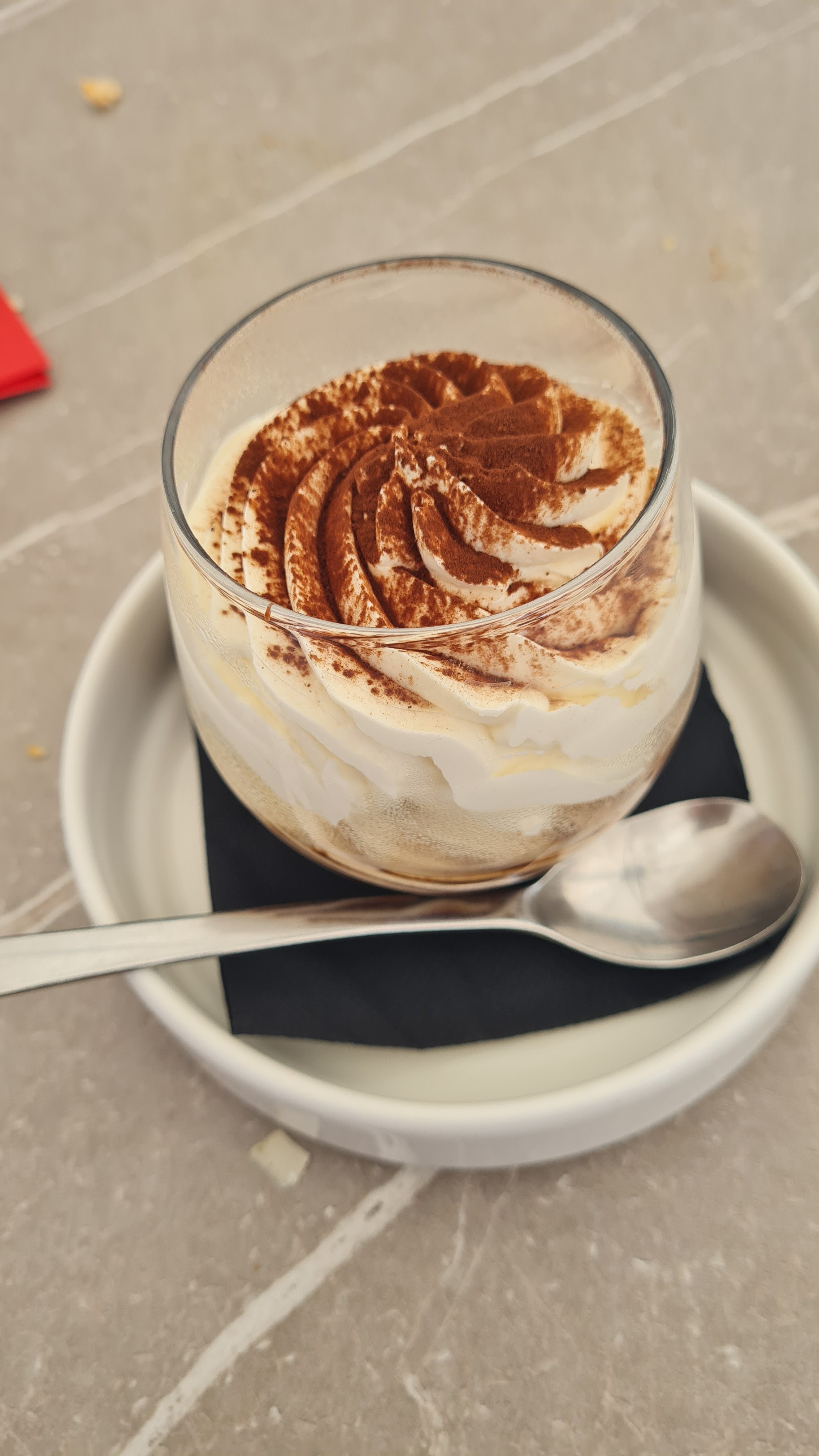 Le lieu est beau, ils sont en rodage et ça péche du côté du service Pas de cuillère pour mon baba , pas de serviette, et pour un resto italien j'aurai aimé un verre d'eau avec le café 😉 ( que j'ai demandé bien sûr) Maintenant pour ma préférence (ça c'est mon goût) Un café avec du Robusta bof.. Et le tiramisu bien trop liquide Voilà maintenant on peut que s'améliorer Bon vent à tous
