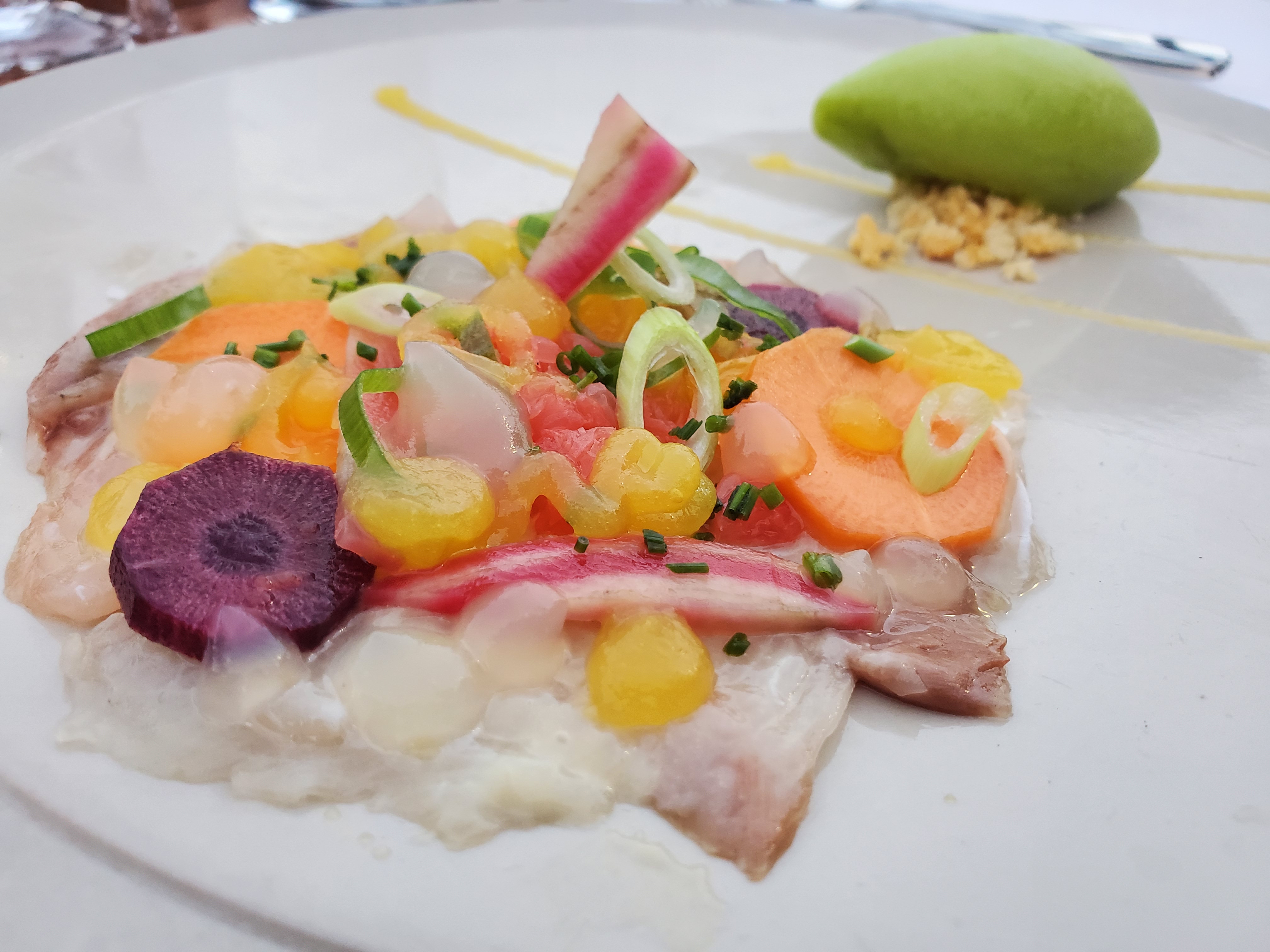 Terrasse agréable mais tables un peu serrées par temps de covid Carpaccio de mérou a la betterave qui dominait trop le goût et poulpe au miel fondant maïs accompagnement très léger Bien sans plus