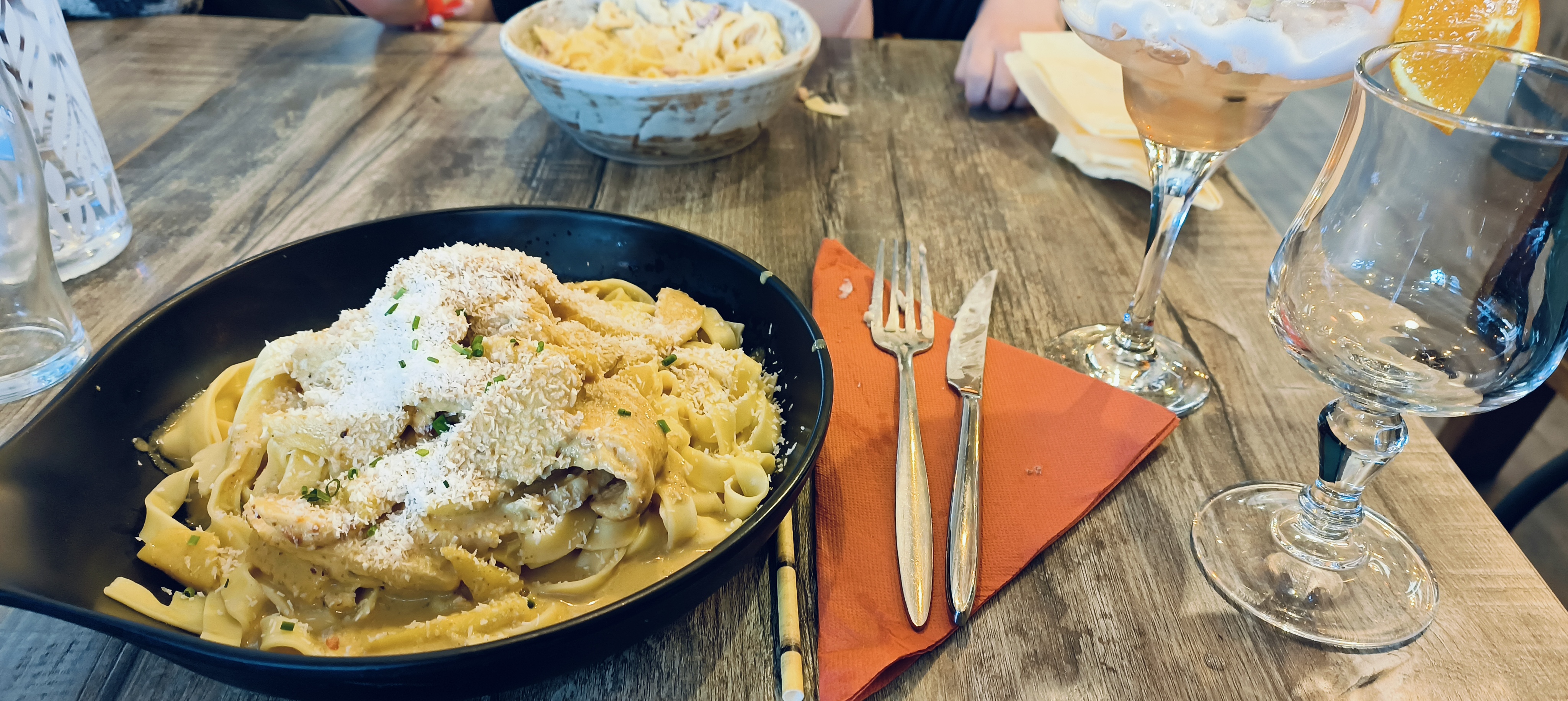 Accueil sympathique, le restaurant est vraiment très joliment décoré. Nous sommes 4 et commandons 2 Burger, un menu enfant et des tagliatelles carbonara. Les frites maisons sont vraiment excellentes et le pain maison des burgers délicieux. 2 bémol : la cuisson des steak haché des burgers demandées saignantes, ont été servi bien à point... Le burger rossini est très sucré, ils mettent de la confiture sur le pain ce qui gâche un peu le goût.
