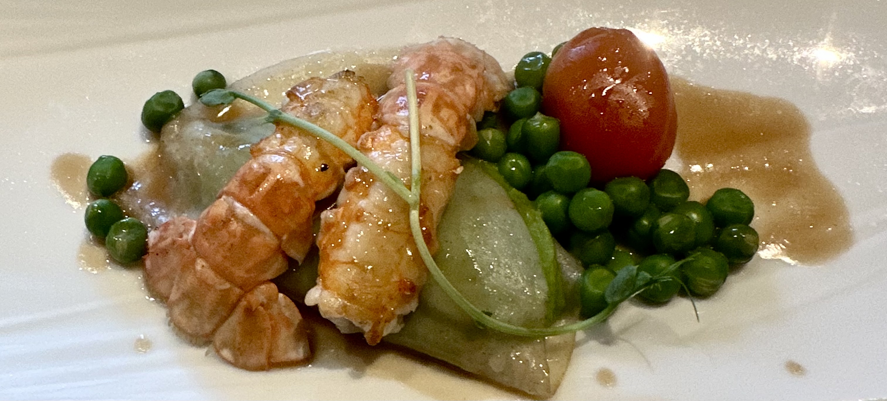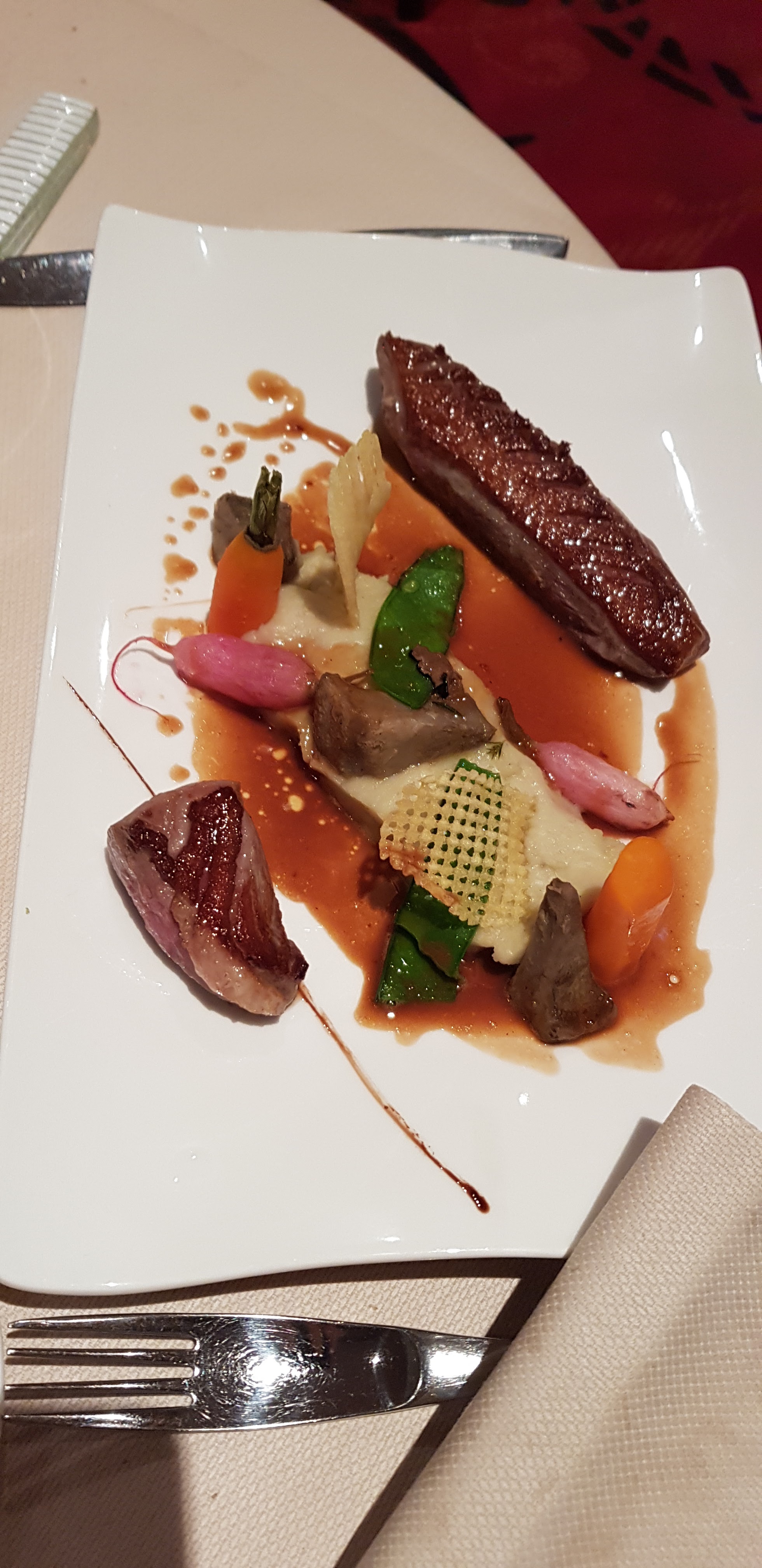 Très déçue par le gravelax - betteraves super fade, le ris de veau est bien cuit mais l ensemble de l assiette est trop sucré et ai goûté le homard qui n avait que le goût de la fondue de poireaux. Dommage