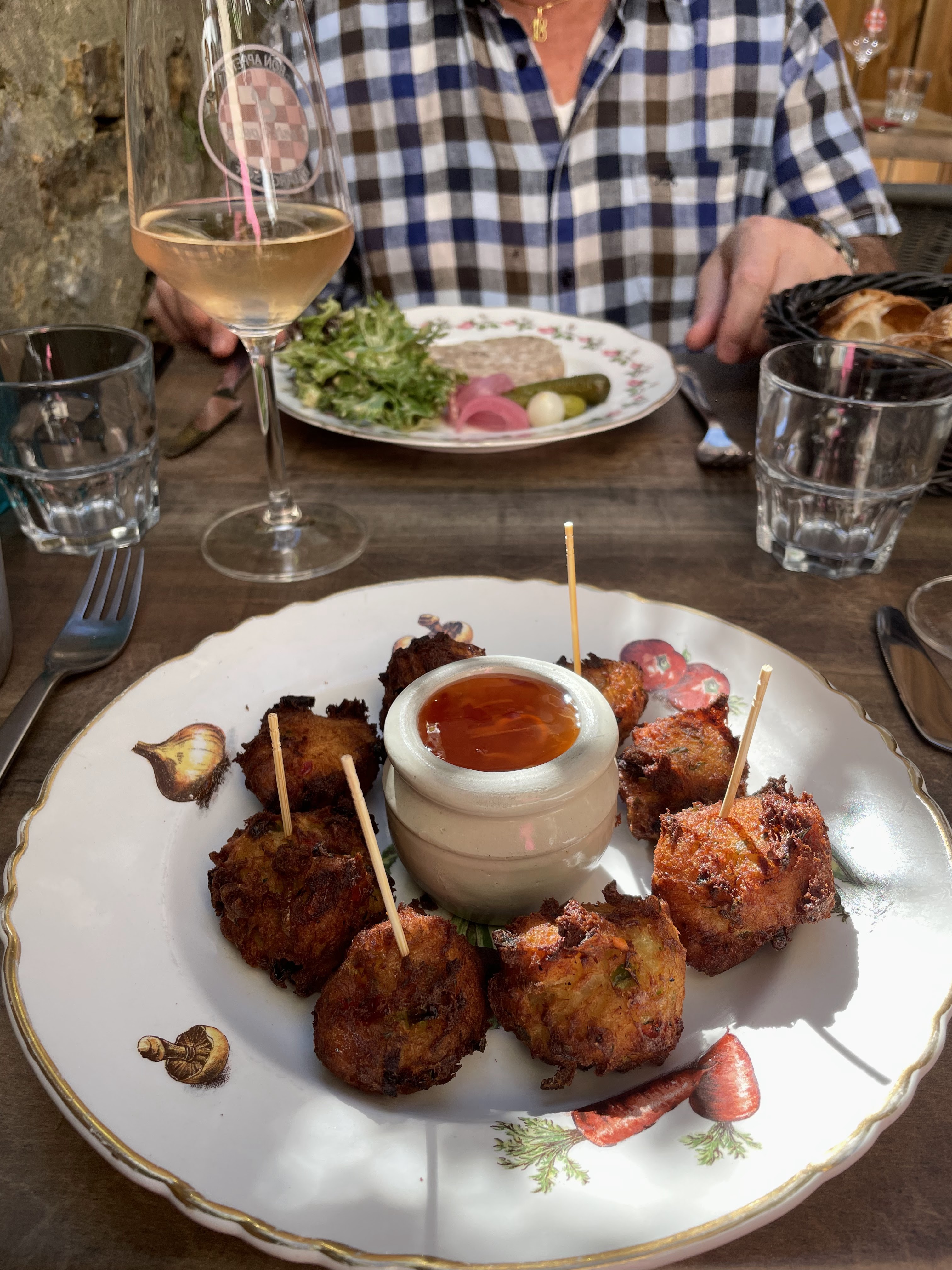 La cour interieure ensoleillée est charmante et la serveuse très aimable. Nous avons pris les Ravioles au Comté et le Sabodais lyonnais à la Cervelle de Canut. Tous deux étaient très bons.