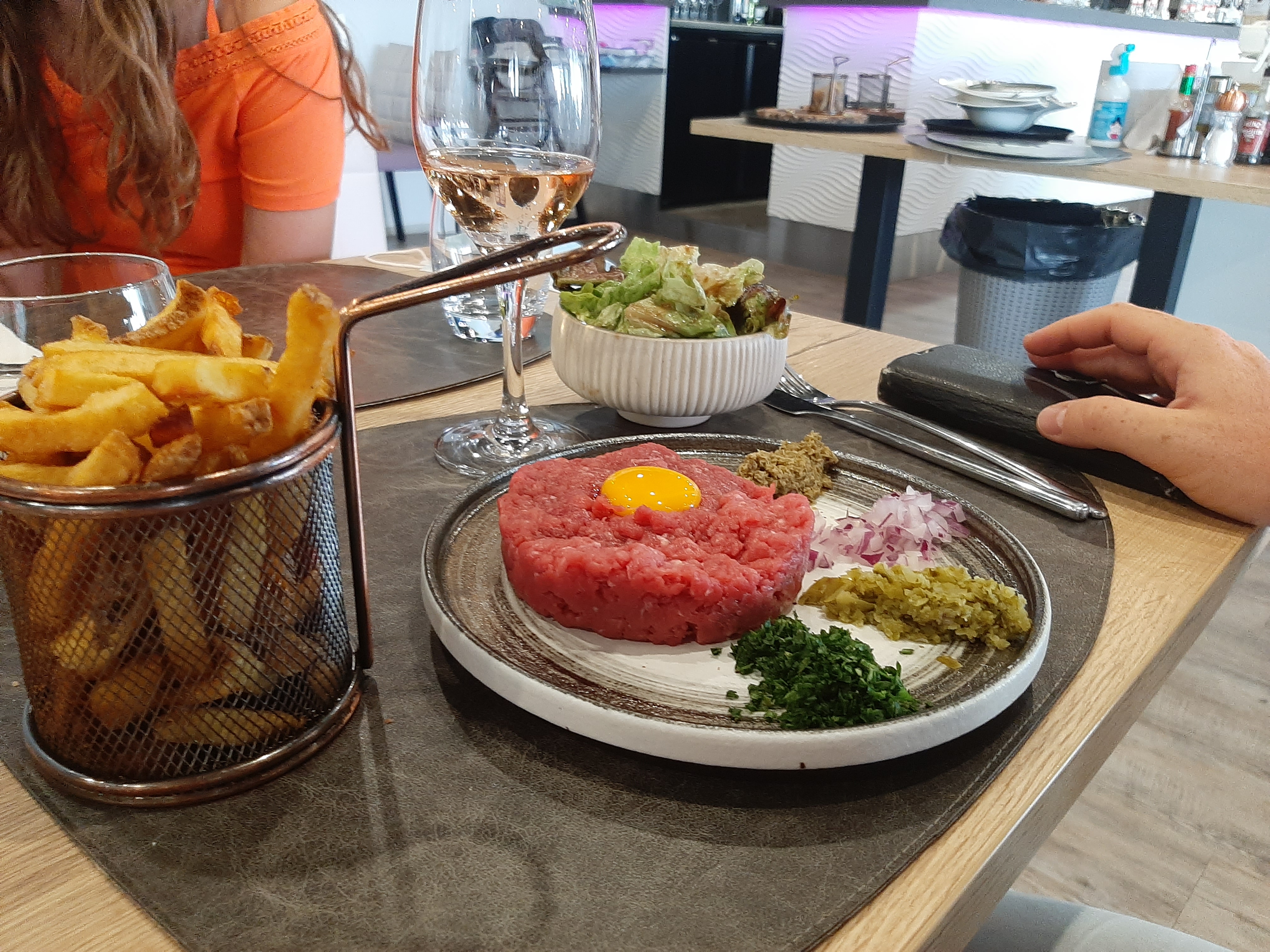 Accueil chaleureux, les serveurs souriants, vêtus avec des jolies chemises. La cuisine était excellente, javais pris un tartare de thon accompagné des frites des patates douces et en dessert une crème brûlée. Je recommande à 100%.