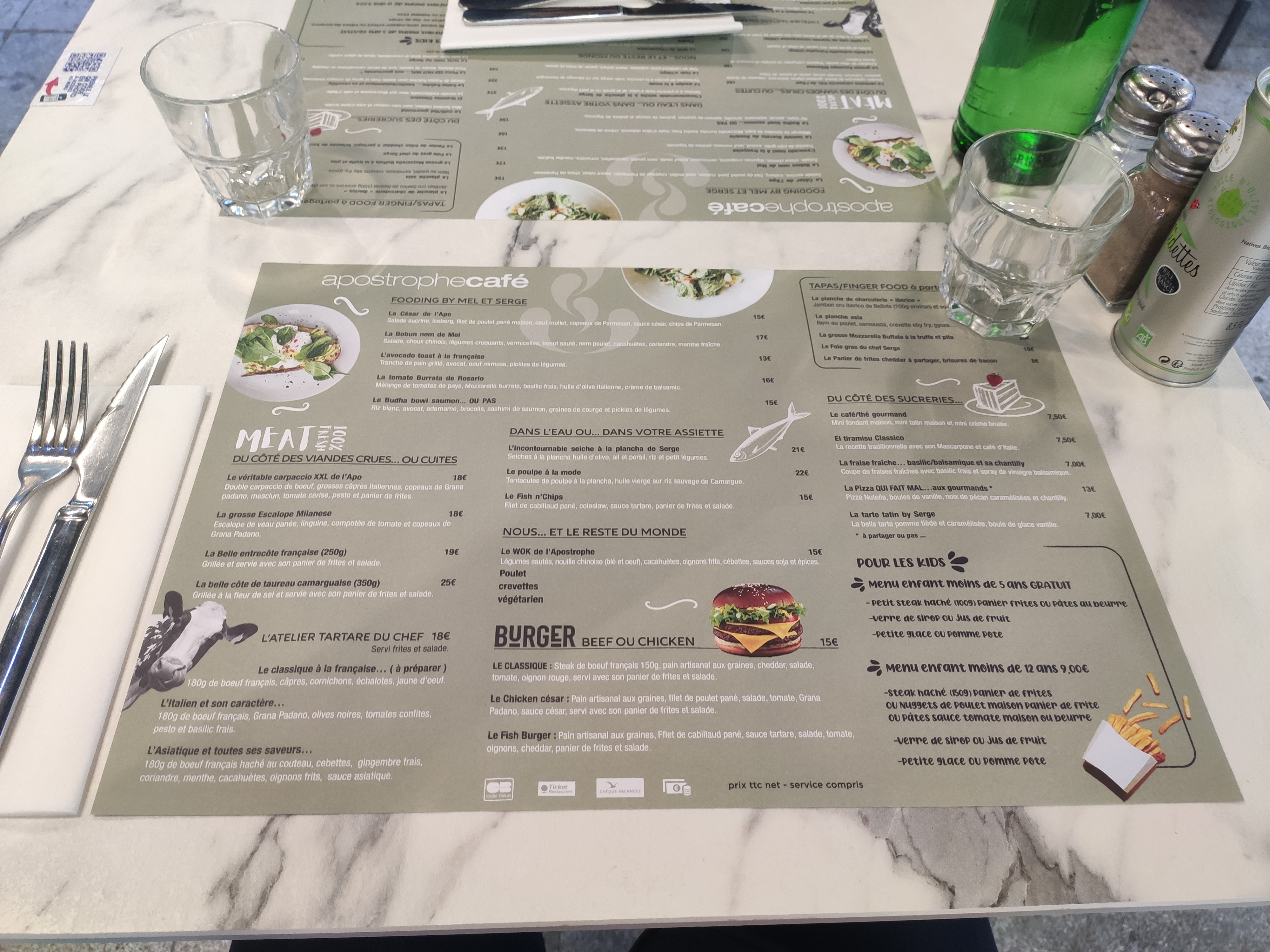 Excellent repas tarif très abordables un service agréable nous recommandons à 100% l’apostrophe café et allons revenir très vite