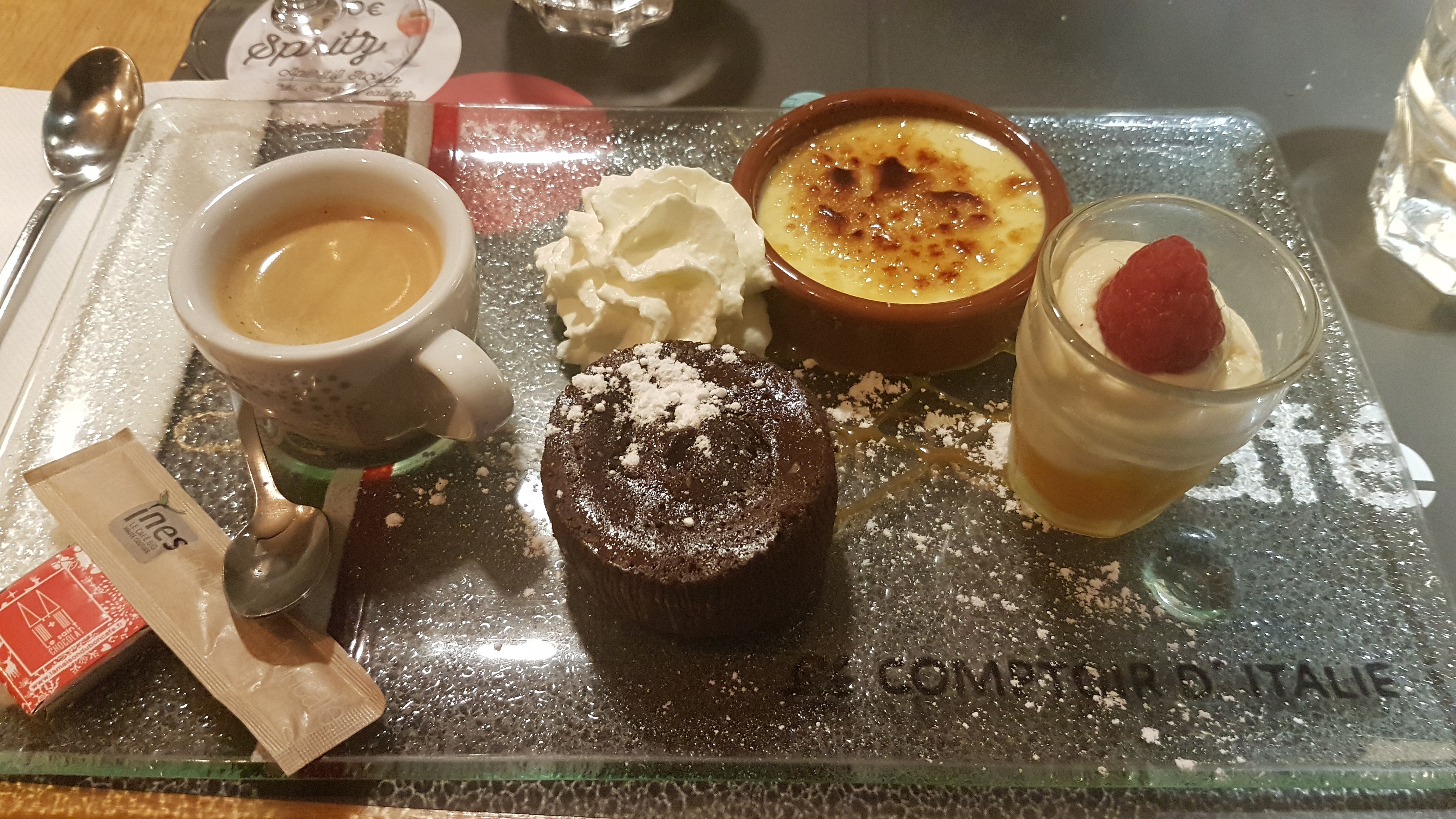 Un bon plat (sèches et légumes) et super café gourmand. Par contre service un peu lent et pas très attentif...