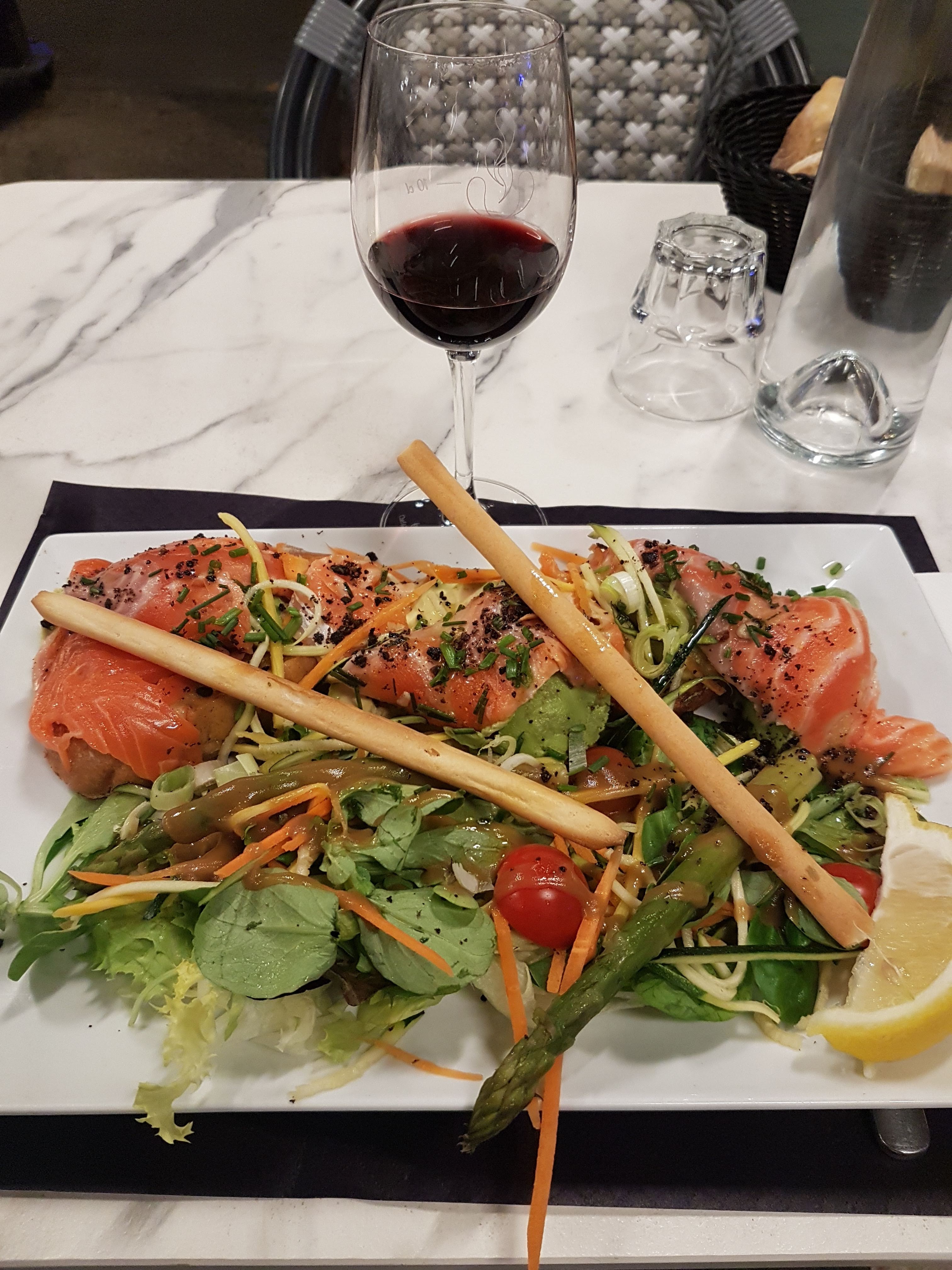 L’ambiance est bien mais la cuisine laisse à désirer Le saumon gravlax était beaucoup beaucoup trop salé. La salade cesar simple.
