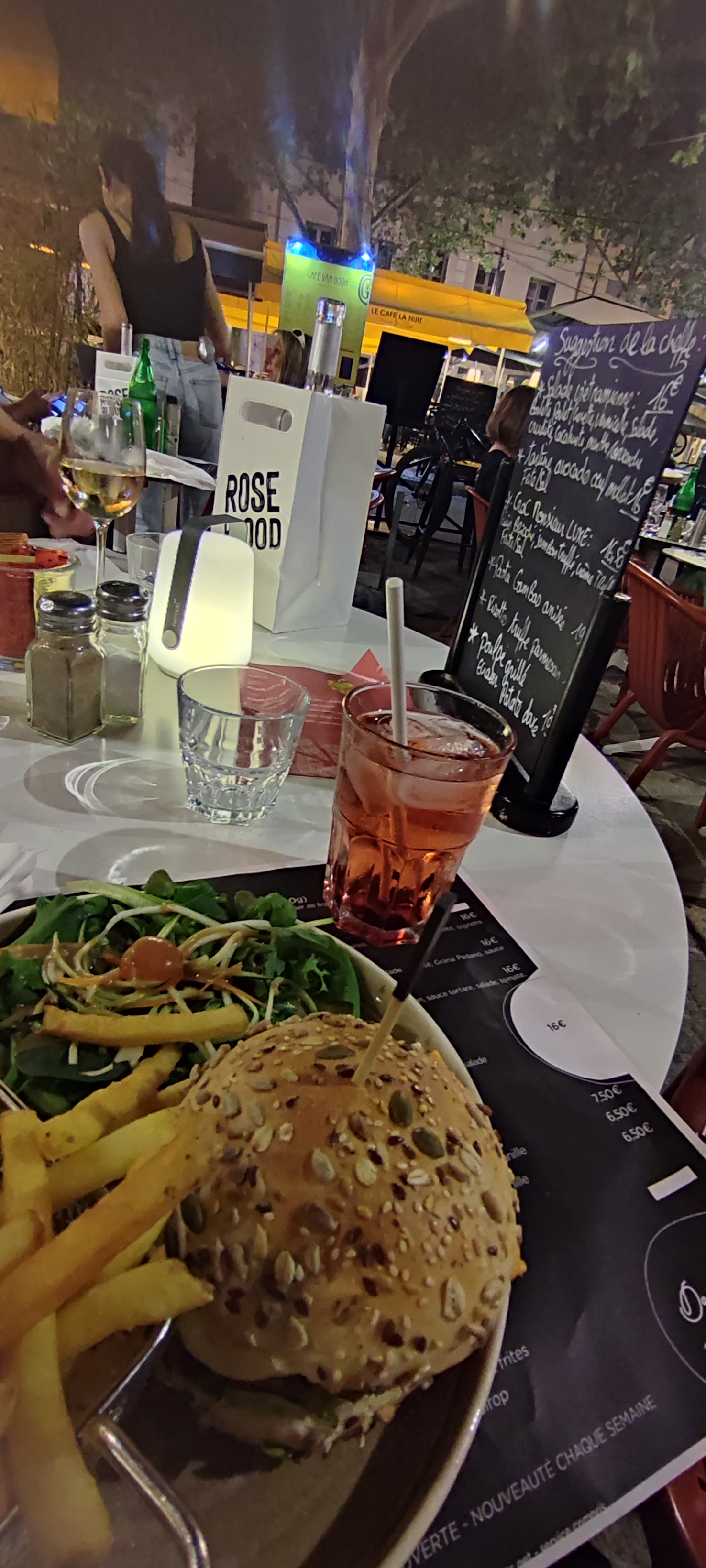 Avec mon ami, nous sommes allés à trois reprises dans ce restau lors de notre dernier séjour arlésien : pour prendre l'apéro en début de soirée, pour une petite pause fraîcheur en matinée et pour un repas improvisé en fin de soirée. Nous avons souvent été déçus par les établissements situés sur la place du Forum. L'apostrophe a été une agréable surprise. J'ai beaucoup aimé le délicieux smothie à la pêche ainsi que le chicken Burger très savoureux avec son pain aux graines, un filet de poulet pané et le petit panier de frites en accompagnement. Ce n'est pas de la haute gastronomie mais tout est très bon et copieux. Les serveurs sont efficaces et agréables. Le restau reste ouvert jusqu'à 22h30. Ça a été très appréciable pour mon ami et moi car nous avons pu nous replier sur l'Apostrophe après un repas décevant dans un établissement concurrent situé à proximité.
