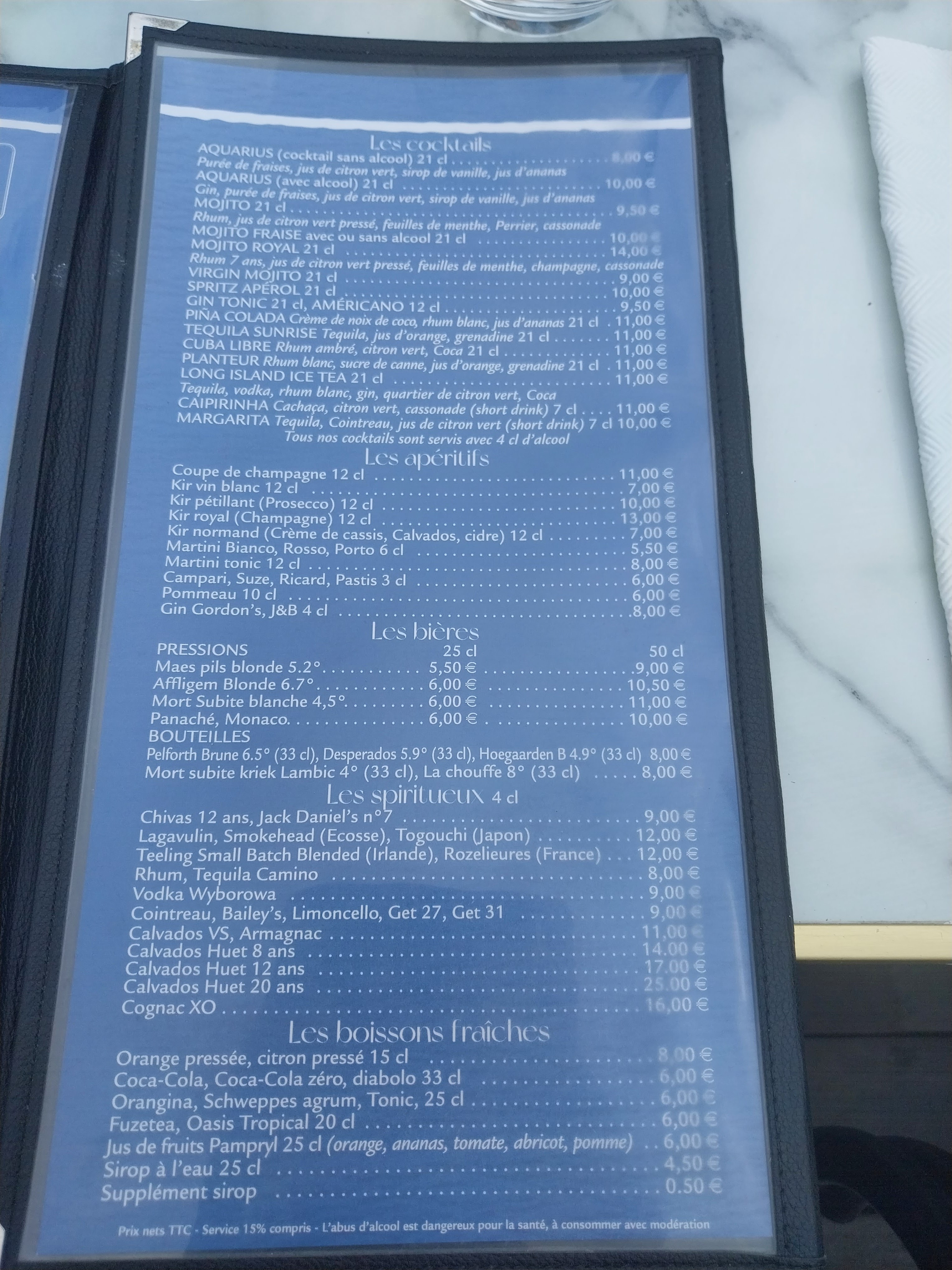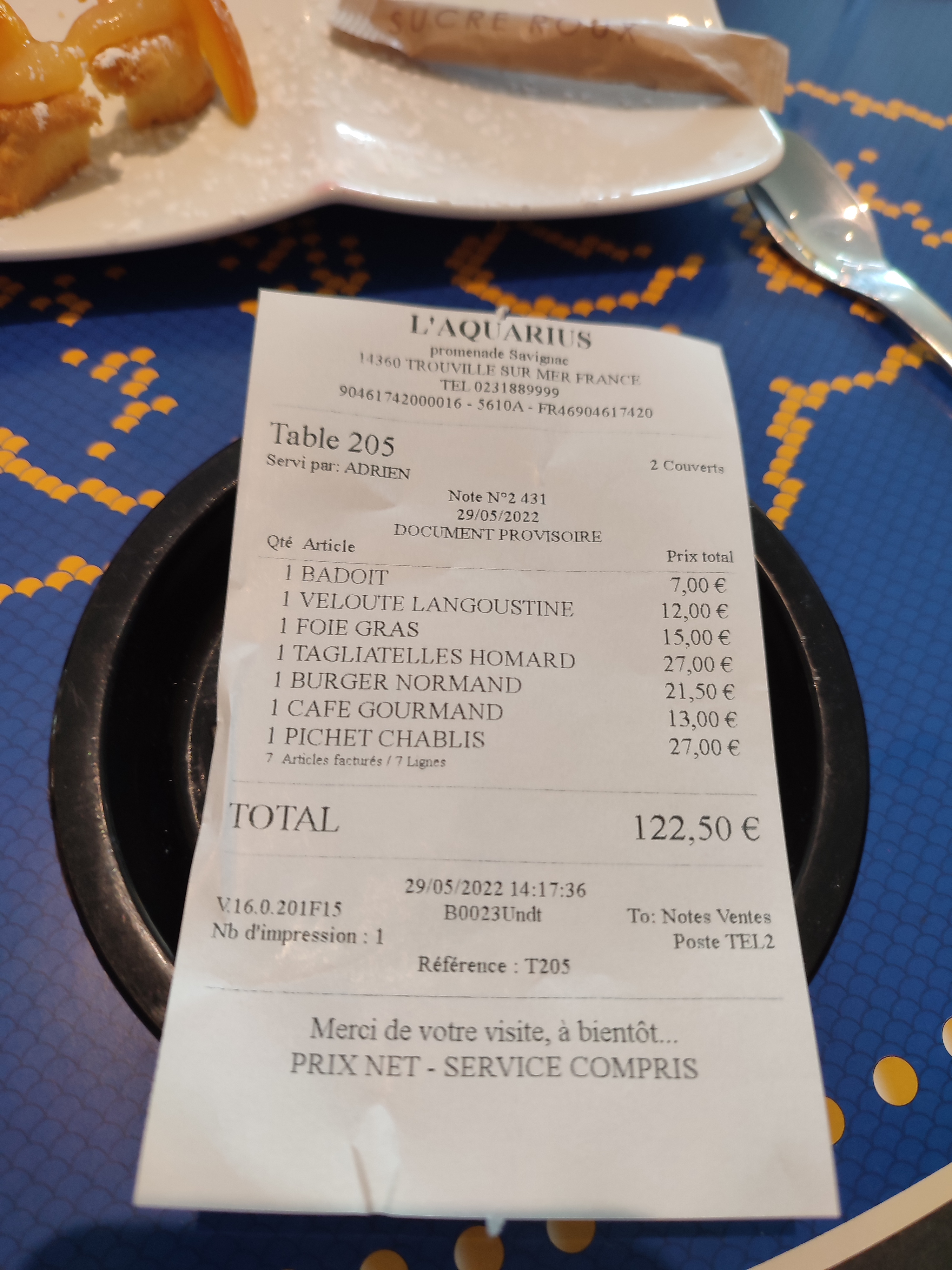 Nous avons dîné samedi 02/03 à l’Aquarius et nous avons quitté Trouville deux jours après malades. Nous avions pris des crevettes et huîtres à l’apéro, moi le filet de bar et mon époux le mi cuit de Thon et dès la première bouchée il s’est levé et s’est retrouvé à vomir au toilette et dans le doute m’a demandé de goûter et il est certain que ça sentait le pourri. Cependant, j’ai fortement apprécié la réaction du serveur et le cuisinier, mon mari a commandé un autre plat (et selon ces personnes, le fournisseur avait déjà été contacté par deux autres restaurants dans ke même cas)D’ailleurs j’étais ravie de laisser un petit pourboire de 5€ Avec le recul et surtout l’intoxication (vomissements, diarrhée les deux nuits suivantes), je reconnais avoir eu un petit doute sur la fraîcheur du filet de sol ( surcuit et un chouïa trop assaisonné). Bref, dommage mais nous ne reviendrons plus. Faites juste attention à la santé de vos clients svp, ça peut virer au cauchemar la prochaine fois et ternir votre réputation.