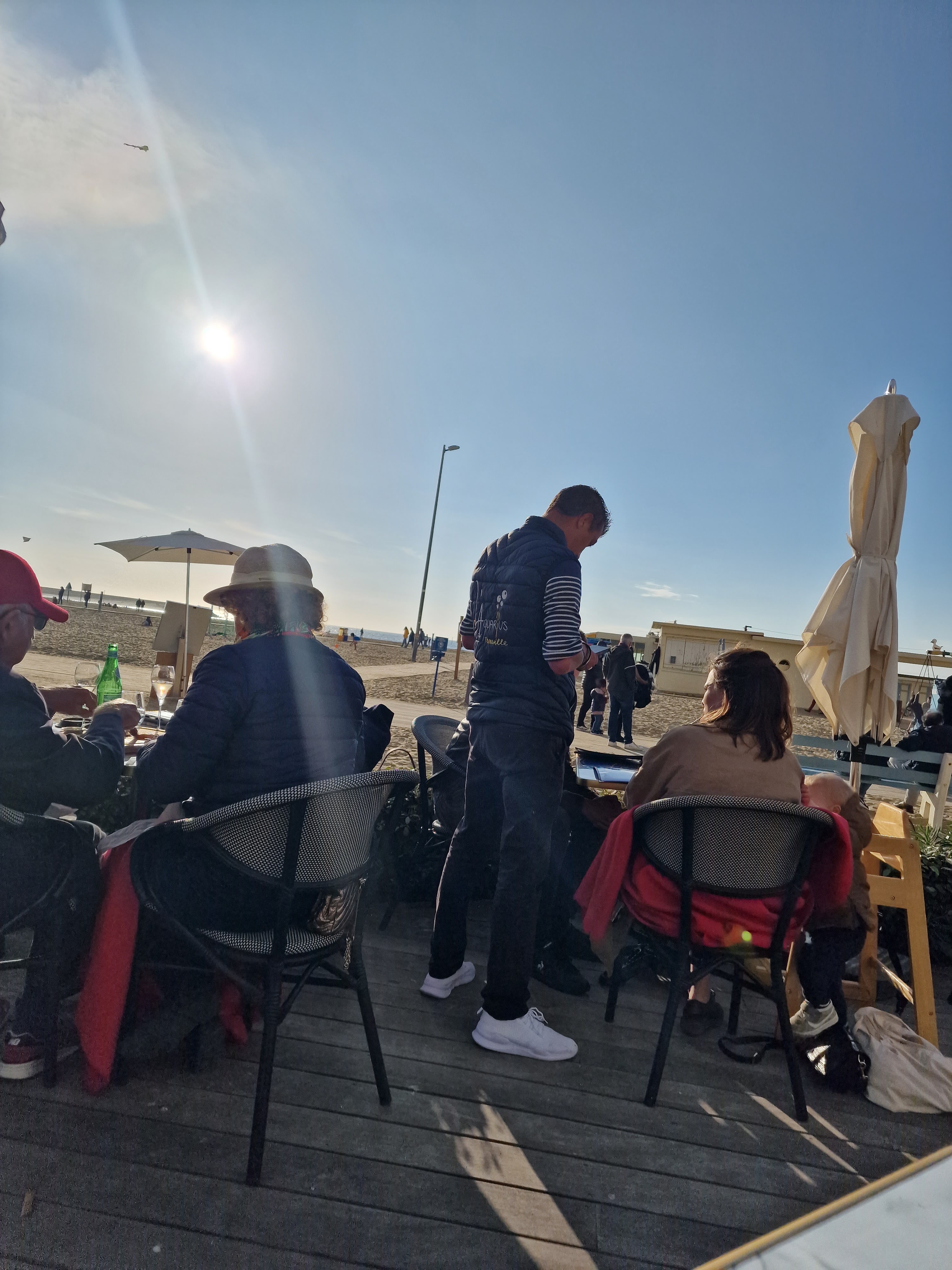 Nous venons de vivre une expérience déplorable. Arrivés tôt avec une poussette, nous souhaitions une table proche mer. Acceuil très froid du patron qui nous indique que tout est réservé,nous place à l'arrière alors que pendant 1h30 des tables sont restées libres. Ensuite nous avons tenté de trouver une solution pour assoir notre fils de 2 ans, la seule et unique chaise haute étant prise. Aucune aide du patron, ni du serveur. Finalement une serveuse adorable nous a sauve. Ensuite, une carte donnée pour 2,, il a fallut réclamer. Il a aussi fallut réclamer pour commander. On demande sel, poivre on nous le donne pas. Ma salade césar à 23 euros était bonne mais de la taille d'une entrée : 2 tranches de pommes de terre. Pour couronner le tout des plaids sont proposés à la table d'à côté qui ont plus consommé que nous ? Il n'y en avait plus pour nous. Nous avons gelé. La finale, ils ont crus qu'on était parti sans payer, alors que mon mari était au bar avec sa carte. Bref adresse à fuir !!