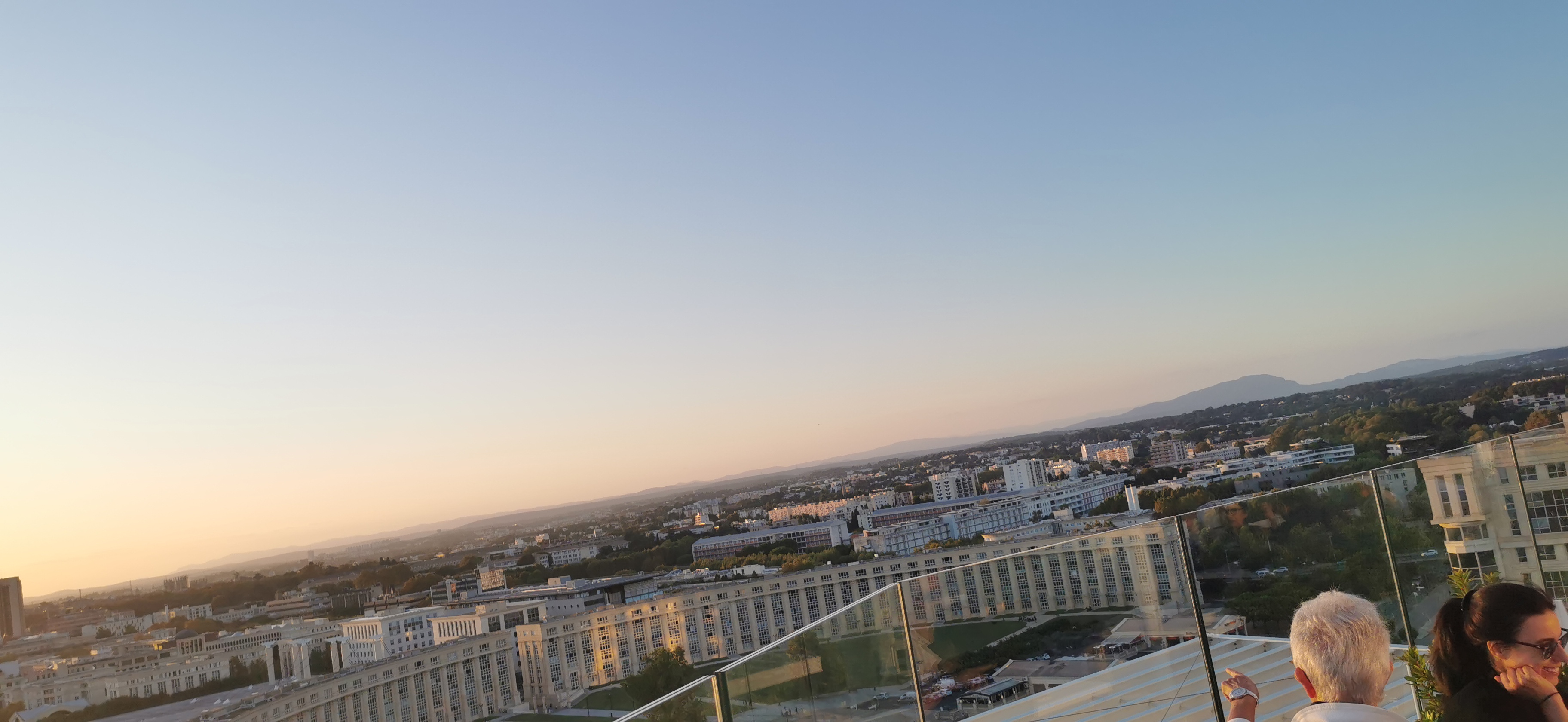 Superbe terrasse avec vue a 360 degrés sur la ville et ses environs , y compris vue sur la mer depuis la terrasse face au bar. L immeuble est d une architecture remarquable et très moderne. A absolument découvrir si vous êtes de passage à Montpellier