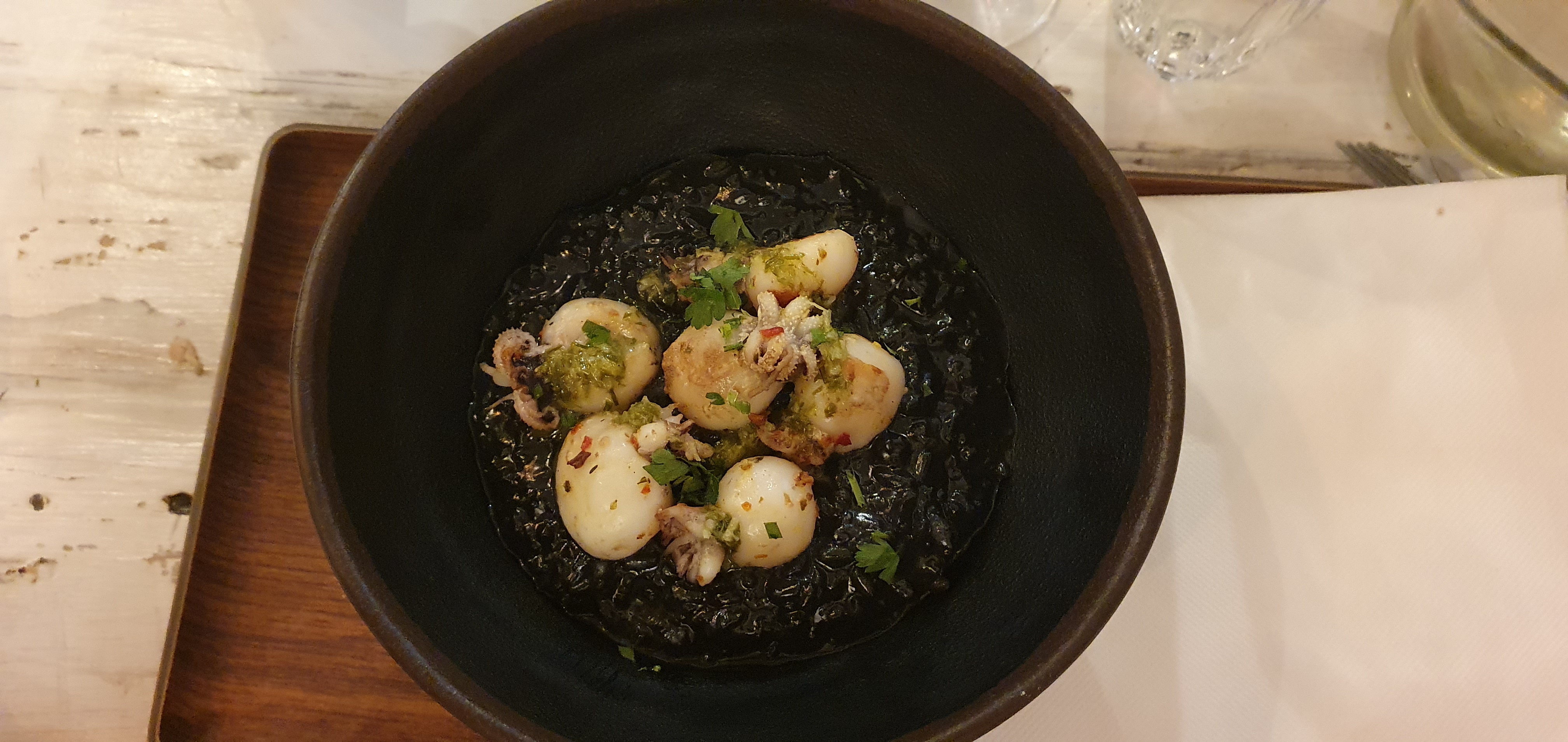 Risotto à l'encre de seiche : Une tuerie... Le cannelé profiteroles est parait-il excellent. Les viandes du mixed grill sont savoureuses un plat copieux, les légumes auraient mérités un peu plus le grill (à mon goût) Quand au personnel : Souriant et de bon conseil...