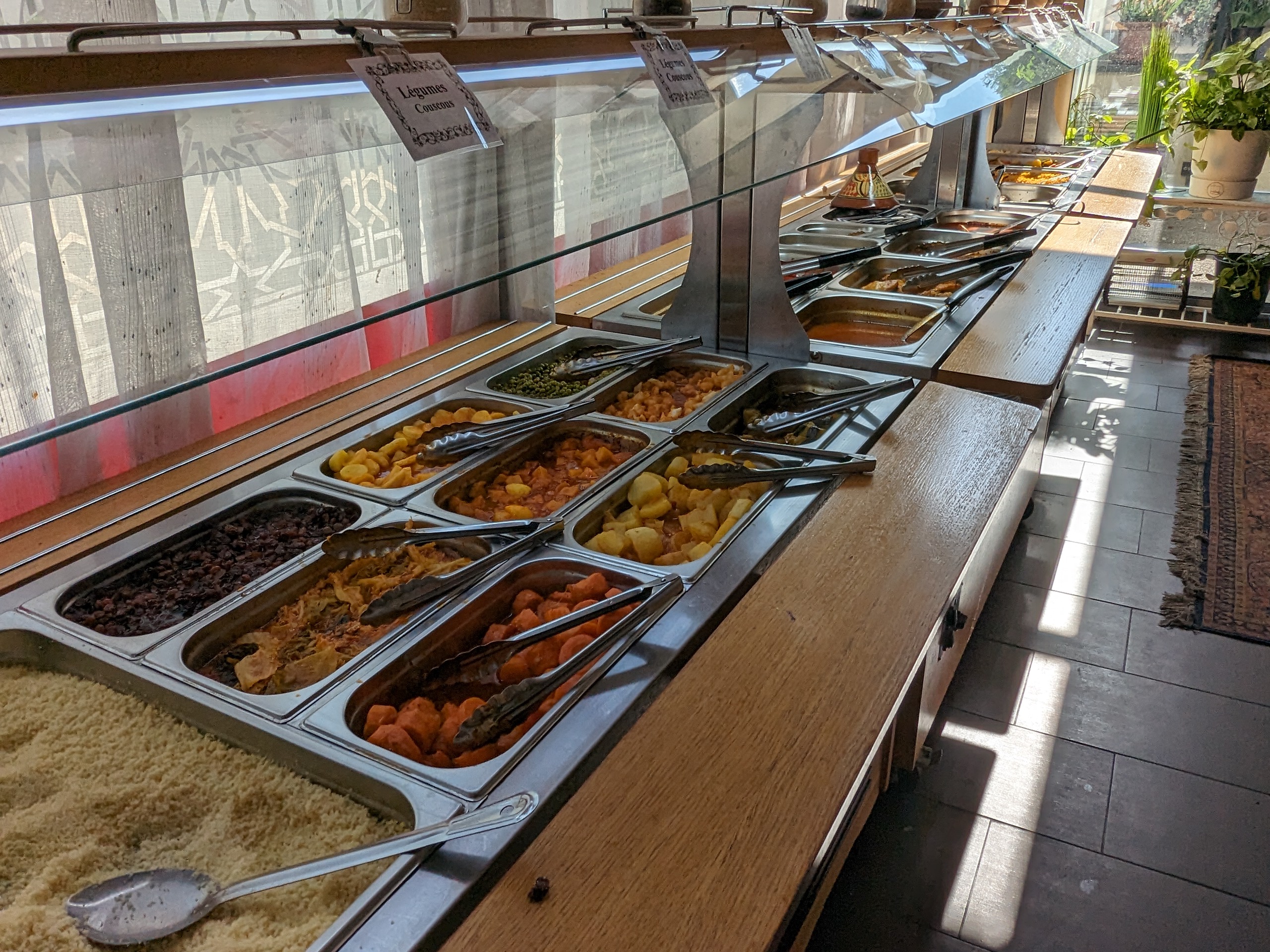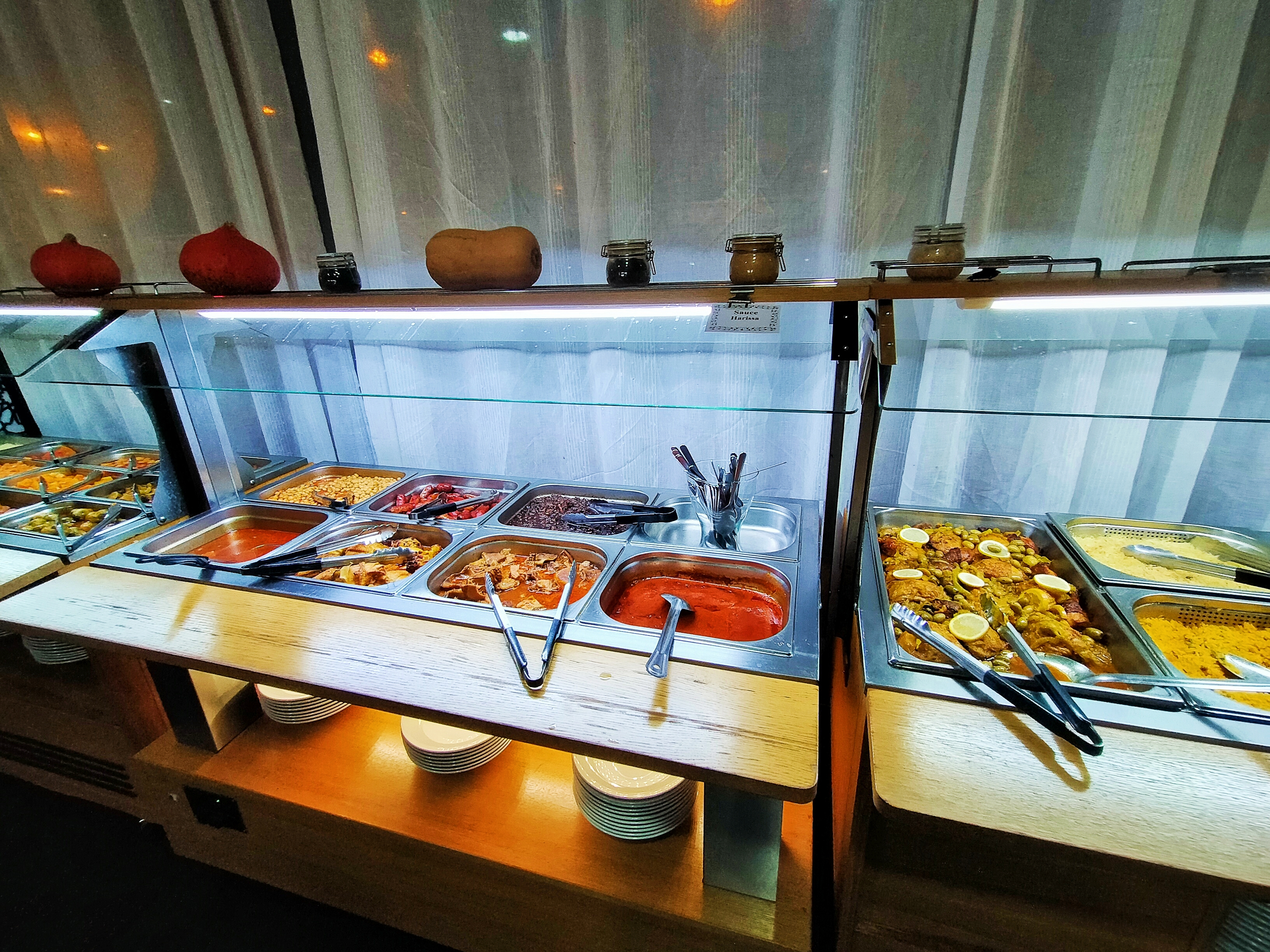 Très bon buffet à volonté de couscous et tajine marocain. Il y a beaucoup de choix que de soit en entrée, plat ou désert. De nombreuse option sont disponible pour les végétariens . Seul petit bémol, les plats ne sont pas toujours très chaud ( moi j’ai bien le couscous bien chaud) Les plats ne sont pas épicés de base, mais de l’harissa est bien sûr disponible pour se faire son assaisonnement.