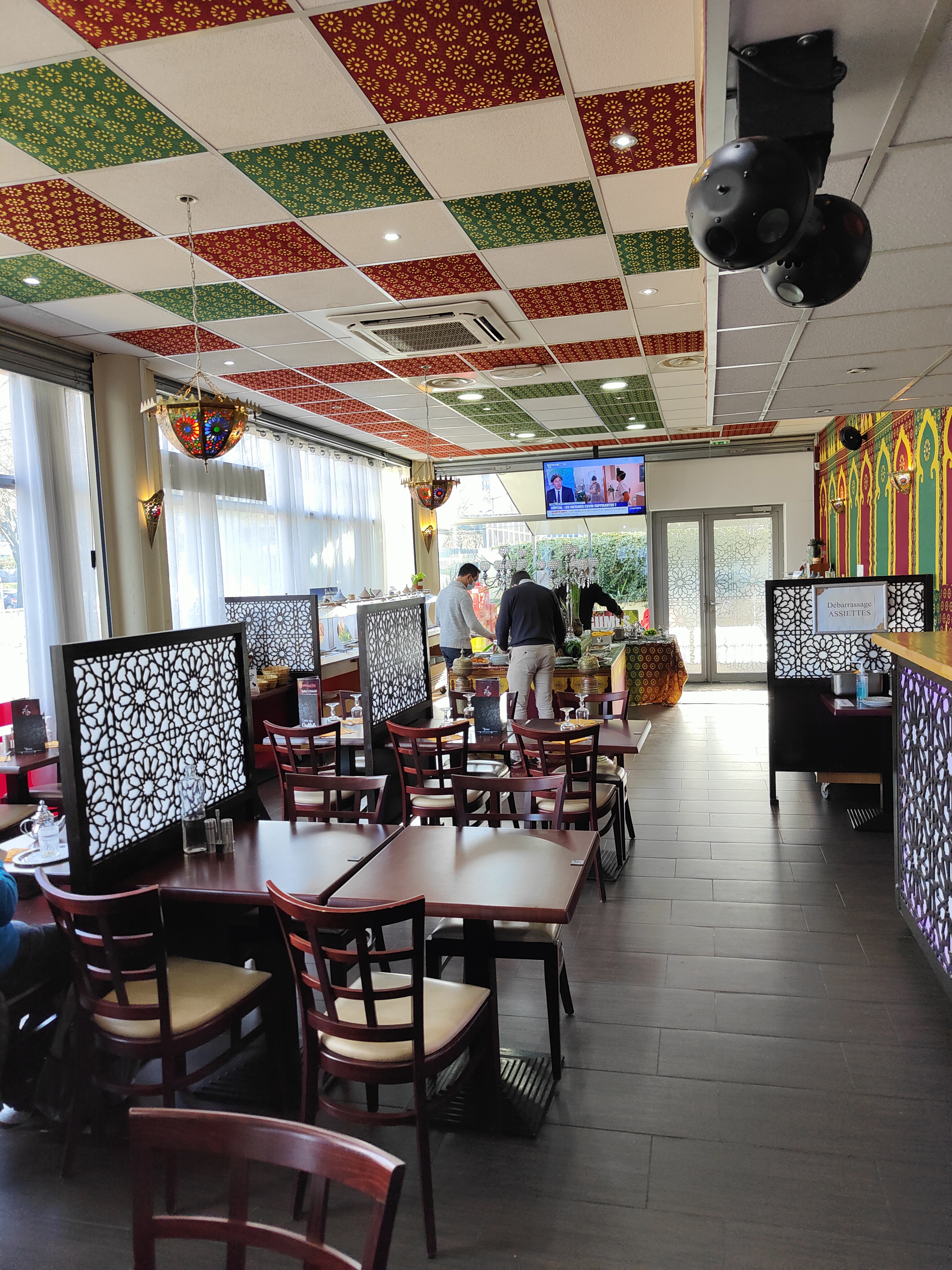 Le décor ne fait pas rêver , dommage il y a temps de possibilités. Au niveau du personnel , grosse défaillance. Pour Madame le tablier est salle et pour Monsieur qui s'occupe du bar , il est complétement dépassé., d'ou des temps d'attentes très long pour les boissons et pour le thé à la menthe on l'attend toujours. Au niveau du buffet, la promesse n'est pas tenue, beaucoup moins de choix que ce qui est mentionné sur le site internet. Pas de brochettes, de boeuf, de boulettes. et les plats sont froids. Au niveau des desserts des pâtisseries Orientale de piètre qualité, bananes , pommes, des très petits morceau de flan et tarte pomme . Pour les autres desserts prévus au buffet : îles flottantes, mini crème brûlée, croquant 3 chocolats, mini choux... ils sont inexistants. Le concept est intéressant , dommage c'est complètement raté et en plus mensonger sur la composition.