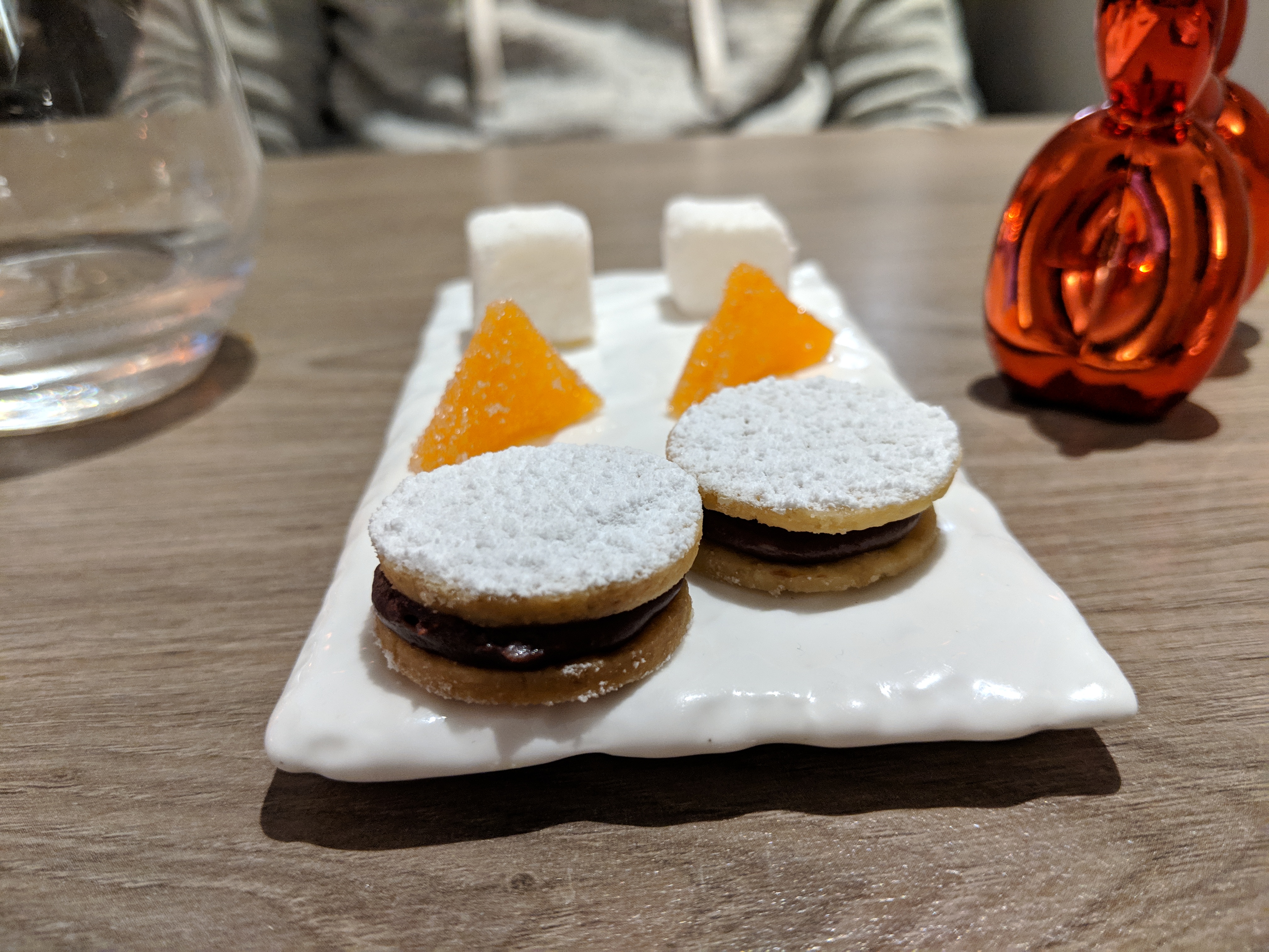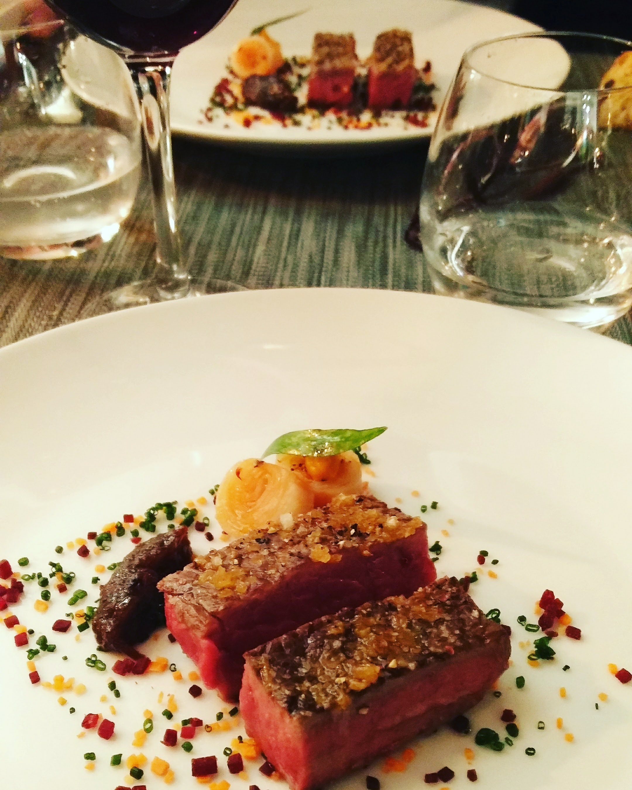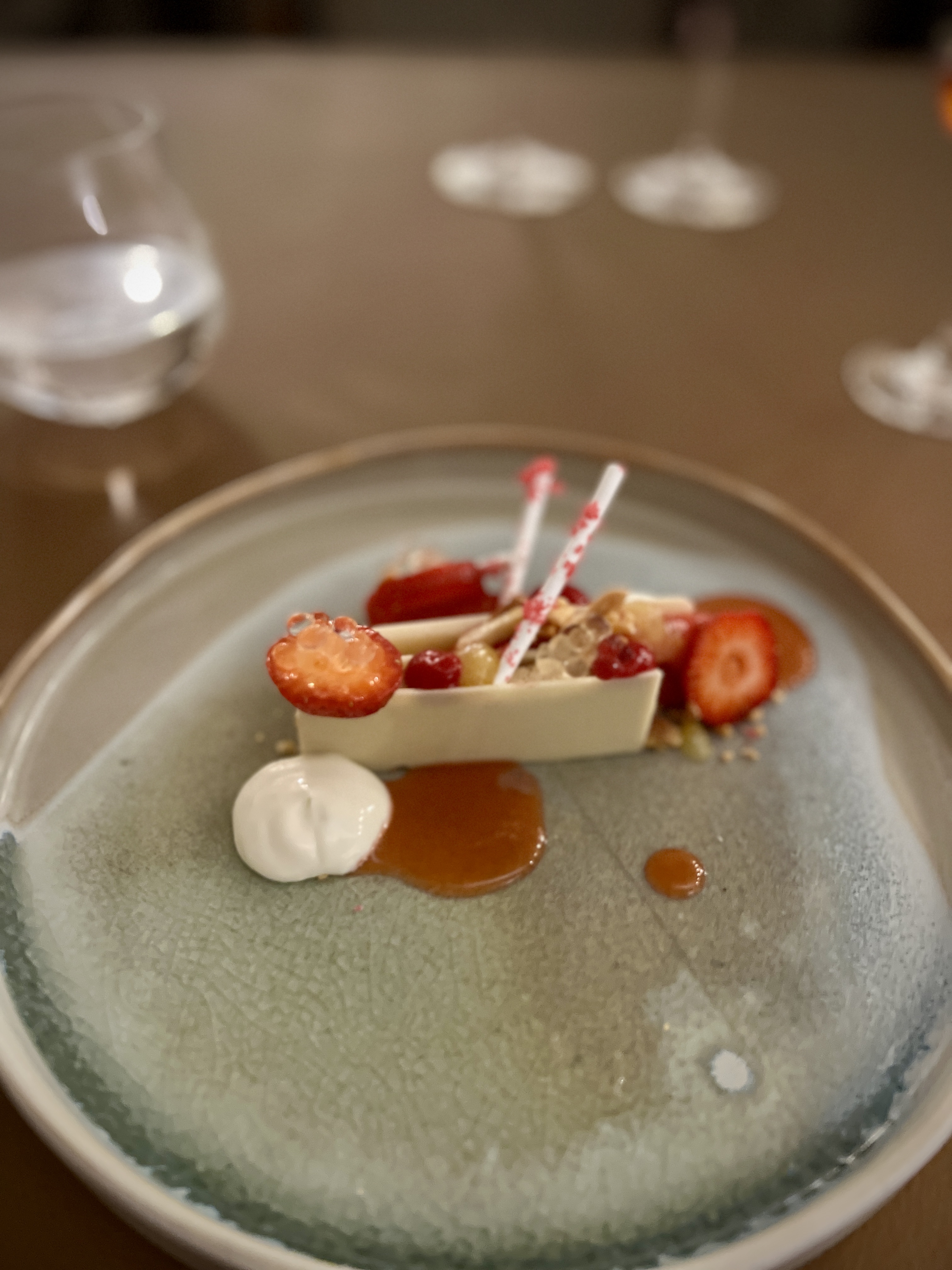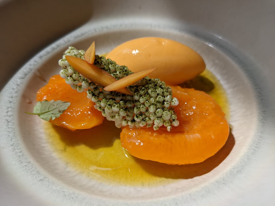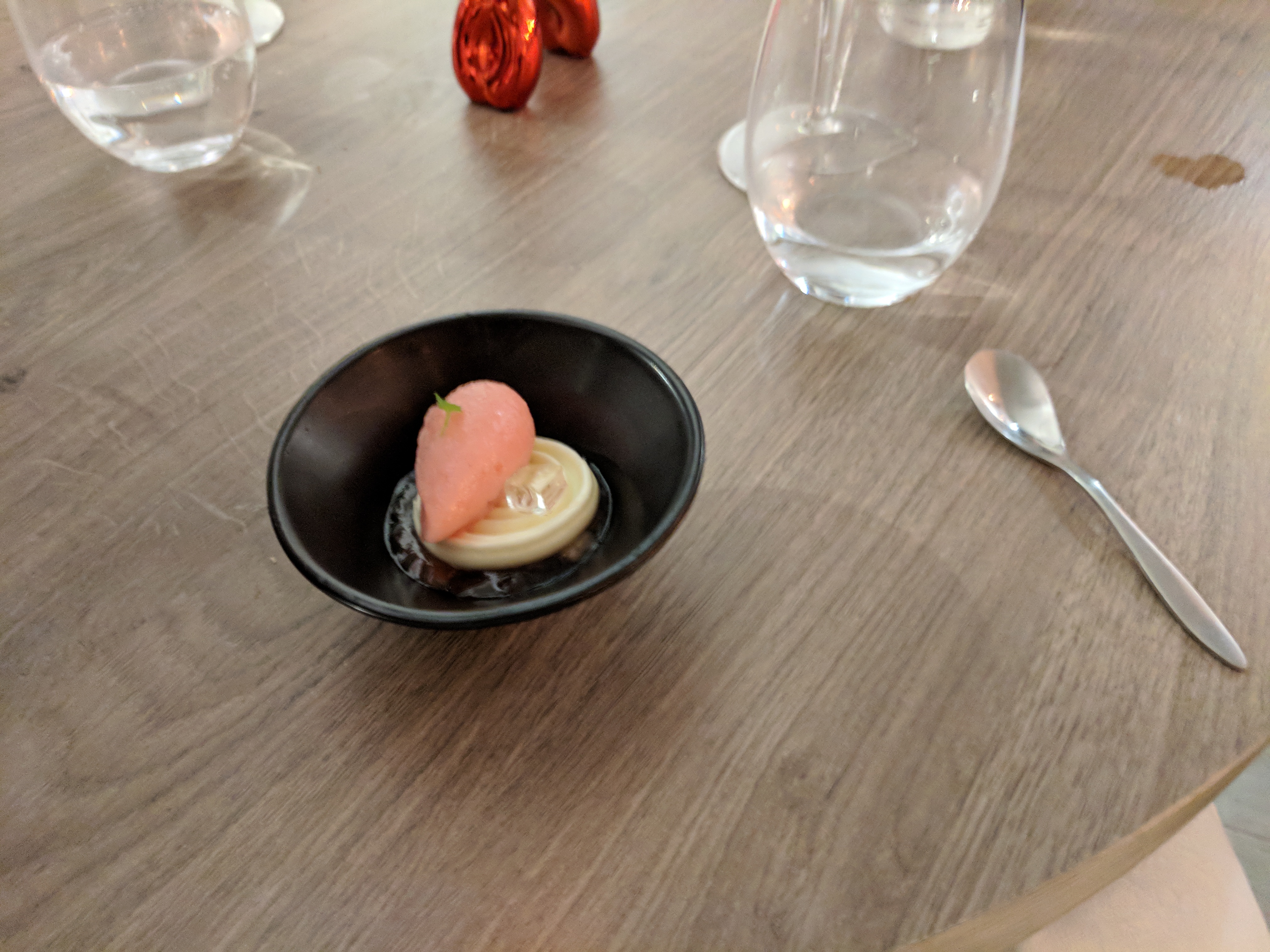 S'il n'y a rien à dire sur le travail de la matière et de la présentation (à part sur le dessert qui est quand même bien plus pauvre que ce à quoi je m'attendais) je n'ai pas trouvé un seul goût que j'ai adoré. Il y a une recherche d'originalité dans les saveurs, ce n'est pas que ce n'est pas bon mais à chaque fois c'était accompagné par quelque chose d'acide ou amer. La Textures de carottes tellement simple qu'on pense être capable de faire ça chez soi. Le plat principal n'a rien d'extraordinaire, je n'ai pas fini l'accompagnement champignons tant ça ne m'a pas plu. Les mignardises à la fin n'ont pas le goût qu'on attend malgré les saveurs simples (fraise, framboise, mangue) avec encore de la bergamote pour bien être sûr d'avoir encore de l'acidulé. Pareil pour le dessert d'abricots.