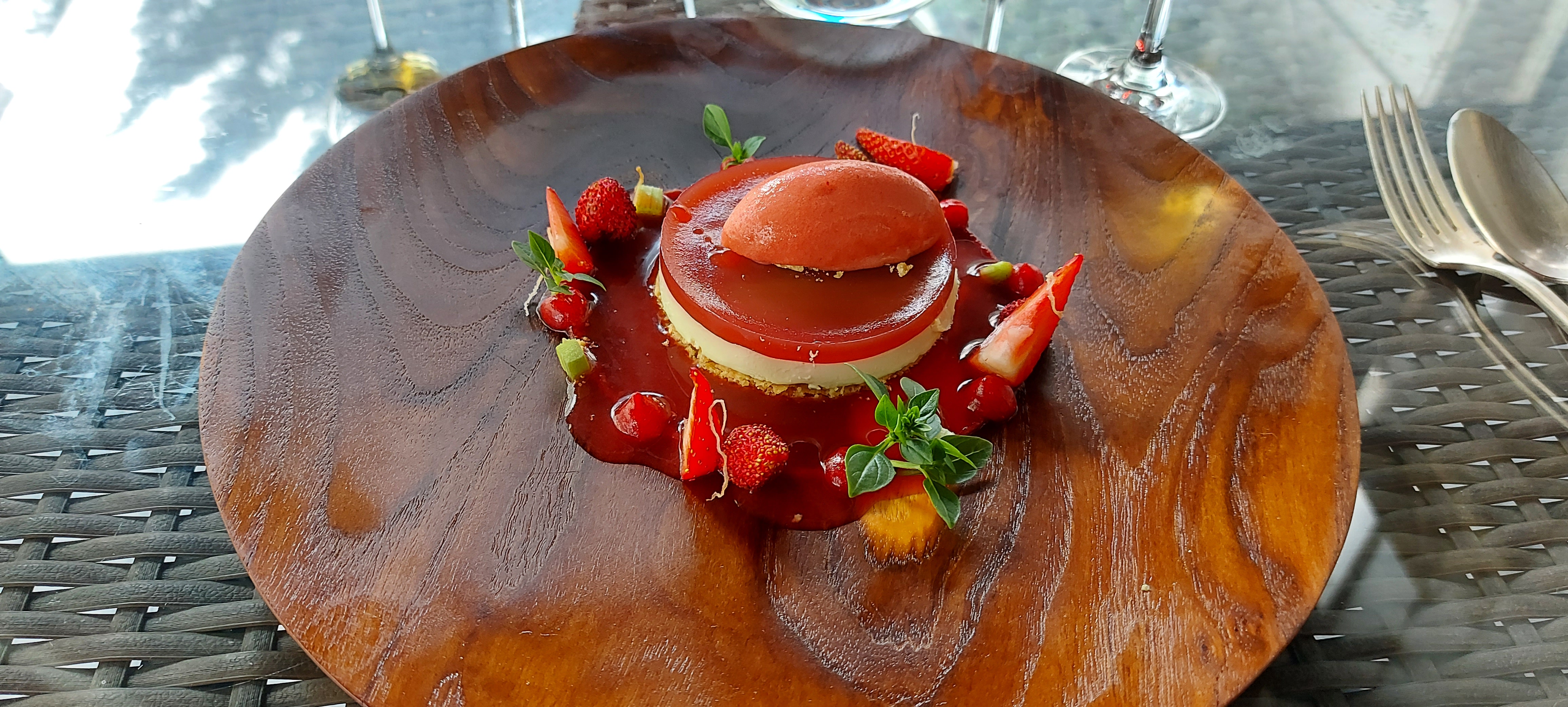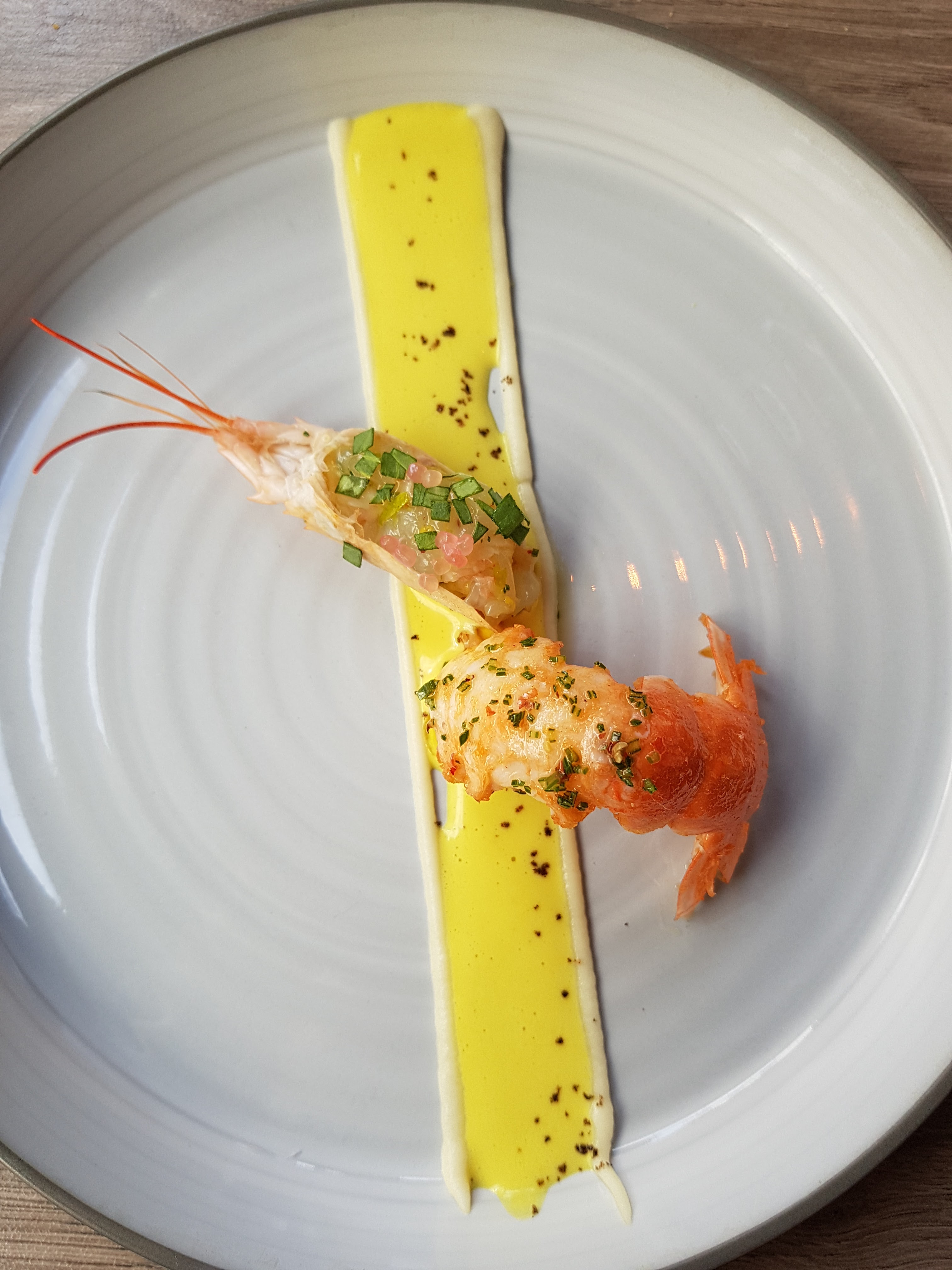 Commandé et emporté, réchauffé avec soin et de superbes saveurs de l'entrée au dessert : langoustines glacées, coquelet au vin rouge et textures mangue et passion. Une très belle et généreuse présentation pour une somme très raisonnable ! Merci, nous reviendrons