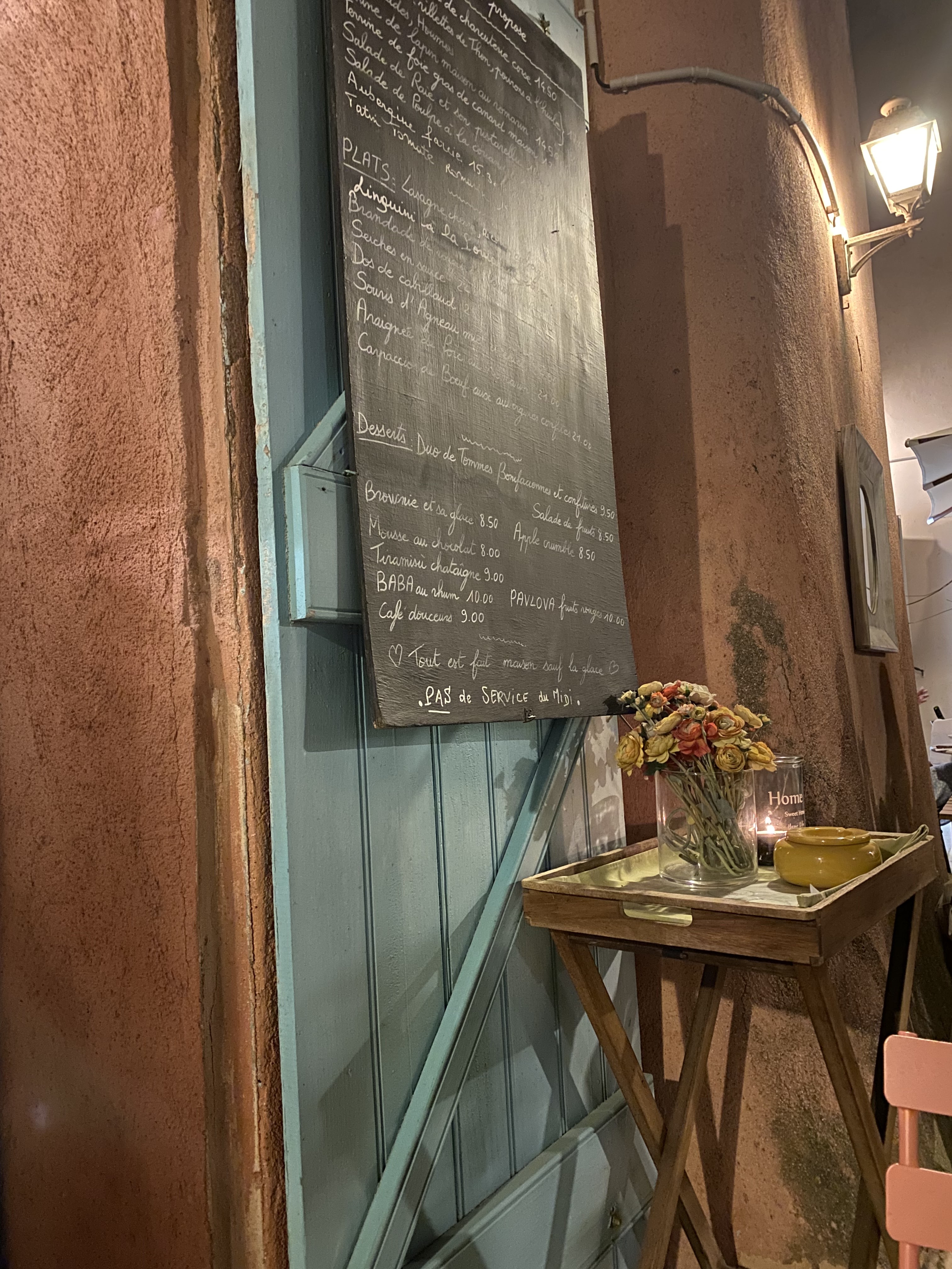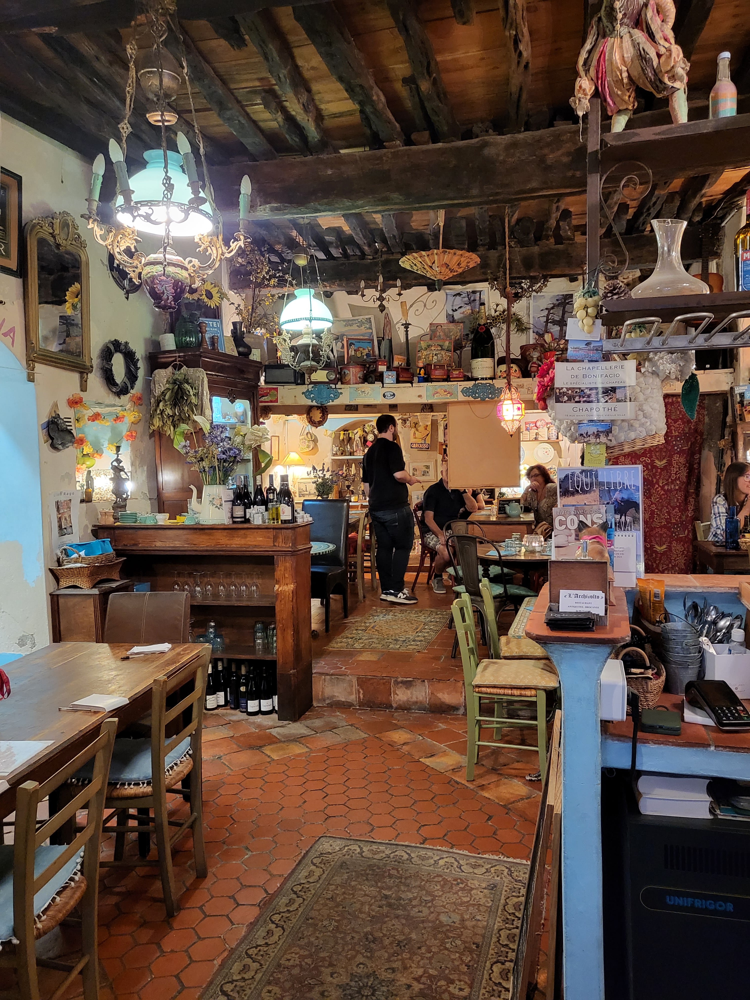 La décoration et le cadre sont exceptionnels et a découvrir sans hésiter ! Nous avions réservé en terrasse, mais l'ambiance intérieure est également très chaleureuse et vraiment très atypique, style brocante. Les plats sont bons servis dans de la vaisselle dans le style de la déco. Un petit moment de paradis dans les rues animées de Bonifacio. Les patrons sont agréables, le seul point négatif pour nous est que notre serveur n'avait pas de masque durant toute la soirée en intérieur comme en extérieur. Inexplicable en cette période si compliquée.