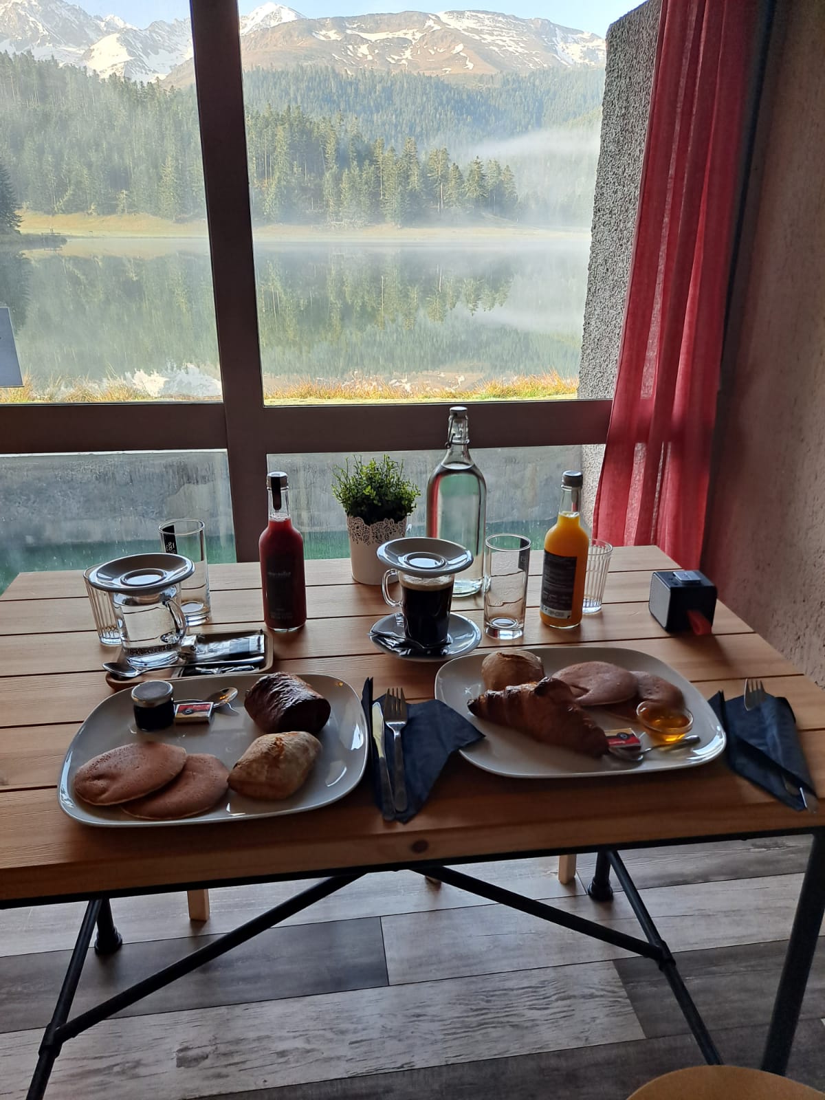 Endroit magique ! Tout d'abord, un personnel adorable qui a su nous déstresser à notre arrivée (arrivée tardive pas prévue ...) et qui a tout fait pour que l'on puisse passer cet agréable séjour. Chambre très propre et accueillante, cocooning avec radiateur imitant un feu de cheminée :) Mais le top, c'est quand vous ouvrez les volets roulants le matin et que vous avez le levé du soleil sur les montagnes enneigées juste au-dessus du lac gelé !! Magnifique !!! Nous avons testé le repas du soir. Rien à dire, copieux et parfait pour un apéro dinatoire. Le petit-déj, un régal ! Les viennoiseries toutes chaudes avec un bon jus 100% fruits. La salle de bain, très propre aussi. Avec tout ce qu'il faut comme gel douche, etc. Sans compter ce qu'il y a à faire autour. Balade derrière le lac, dans les bois le long d'un cour d'eau, loin des gens qui restent autour du lac, très reposant. Je vous laisse découvrir le reste !