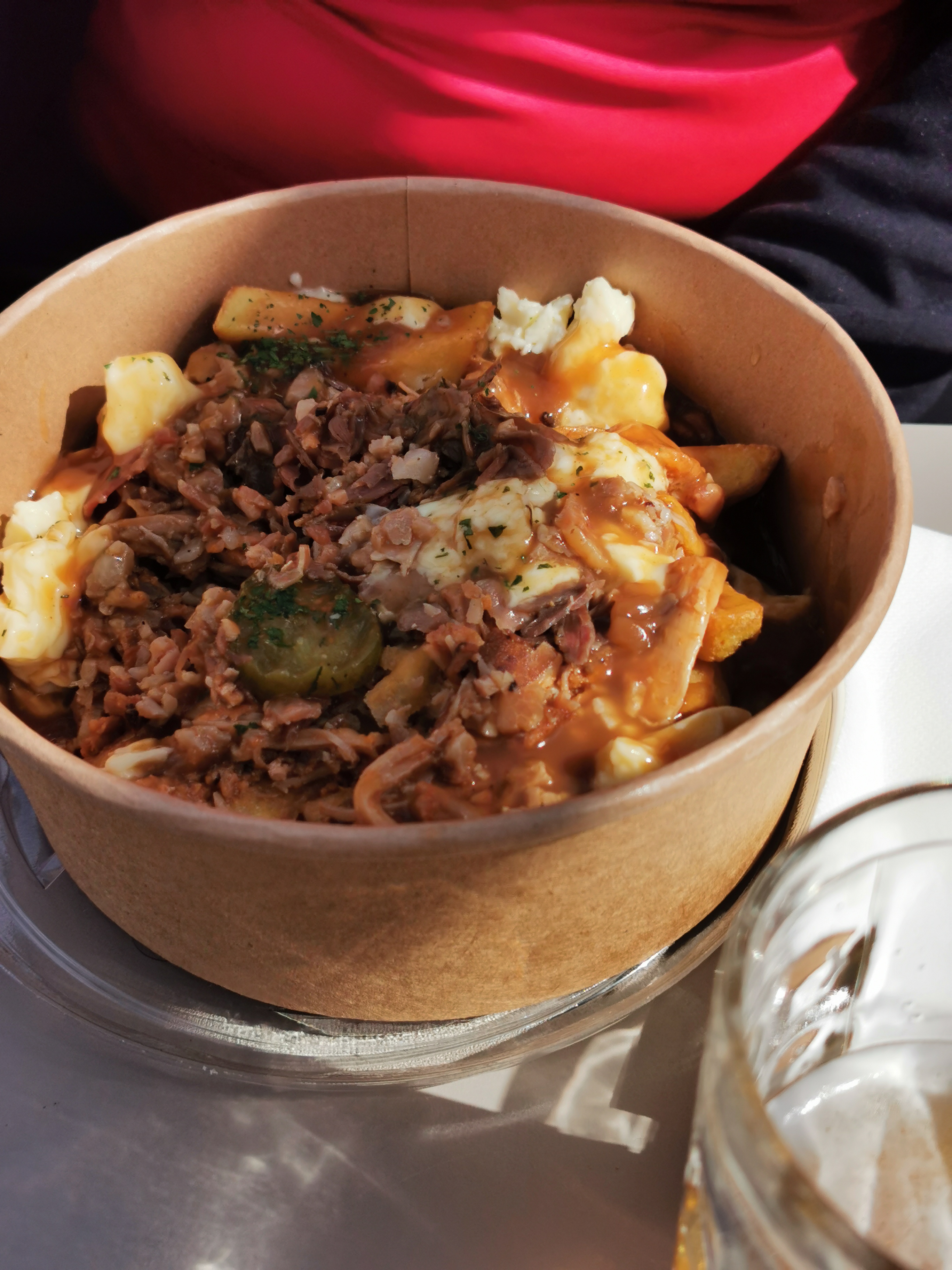 Quelques spécialités canadiennes 🍁 (poutines, salades, sirop d'érable, bières, sodas...) servies par une équipe très sympa (sur la photo une poutine : plat de frites sauce brune et fromage, ici avec en plus champignons marinés et pulled pork) au pied du lac de Payolle.