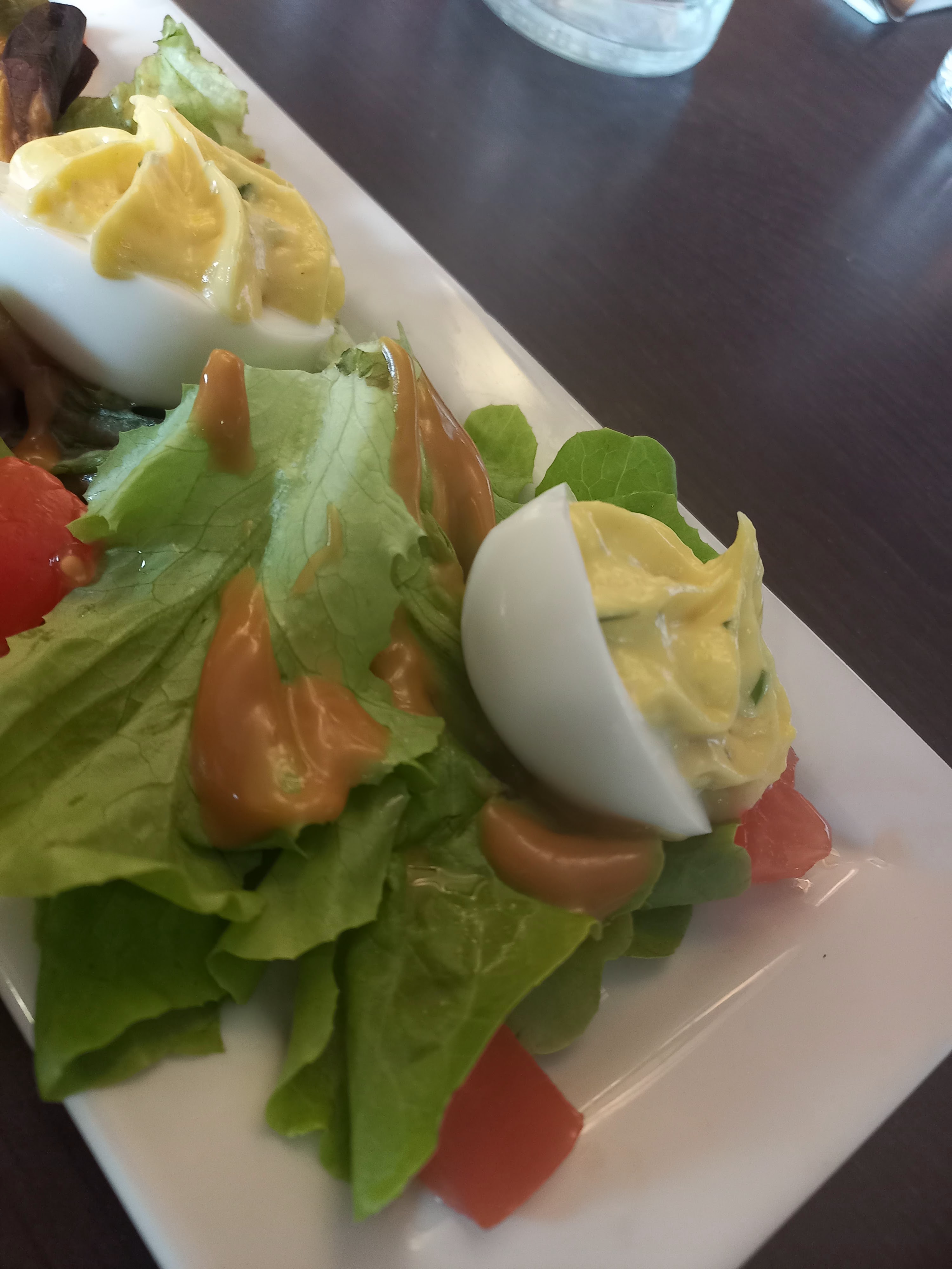 A éviter On arrive et je cherche un serveur pour savoir si on peut s’installer en terrasse, je regarde la terrasse sans entrer dans le restaurant, au bout de 5 minutes, le personnel qui mangeait en terrasse nous dit bonjour sans nous inviter à nous installer ! On décide de prendre place. Les oeufs mimosa de l’entrée dégoulinent de mayonnaise, écoeurant! Le burger pris en plat sans saveur est fait avec du pain industriel, on décide donc de se passer de dessert et de juste prendre un café, infecte !