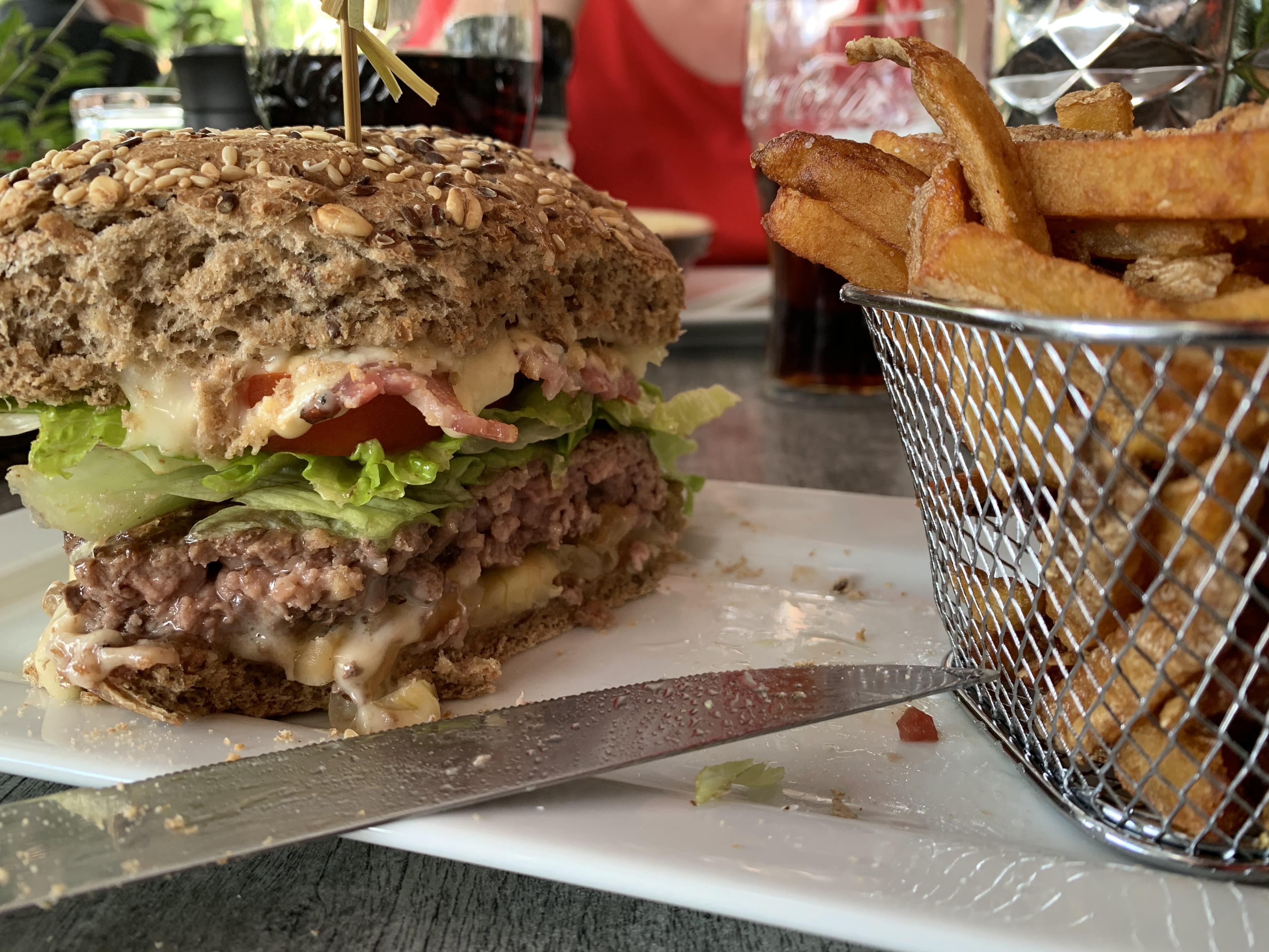 Le burger est bon le personnel sympathique mais alors le pichet de rose 50 cl à 19 euros nous reste à travers de la gorge , une honte pour ce vin insipide . Resto à éviter