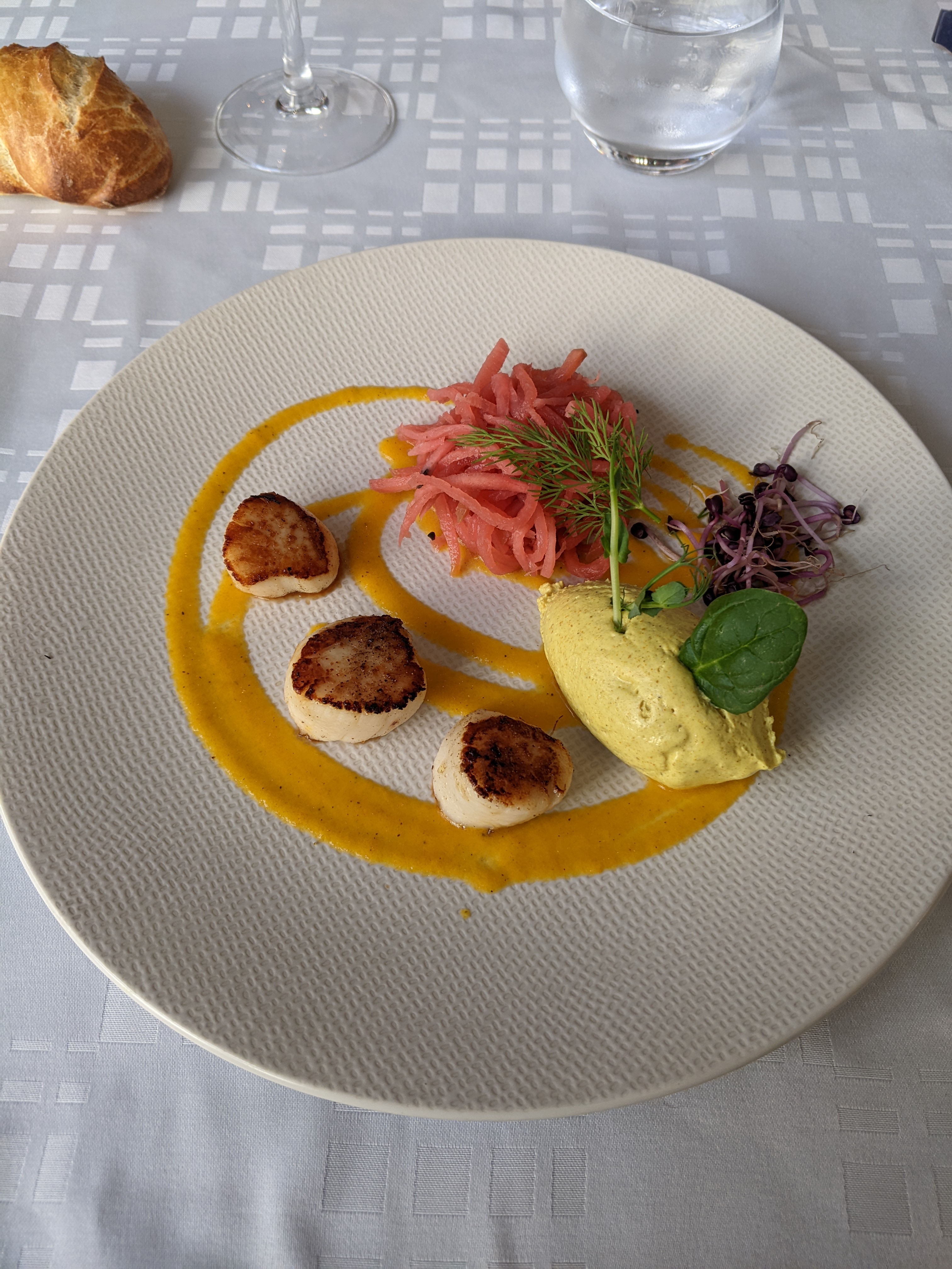 Bonne cuisine et belles assiettes Serveur très discret Bonne adresse Peut-être essuyer les verres pour enlever toutes les traces de calcaires avant la mise en place sur la table rendrai celle-ci encore plus jolie