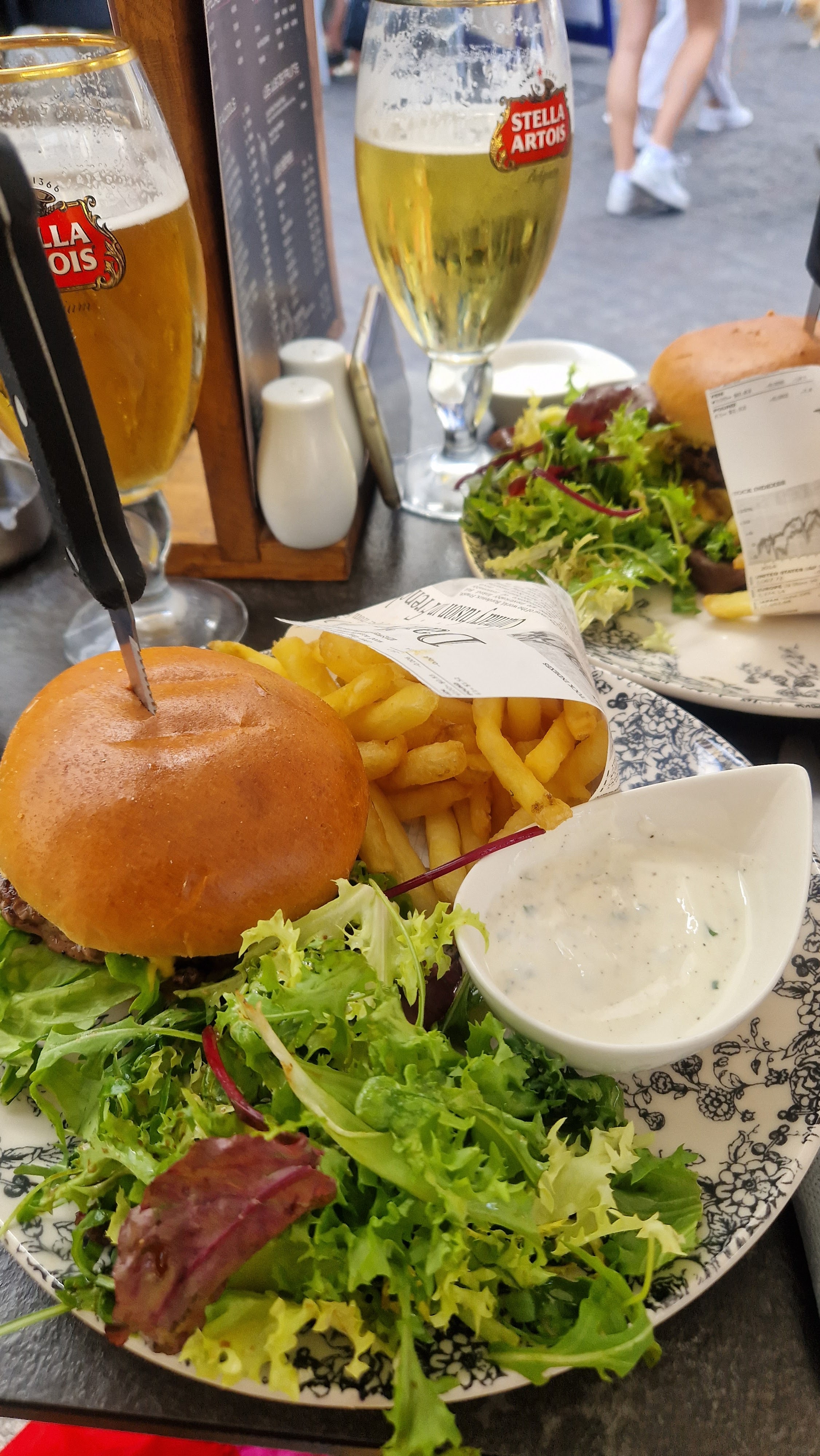 Nous nous sommes assis ici sur la place et avons déjeuné. Burger avec frites et salade. C'était savoureux et le prix était correct à 13 euros. C'est très agréable de s'asseoir. Nous pouvons le recommander.