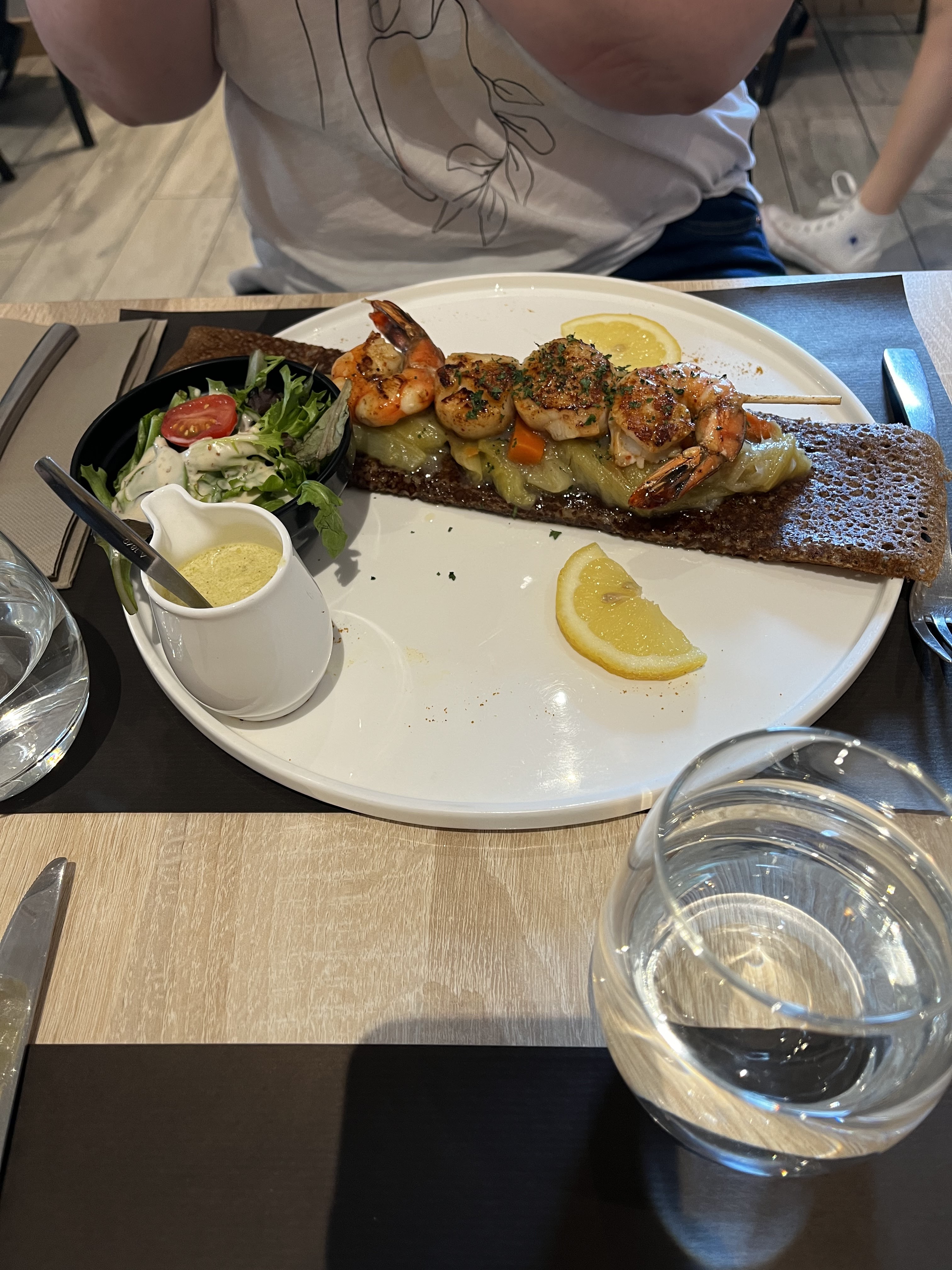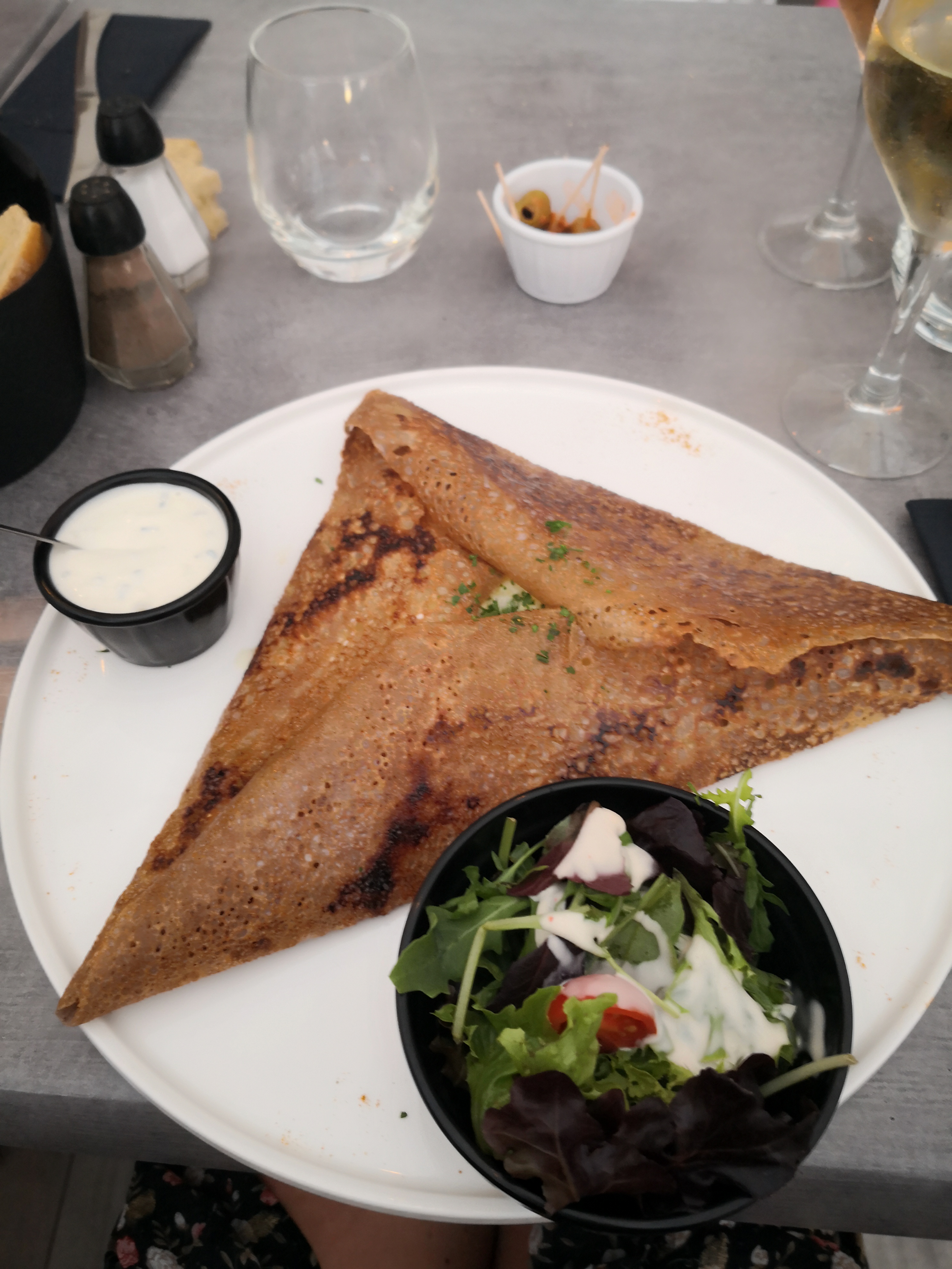Déjeuner en famille début août avec petits enfants et grands parents, tout le monde étaient ravis ! L'espace du restaurant est grand et on se sent à l'aise. C'est lumineux et finalement assez calme malgré le monde. Accueil simple, sans flagornerie. Notre petit garçon de 3 ans a très soif et déjà un peu faim. On nous sert rapidement un petit verre d'eau fraiche et du pain (frais aussi). Il peut maintenant attendre sa belle assiette de frite ! Merci. La poussette, ici, ça ne dérange pas ? Non, super. Merci. Il faut changer notre bébé de 4 mois : direction les toilettes équipées d'une table à langer. Bref, c'était parfait avec les enfants. Malgré la taille de l'endroit et la variété des plats proposés sur la carte (si ont compte toutes les propositions de galettes), les mets sont assez raffinés, le poissons est frais et parfaitement cuits, c'est copieux. Bref, la qualité est au rendez-vous. La rapidité du service n'est pas une priorité pour nous, encore plus quand nous sommes en vacances et que nous sommes bien installé dans un endroit comme celui-ci (et notez que l'attente dans un restaurant est plutôt gage de qualité, il faut un peu de temps pour préparer une belle et bonne assiette). Pour autant, le service n'est pas particulièrement lent : les excellentes crêpes desserts sont arrivées très vite, et on les a mangé encore plus vite 😋 Miam !