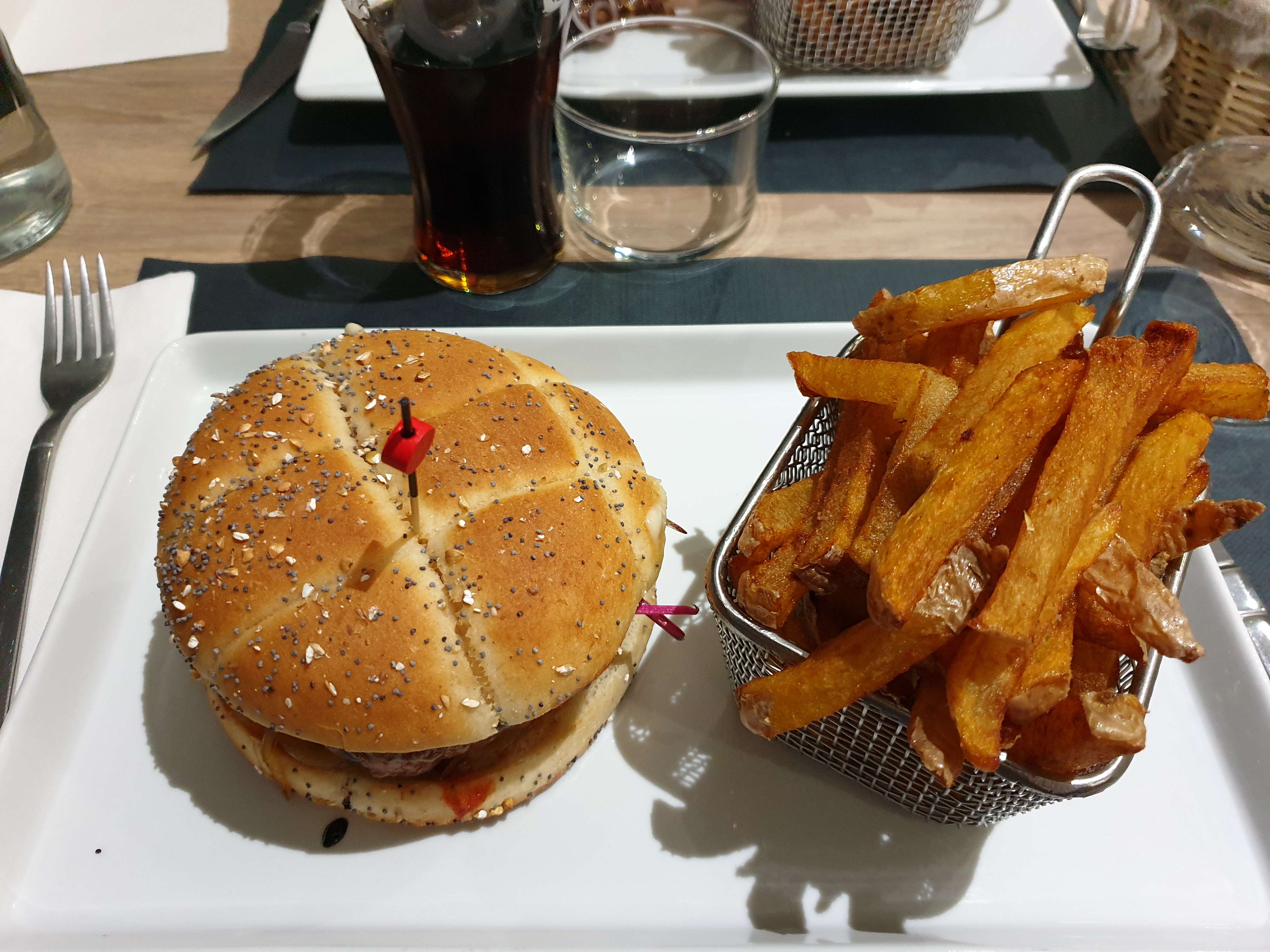 J'adore le concept et l'initiative de ce restaurateur qui s'est installé dans ce petit village un peu désert et qui manque d'animation. Côté salle, c'est ambiance Bistrot, il manque encore un peu de décoration à mon gout. Côté assiette, les portions sont très généreuses, un plat suffira ! Hamburger, assiette canard, viande rouge, du classique mais bien assaisonné, bien cuisiné et surtout les produits sont frais donc c'est trè bon et le prix est raisonnable. J'ai moins aimé le cadre, ça manque de lumière dans la salle et ça manque également d'une belle terrasse en extérieur.