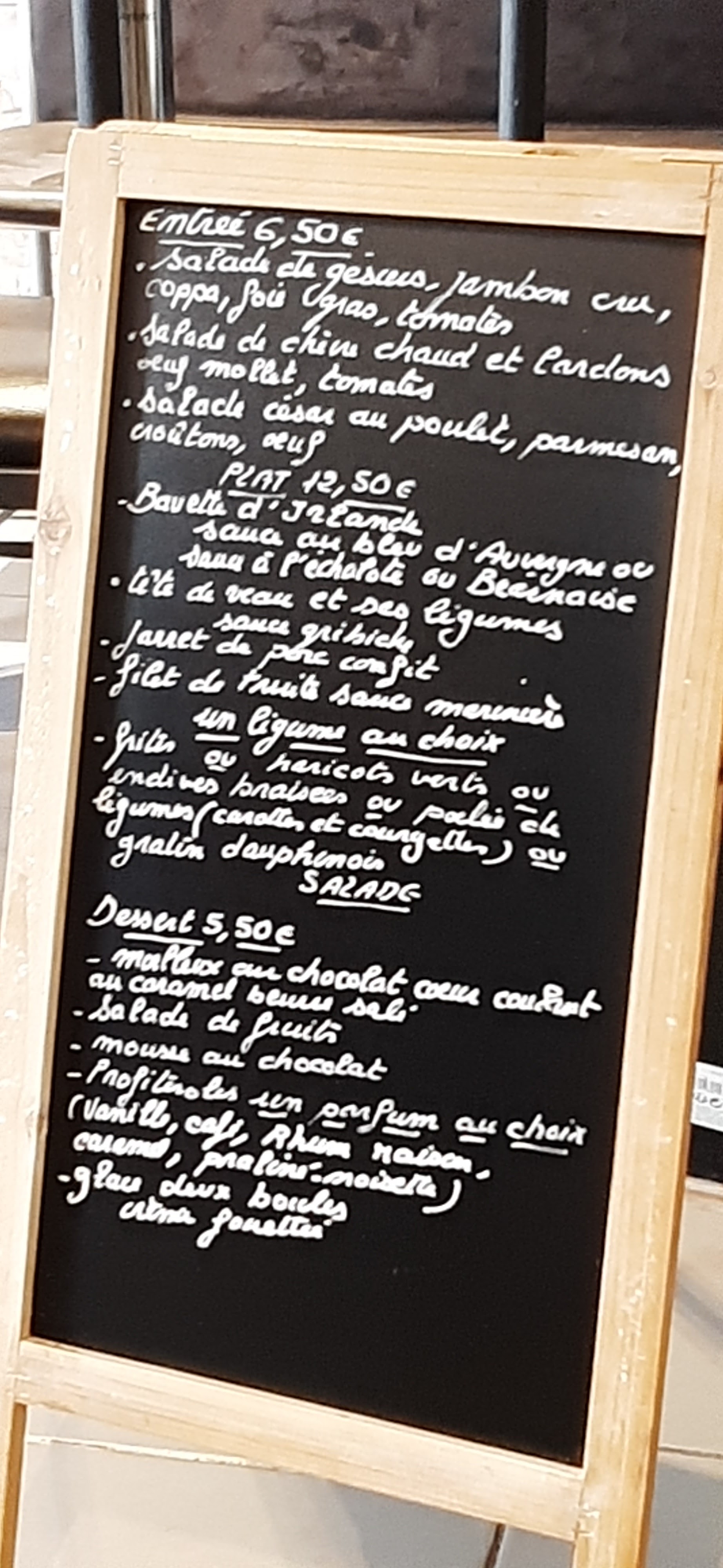 Restaurant de bonne qualité avec des produits frais et préparés maison. Pas de menu le dimanche, ce qui est regrettable. 4,5 euros pour les entrées et les desserts, 10,50 euros pour les plats, 6 euros pour les cafés gourmands.