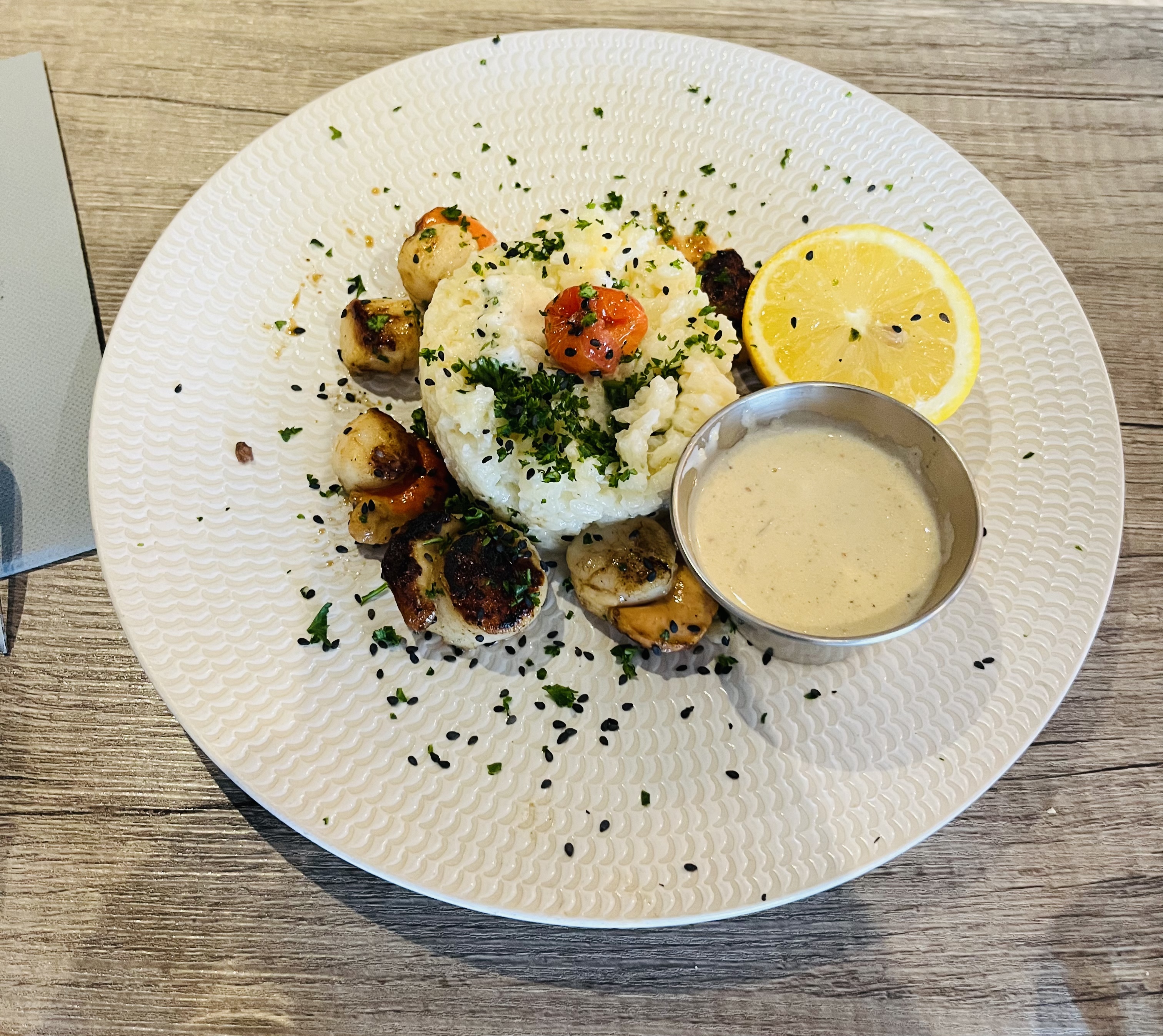 Bel endroit que je recommande, gambas citronnée sauce à l'aneth... Un régal tout comme le mini welch revisité