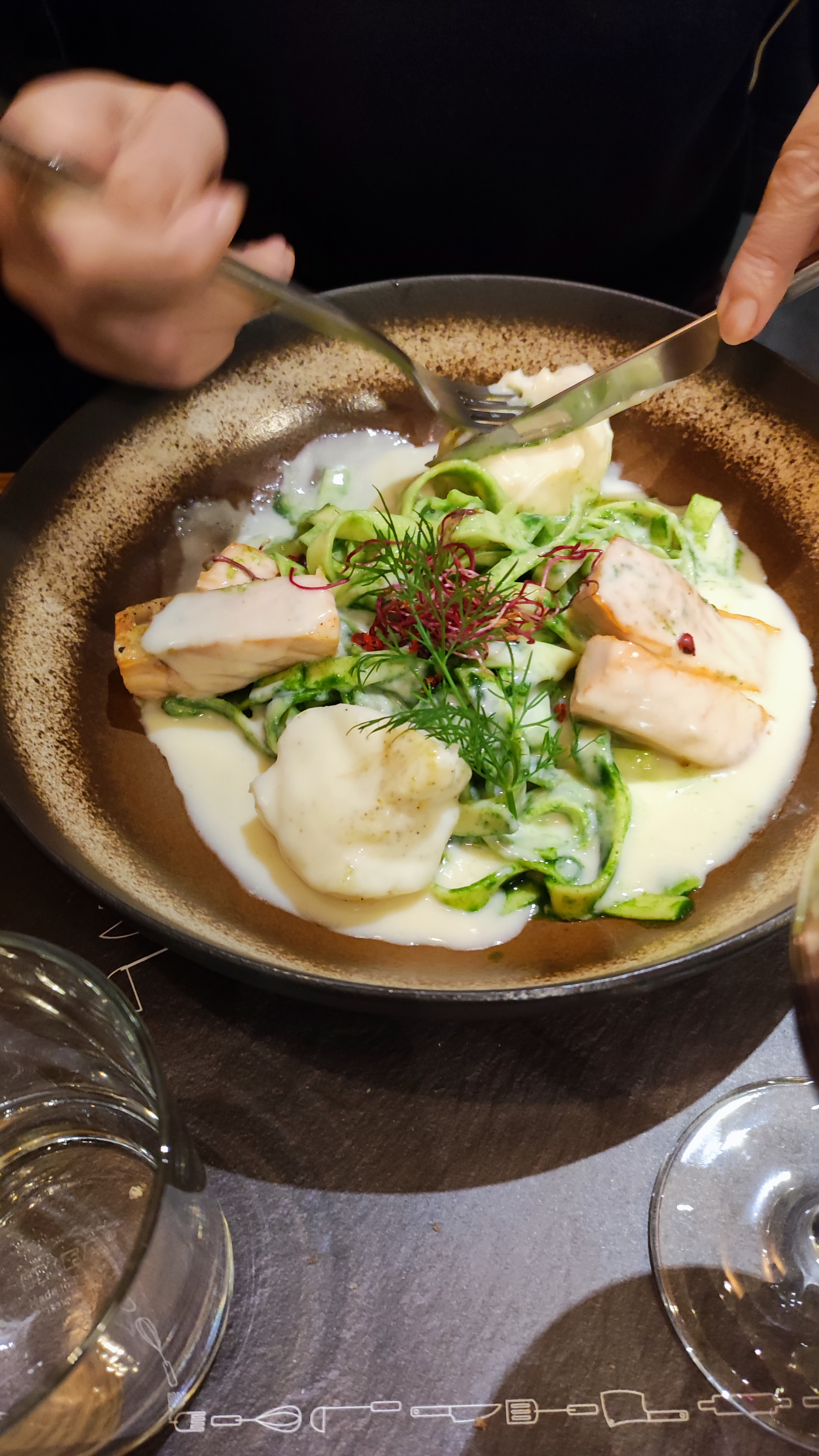 On y mange bien mais le poisson était pas assez cuit on a dû retourner l’assiette, les quantités un peu maigre, mousseline de courgettes vraiment fade, prix assez élevé quand même et musique pas terrible