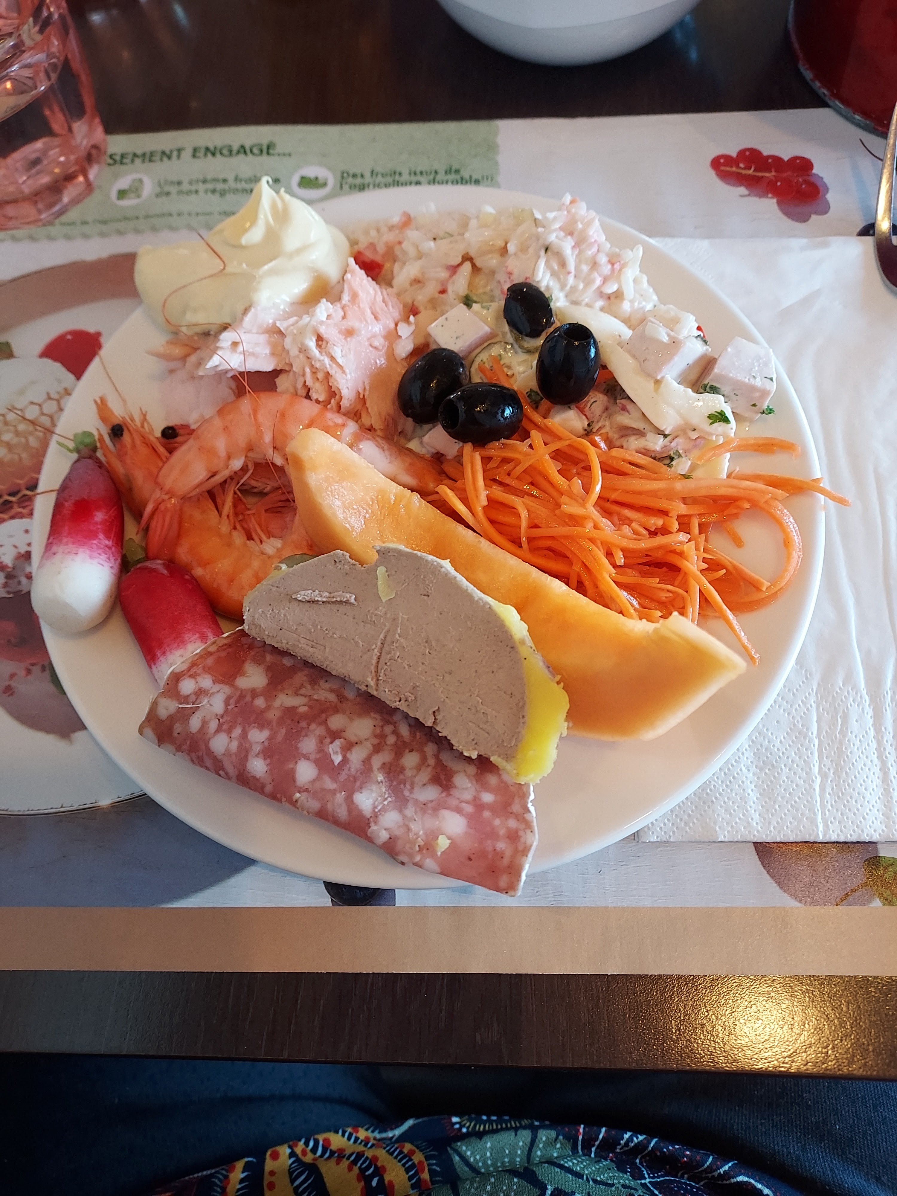 Le buffet d'entrées comprend non seulement des salades mais aussi saumon, foie gras, crevettes ou bulots, tous les plats sont bons, plusieurs desserts faits maison, très bons. Des prix abordables, je recommande