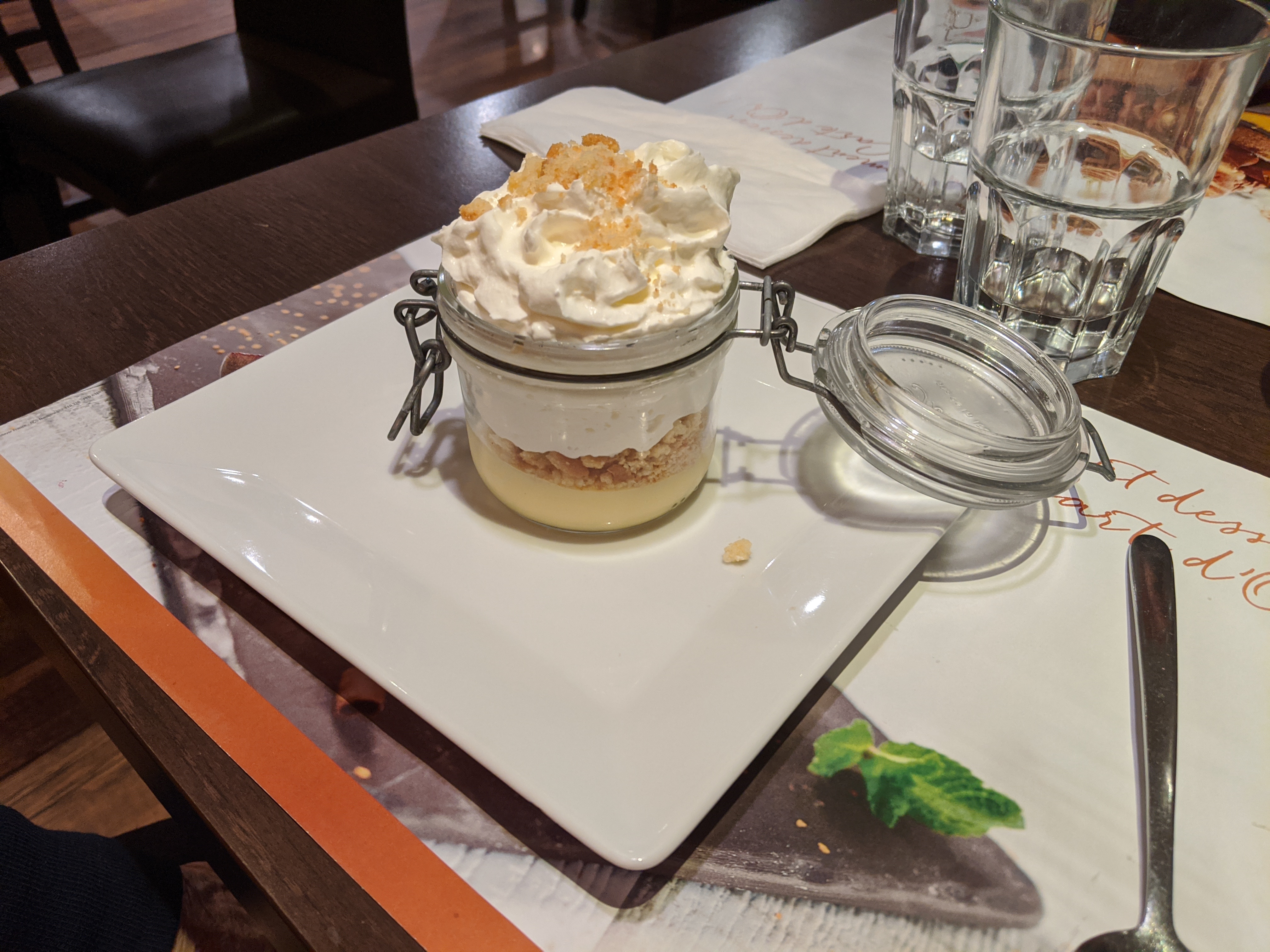 Bon prix pour la nourriture que vous obtenez. Vous avez la possibilité de prendre le buffet en entrée car ils proposent une grande variété d'entrées, allant des salades à la rilette, en passant par les tartinades et le pâté de saumon, etc. Nous avions du fish and chips pour notre plat principal qui était incroyablement croustillant et les frites étaient long. En dessert, nous avons eu une profiterole et une mousse au chocolat maison. L'ambiance n'est pas des plus chaleureuses mais le service est très bon. Le serveur que nous avions était chaleureux, dynamique et accueillant.