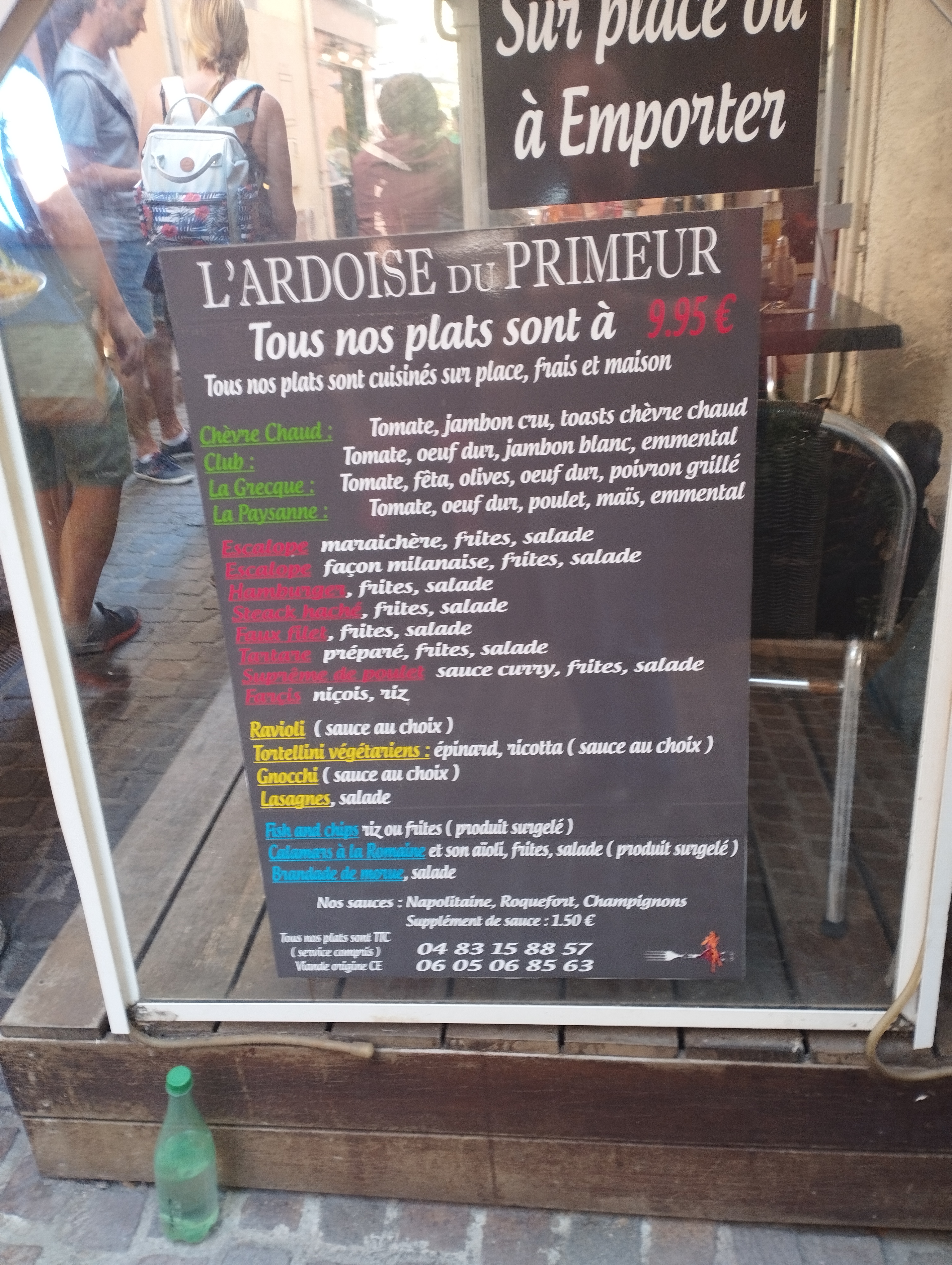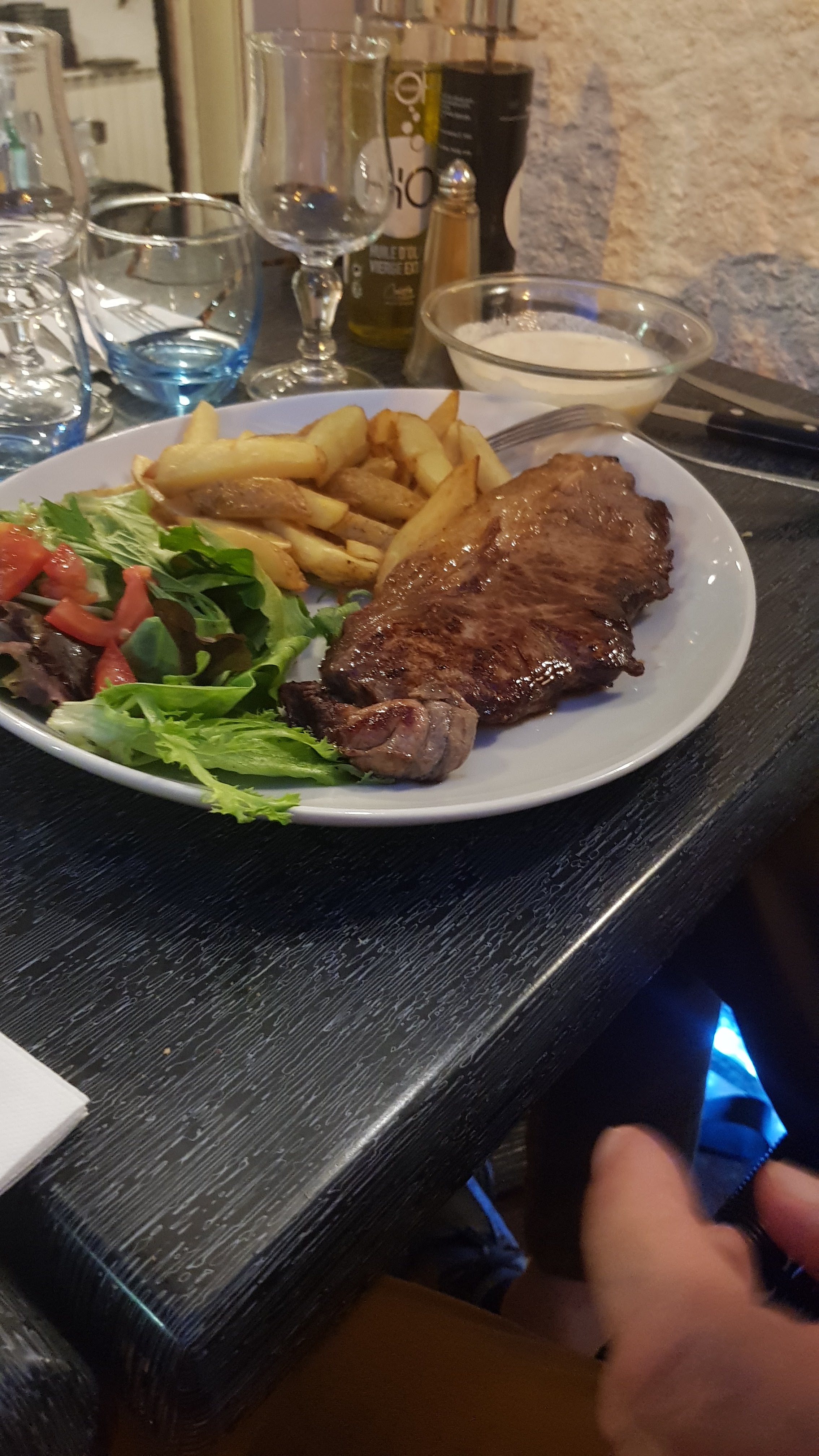 Très bon rapport qualité prix ! Tous les plats sont à 9,95 € comme par exemple faux filet (énorme), pourtant je mange bien, frites (maison) excellentes, puis salade ... Pas de dessert, nous avions bien mangé ! Accompagné pour moi par un panaché ! Total: 13,45 € Le personnel masculin y est sympa, nous y retournerons bientôt. Petites ruelles dans le vieux Mouans Sartoux que je ne connaissais pas, l'ambiance y est sympa ... Adresse à noter ... et merci pour votre accueil 😉🙂