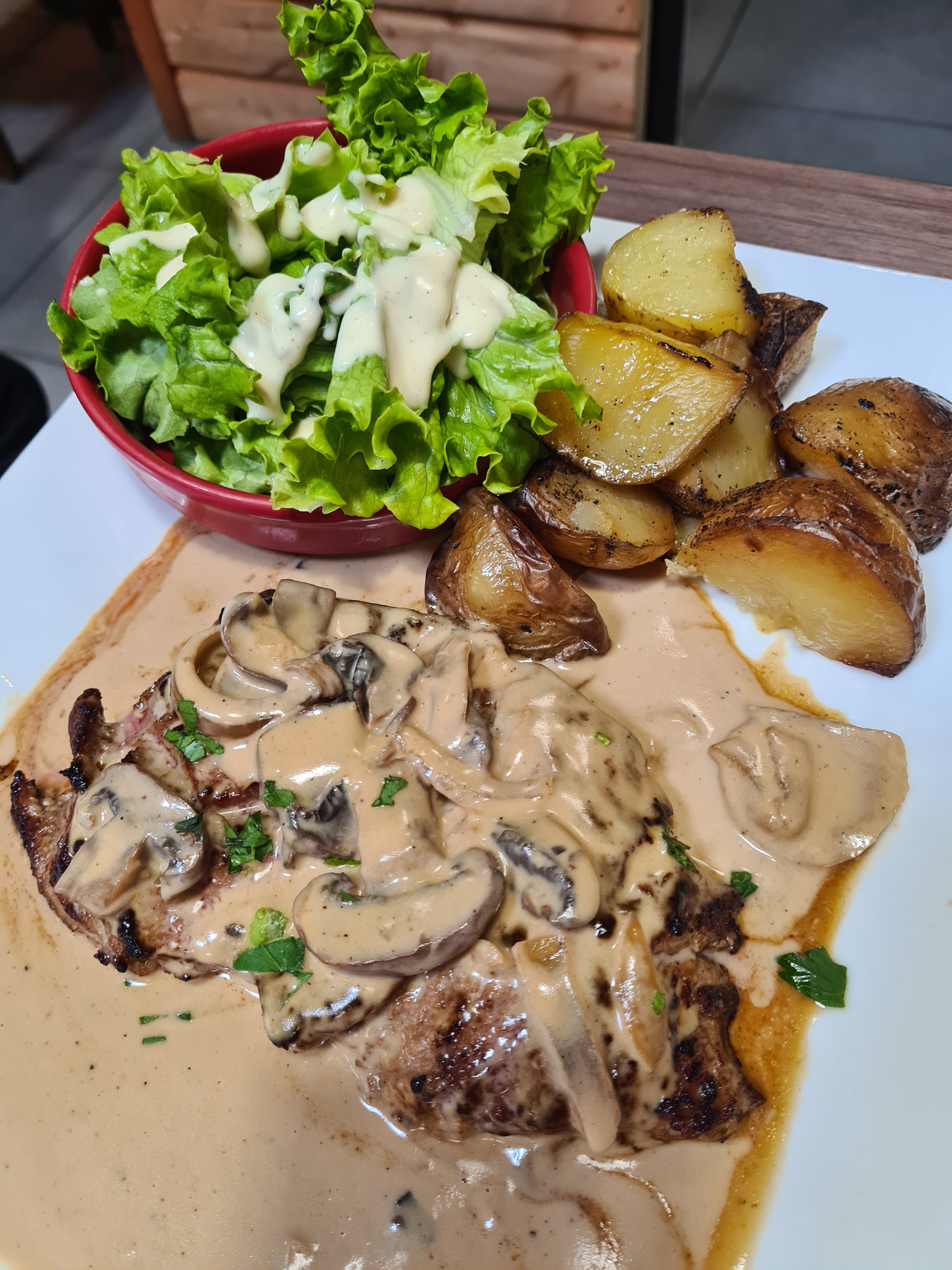 Accueil efficace, chaleureux, prise de commande rapide. Malgré que ce soit dans un hangar le lieu est bien aménagé. Les prix sont plus que corrects pour la qualité des plats proposés. Très satisfaite une belle découverte lors de notre séjour. Pour ce qui est du plat en photo, pain style croissant donc digeste, frites maison, steack épais, cuisson respectée et de qualité ! Merci