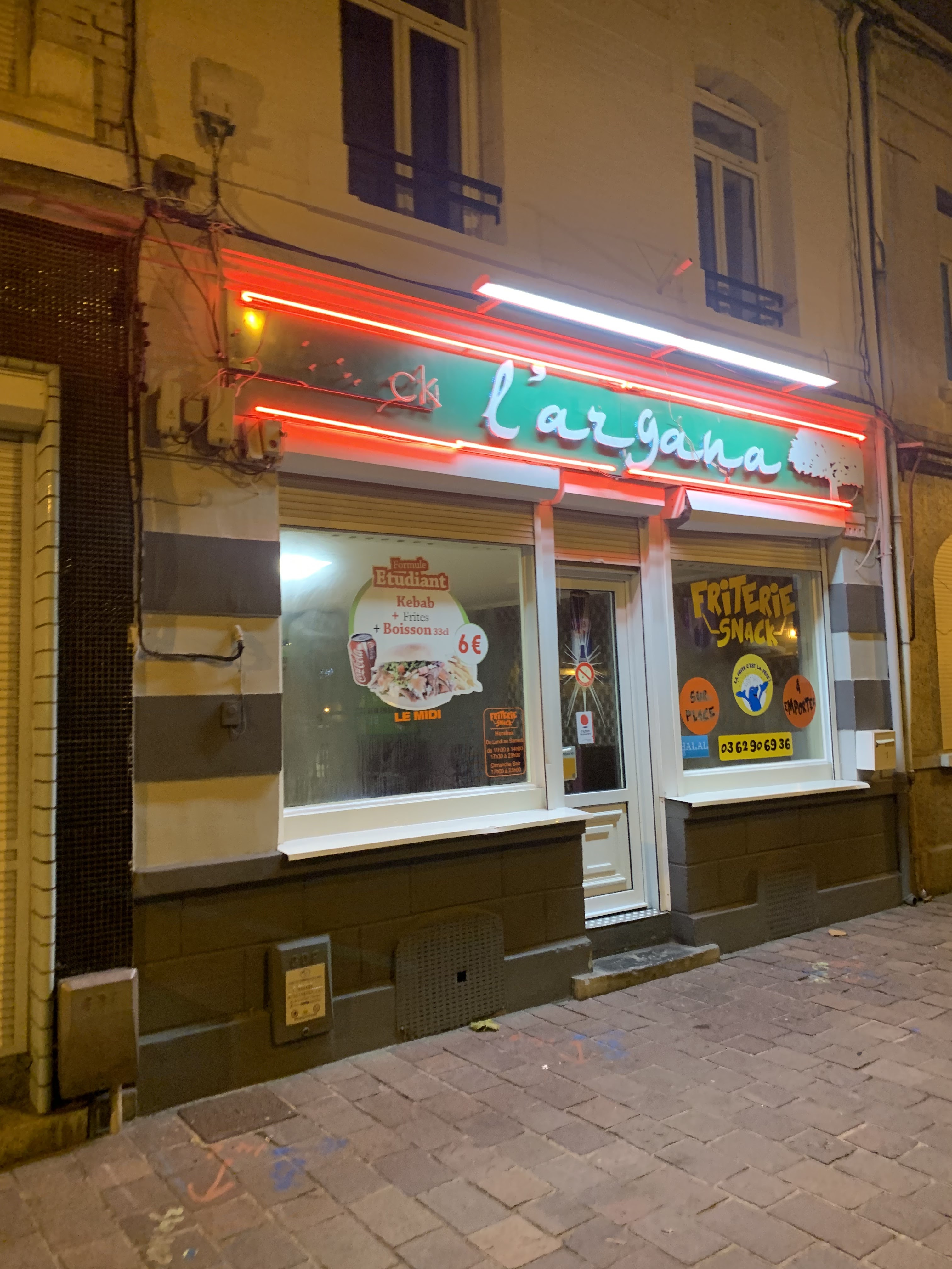 Après avoir fait tout les kebabs de Lens (et d'autres villes), l'Argana est de loin le meilleur. Le cuisinier est souriant, serviable et il n'hésite pas sur les portions. Tout est très bon, la viande n'a pas de gras dur.. les frites sont incroyables, elle sont grosses (tout le contraire des frites McDo), et assaisonné d'épices. Le prix est clairement le plus abordable de Lens et il y a pas meilleur qualité prix. Foncez sans hésiter ! (Et je n'ai pas été payé pour l'avis)