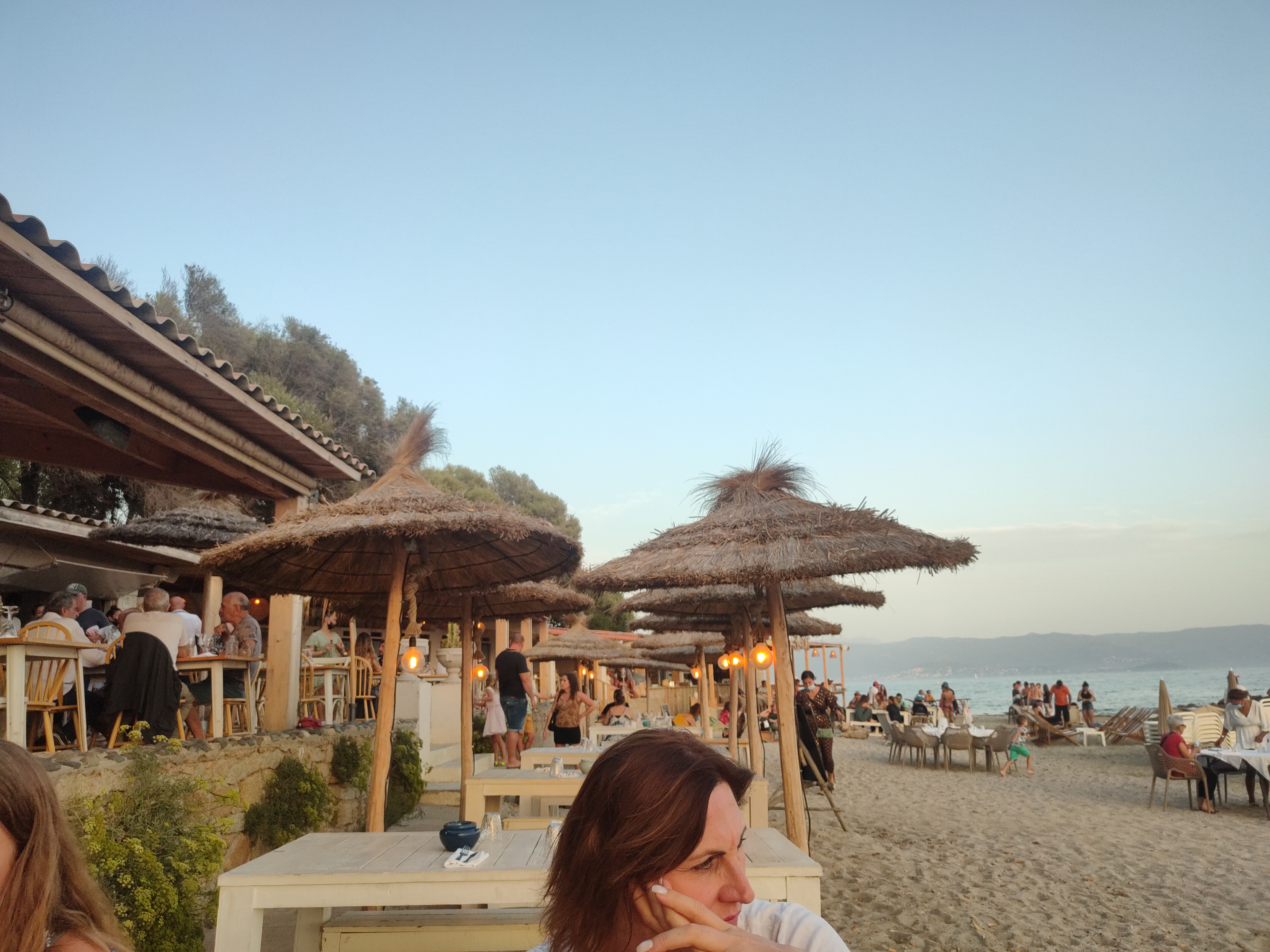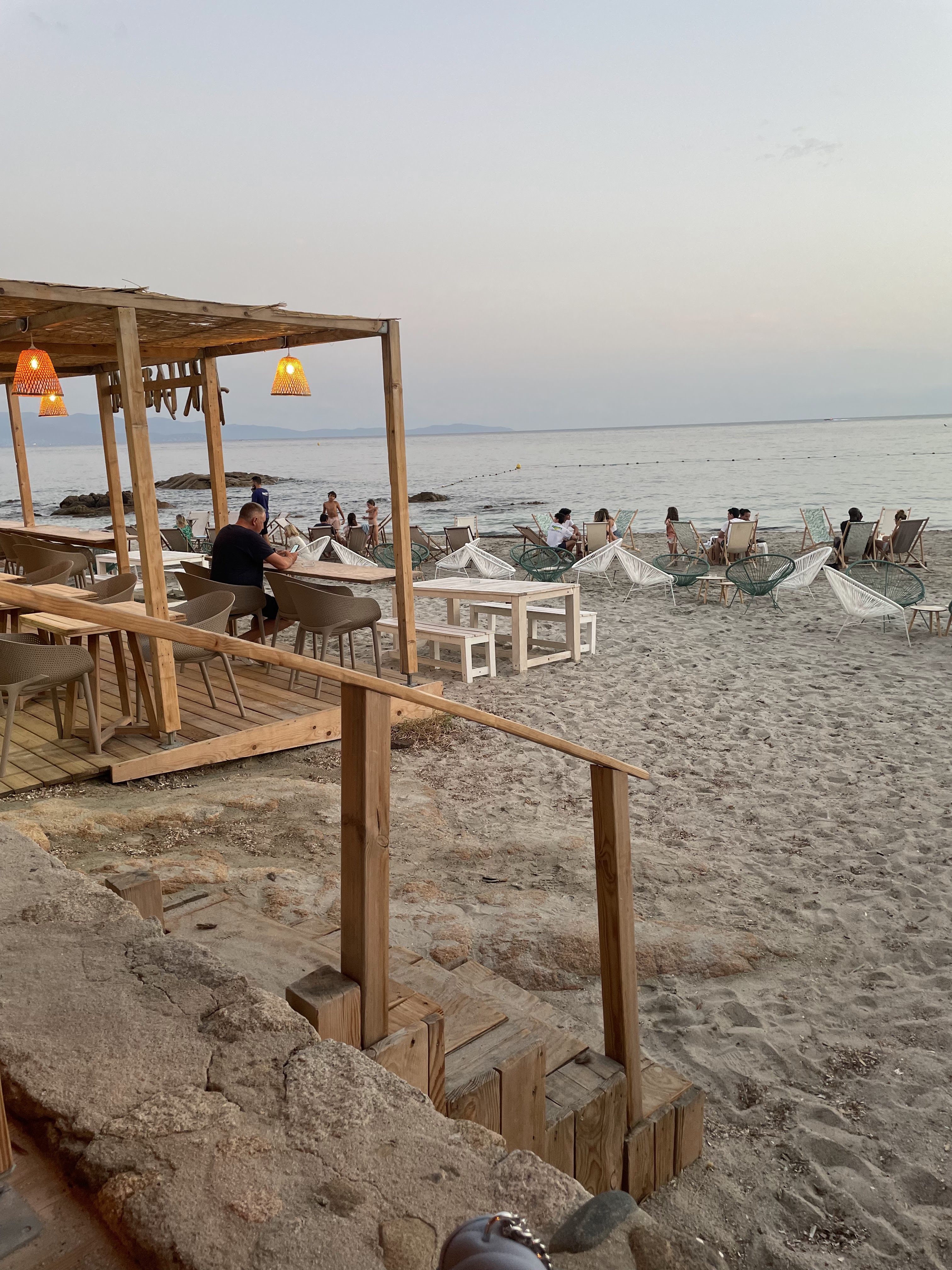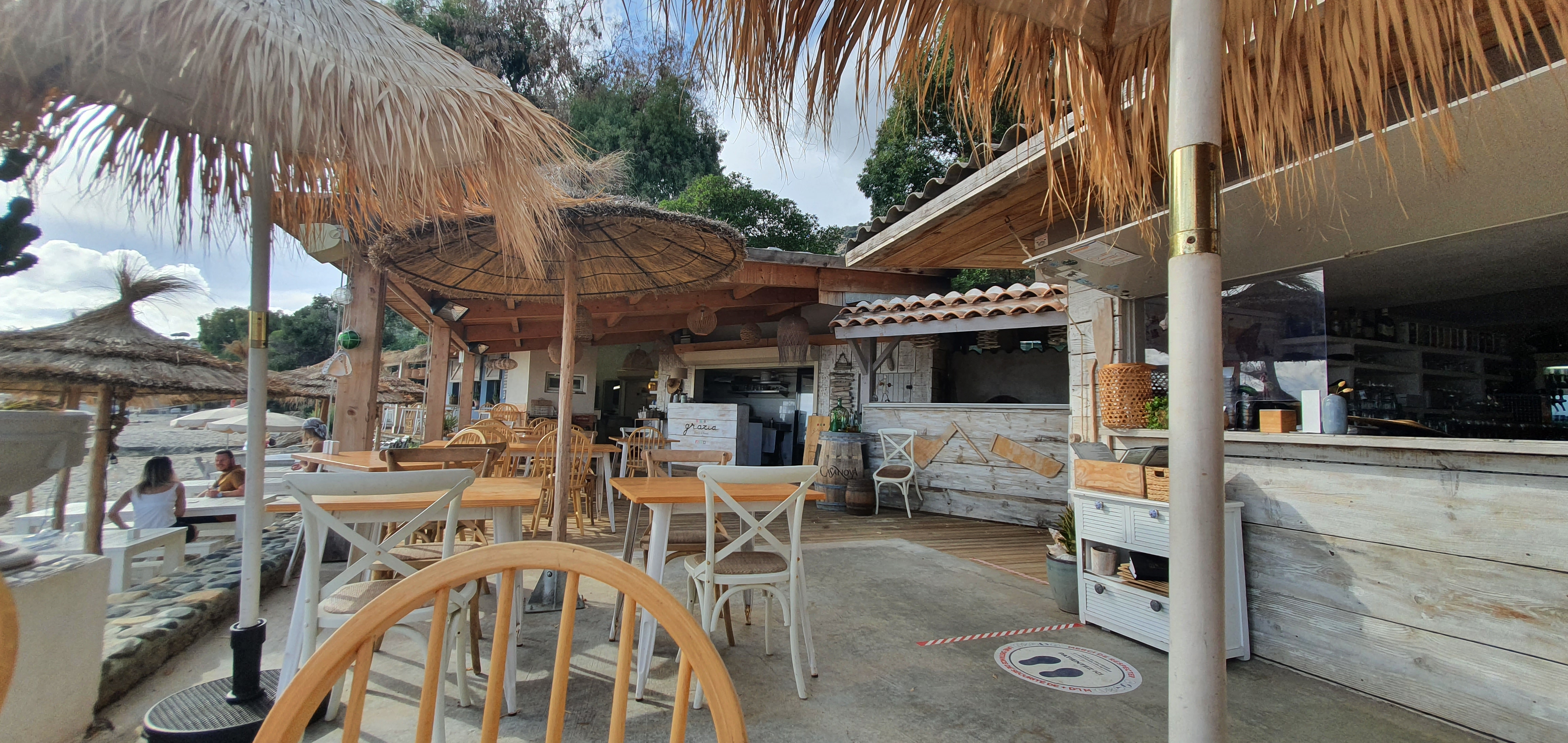 Un bel endroit où la vue est imprenable et une paillote où il ne manque rien transat parasol sable bar restaurant et même une pièce aménagée pour les enfants. Restauration sur place très correcte avec un service rapide