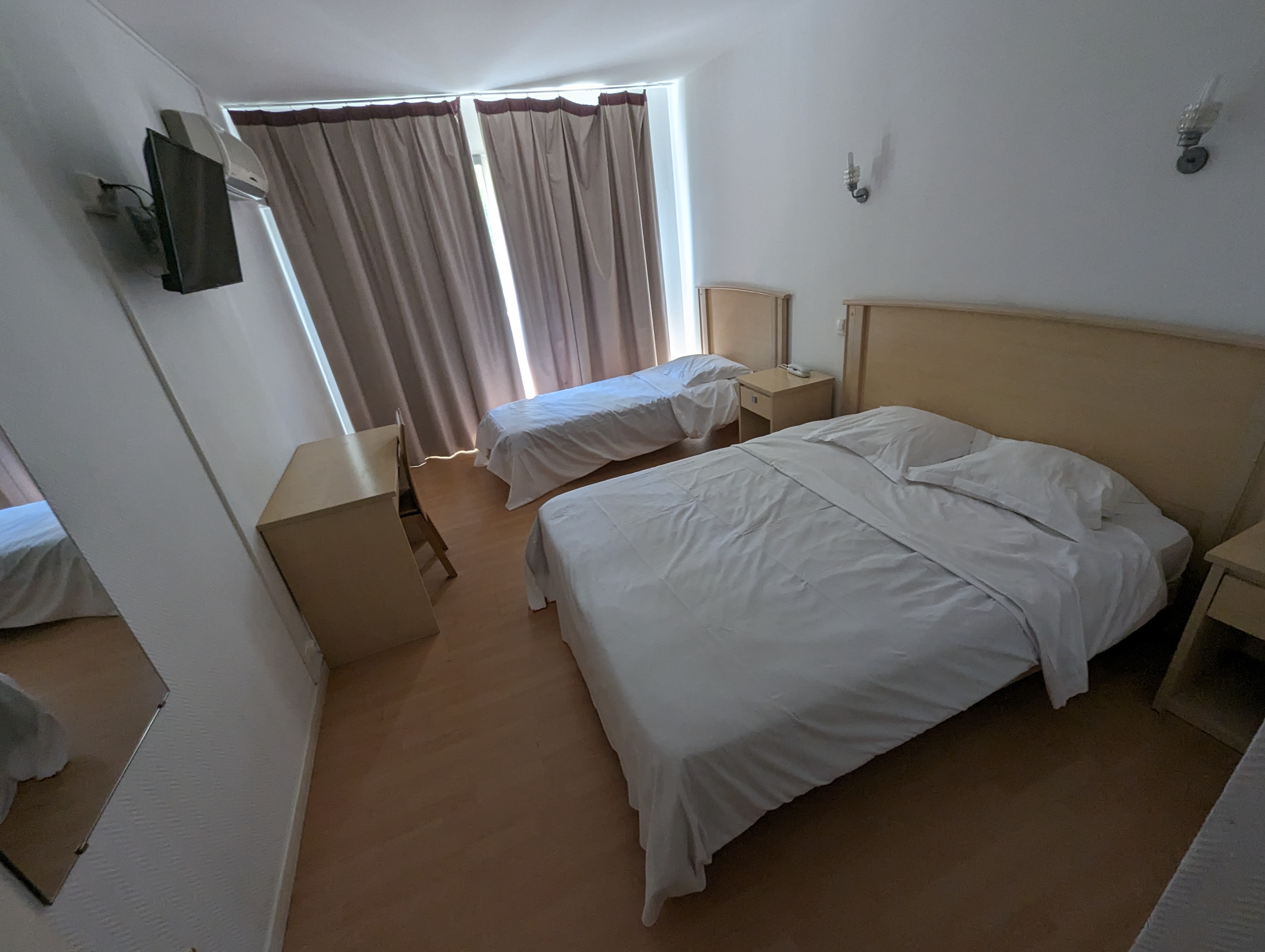 1ere chambre pas de clim literie nul et deco vielles 2eme chambre surclassé vue sur mer belle vue chambre vieille literie nul le petit. Dej 15e pas a volonté par contre il y a quand même de quoi faire point positif a l accueil une femme blonde aux yeux bleus super sympa heureusement